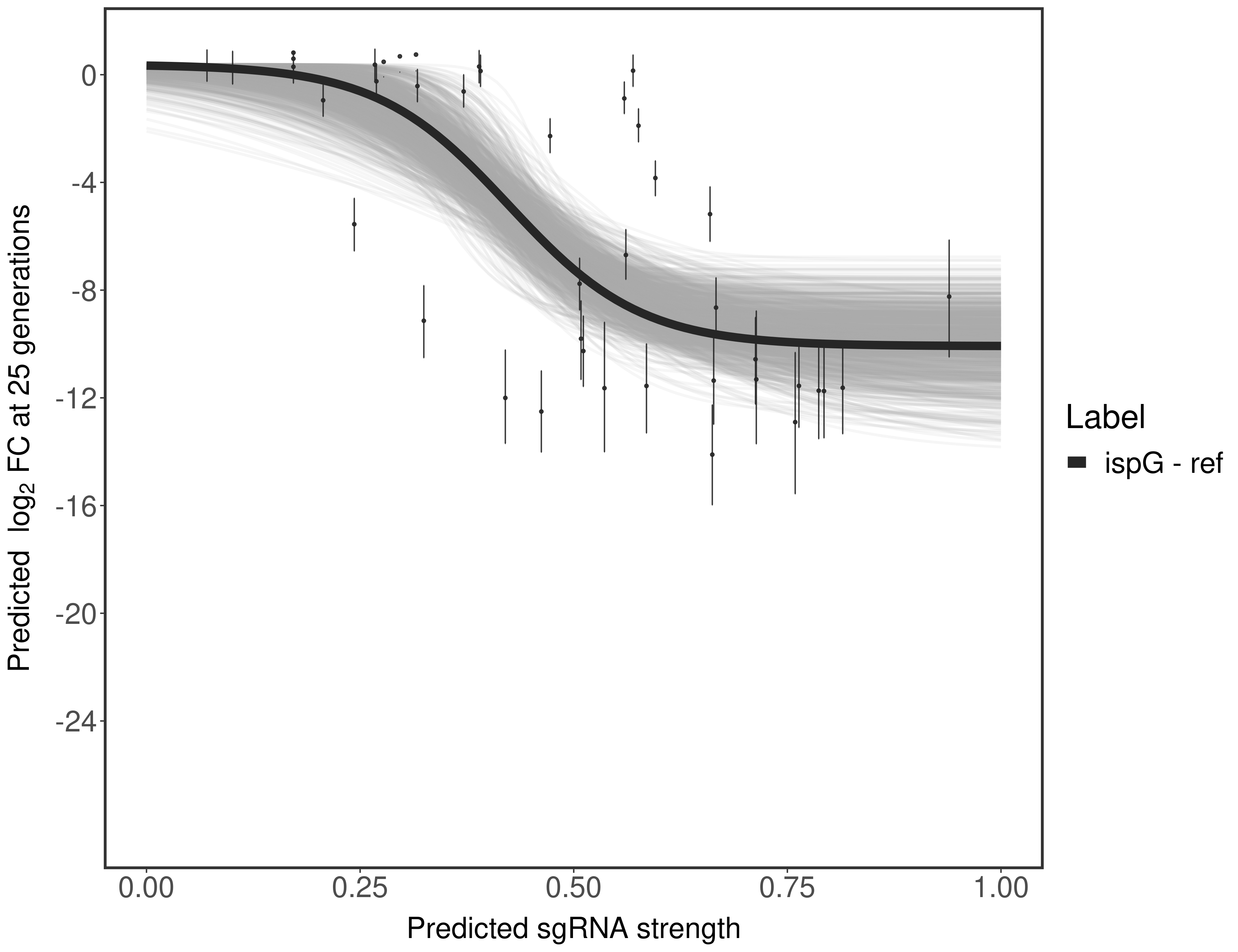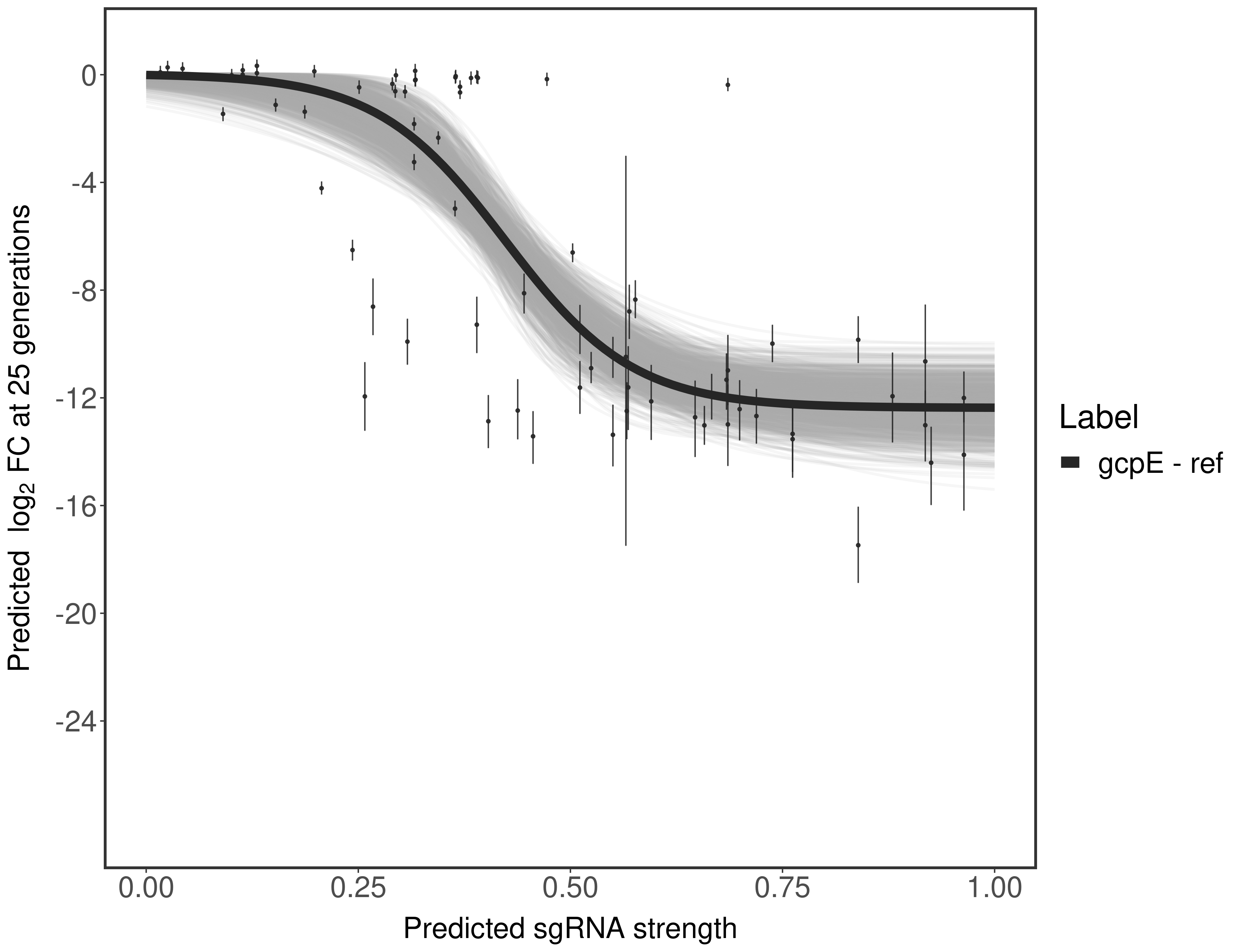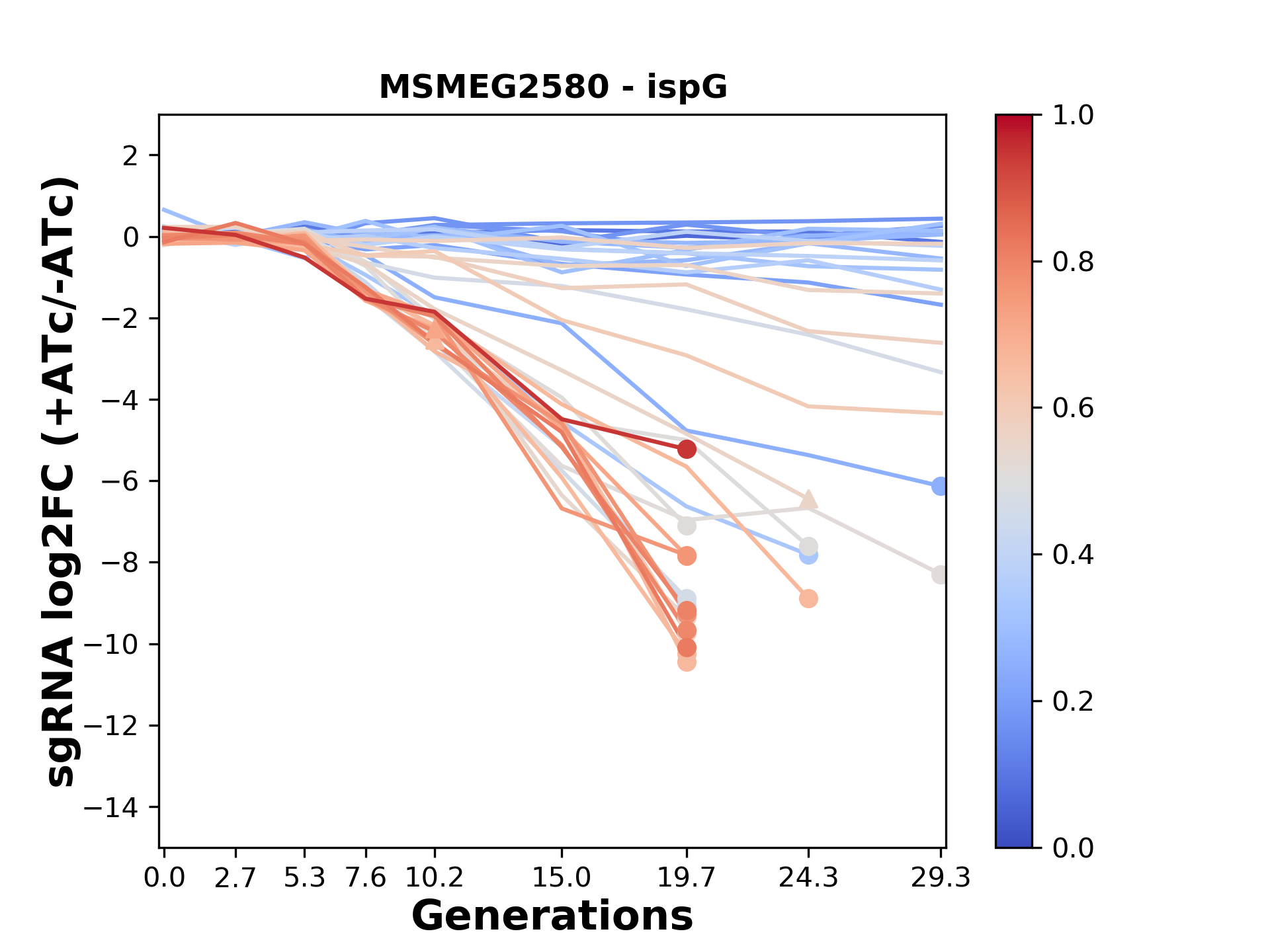 Here, we show sgRNA log2 fold-change values (L2FC) (plus versus minus ATc) over consecutive generations for sgRNAs targeting the gene you selected.