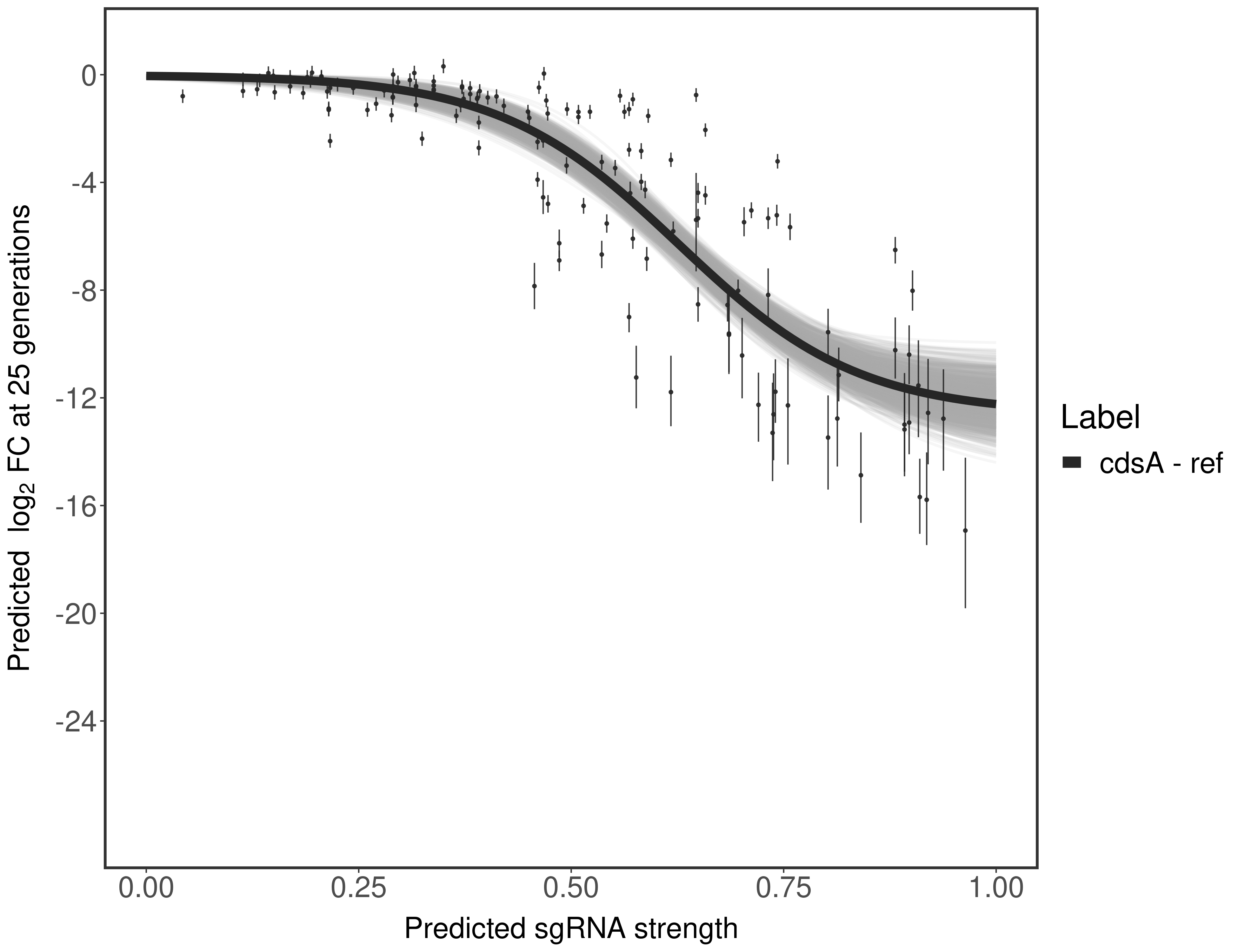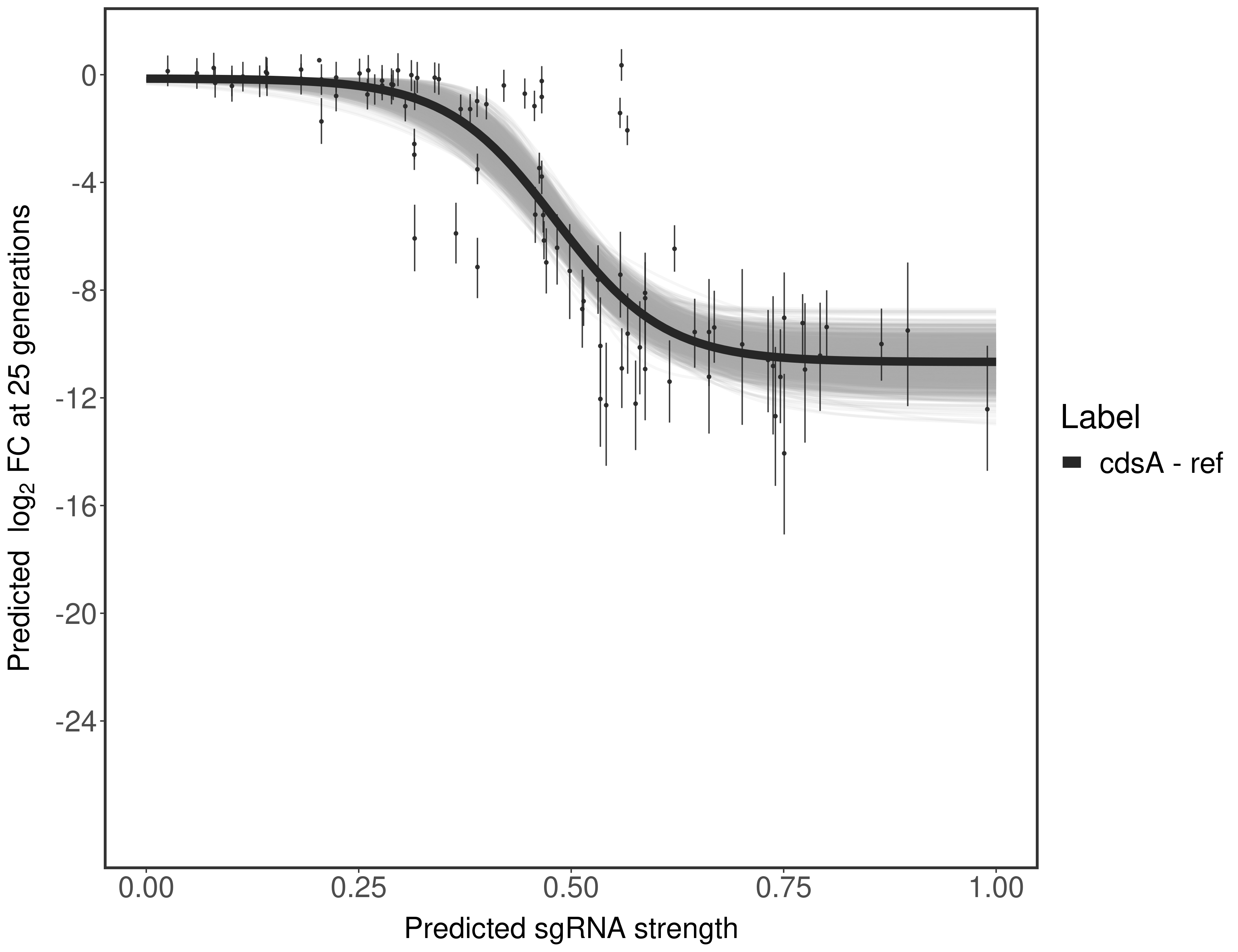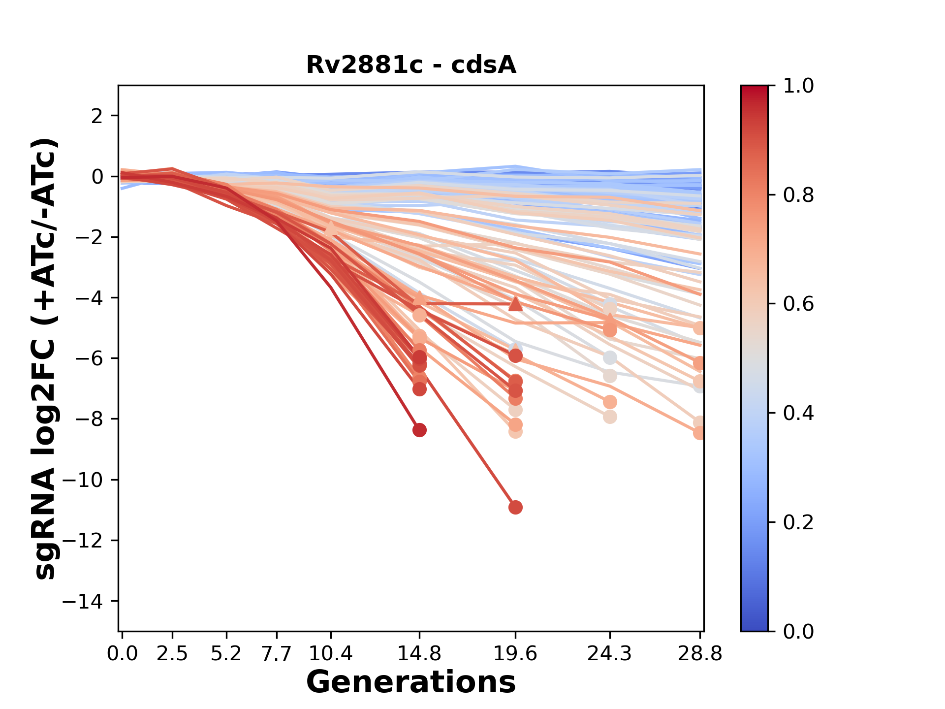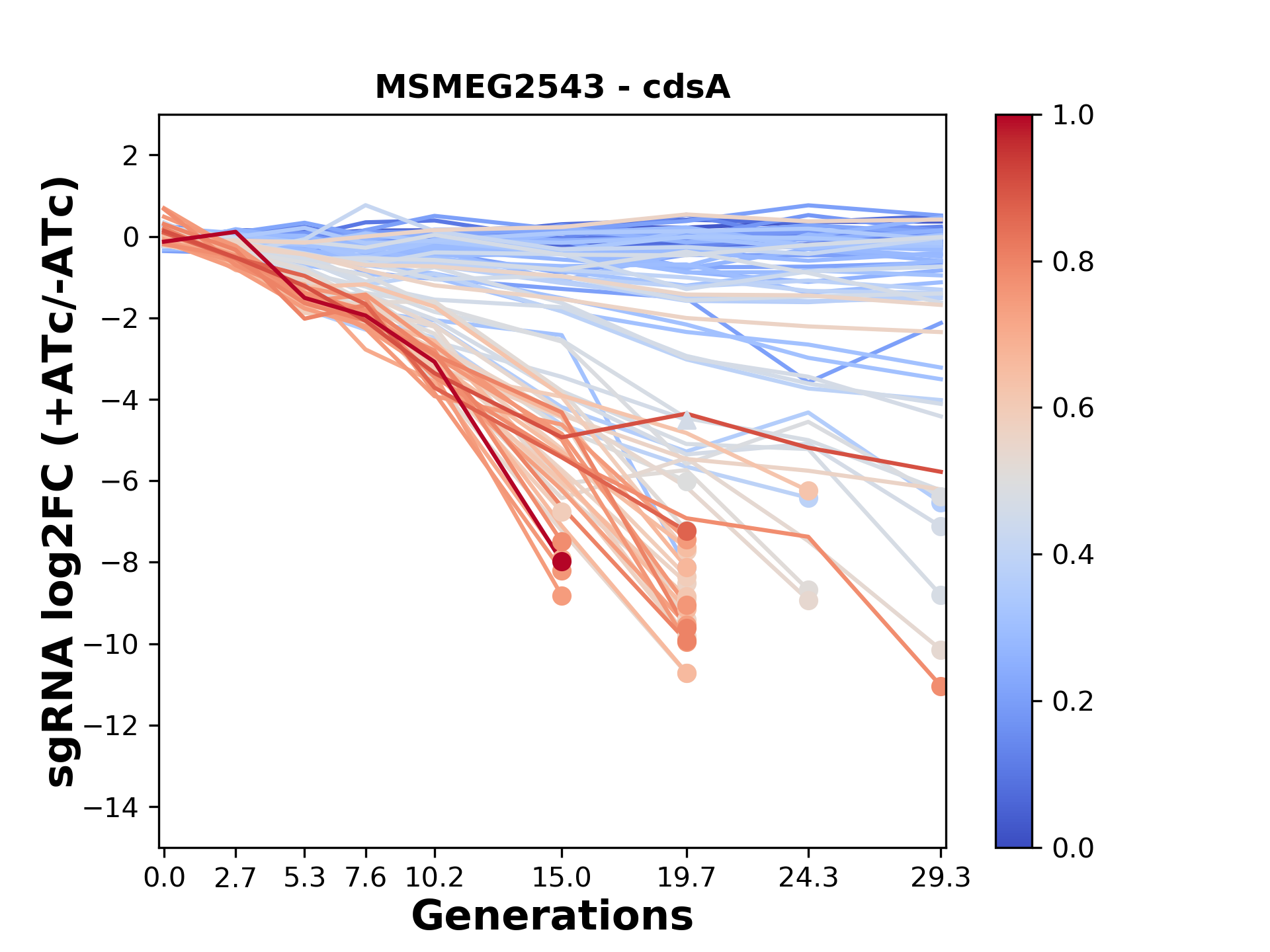Here, we show sgRNA log2 fold-change values (L2FC) (plus versus minus ATc) over consecutive generations for sgRNAs targeting the gene you selected.