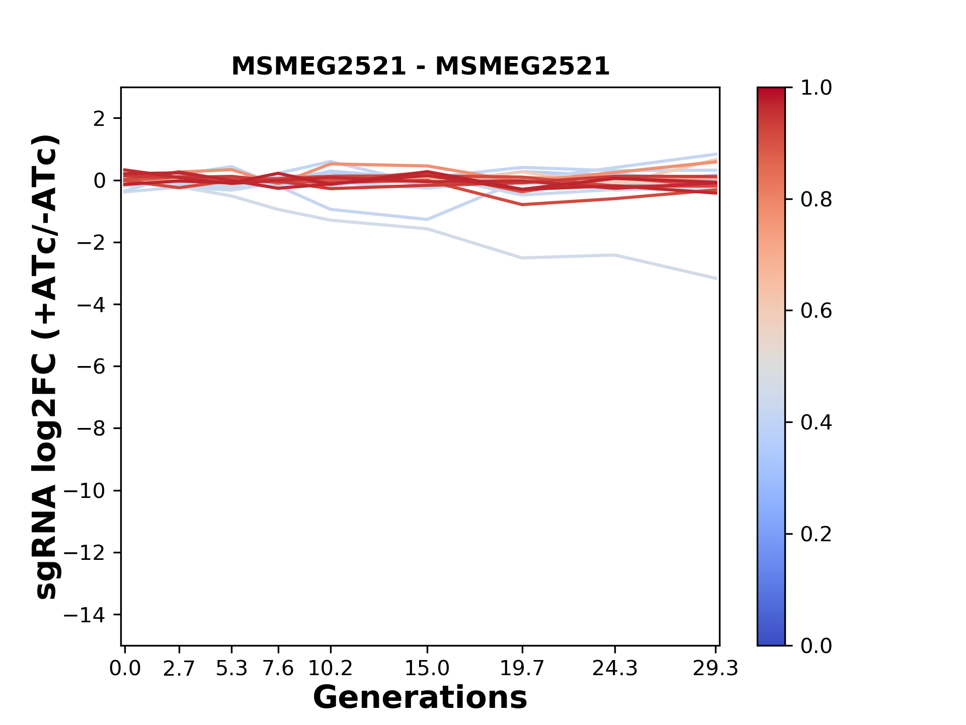 Here, we show sgRNA log2 fold-change values (L2FC) (plus versus minus ATc) over consecutive generations for sgRNAs targeting the gene you selected.