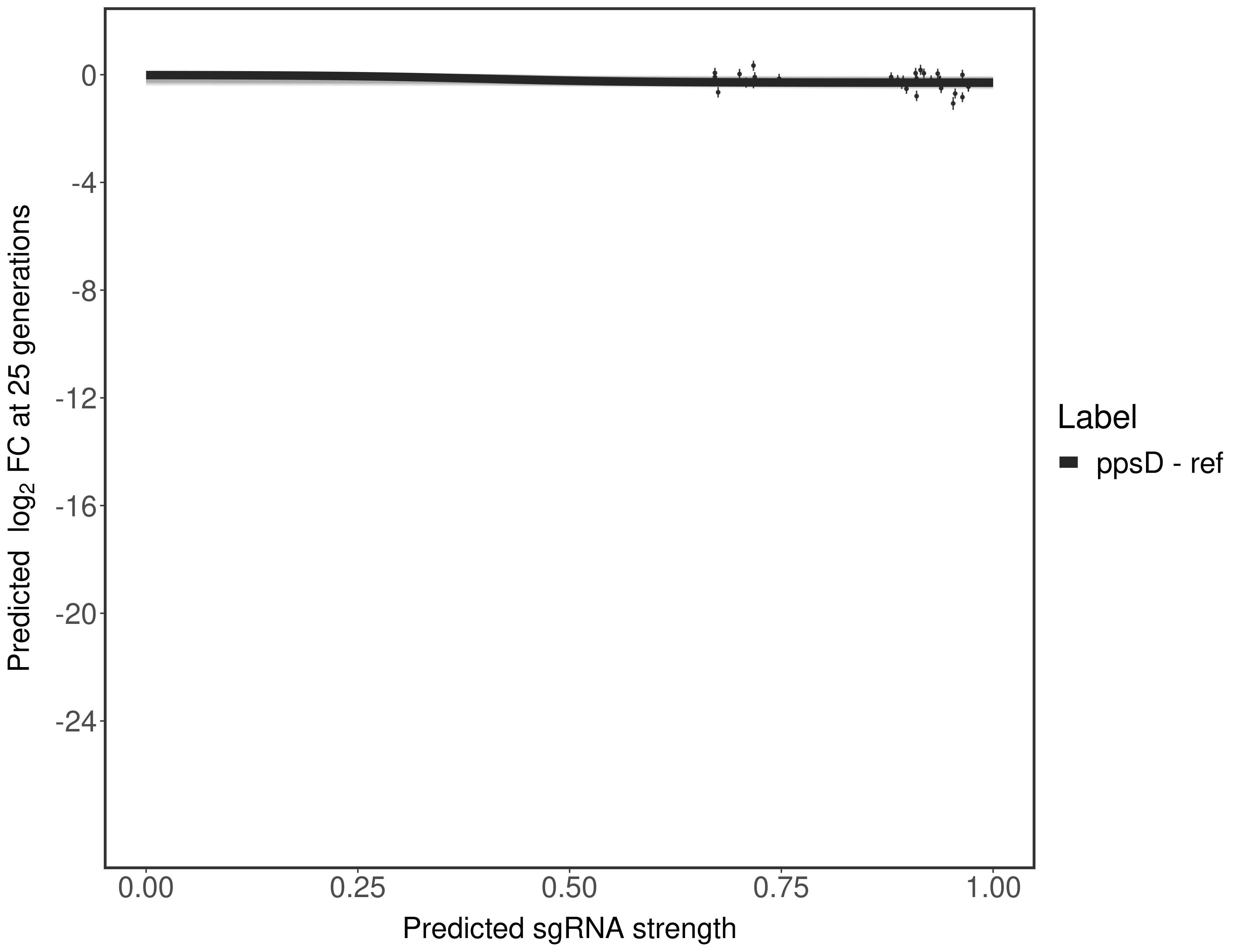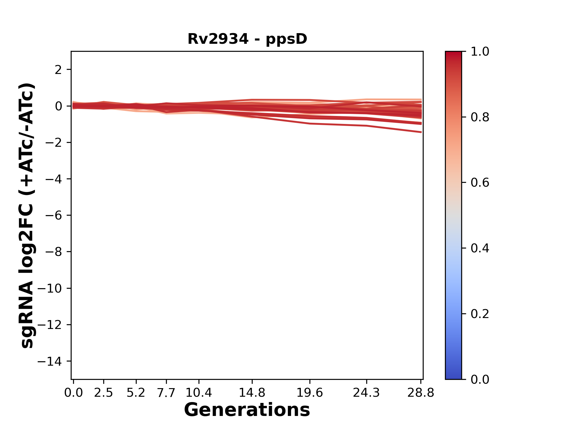 Here, we show sgRNA log2 fold-change values (L2FC) (plus versus minus ATc) over consecutive generations for sgRNAs targeting the gene you selected.