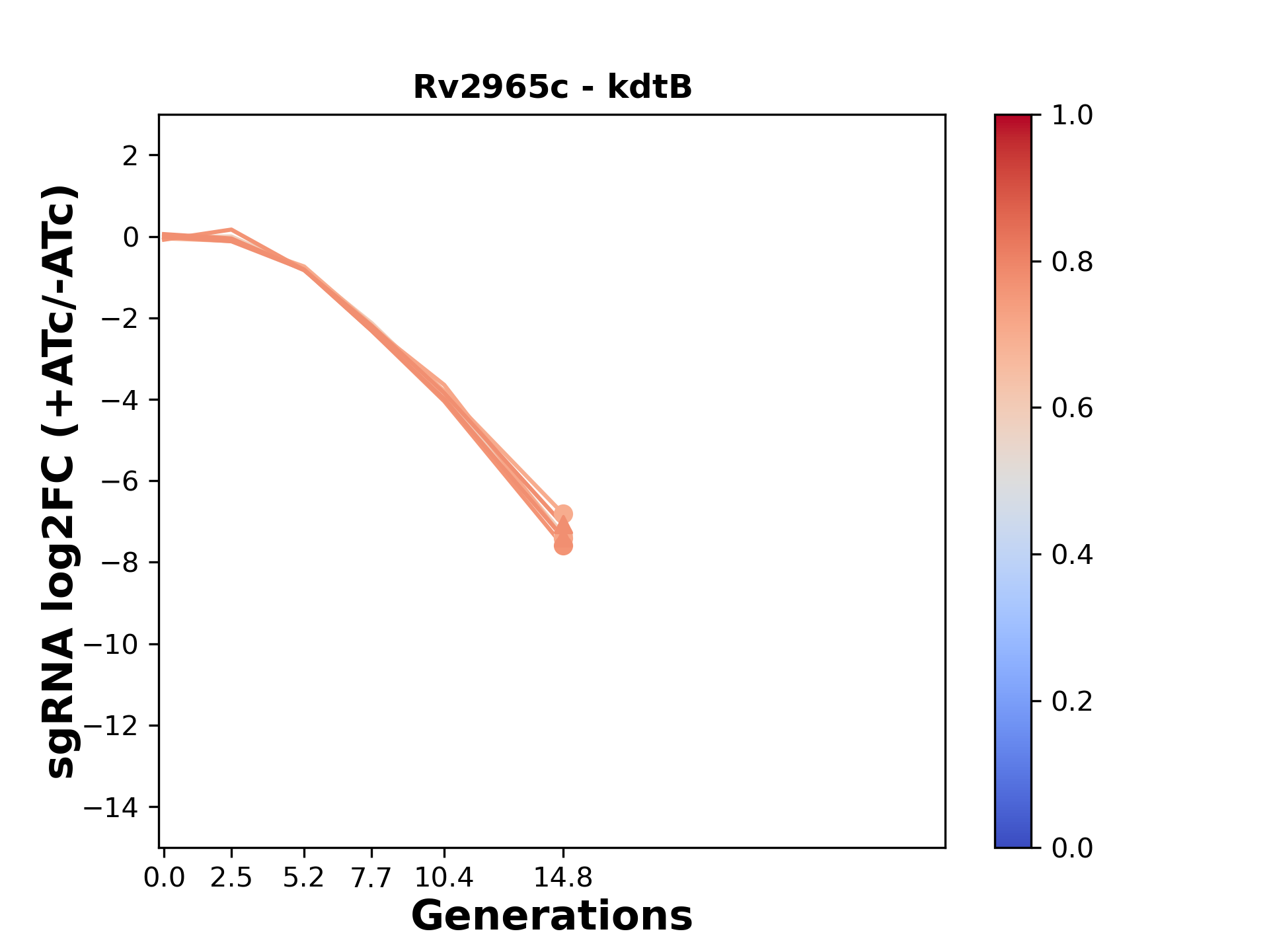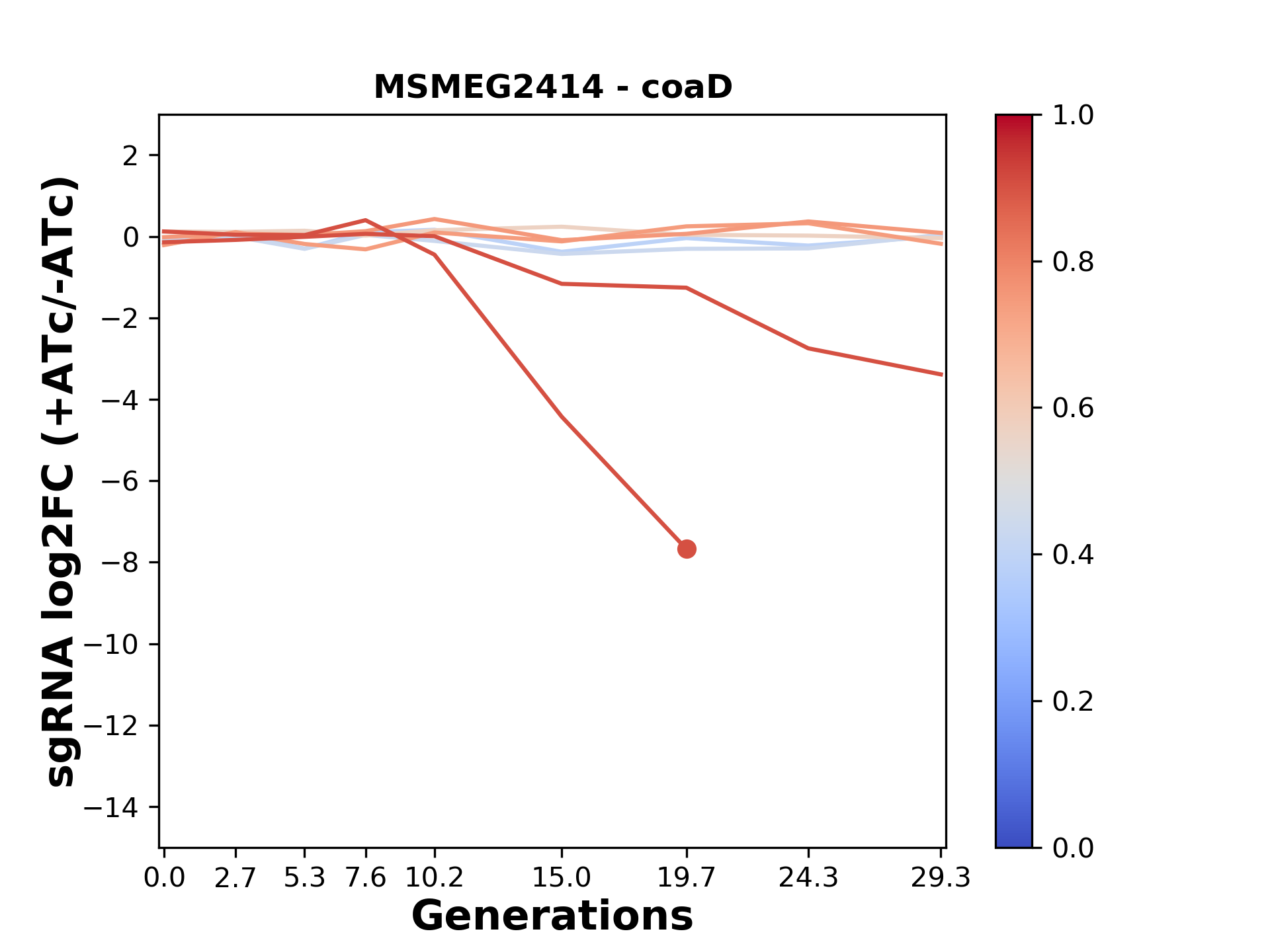 Here, we show sgRNA log2 fold-change values (L2FC) (plus versus minus ATc) over consecutive generations for sgRNAs targeting the gene you selected.