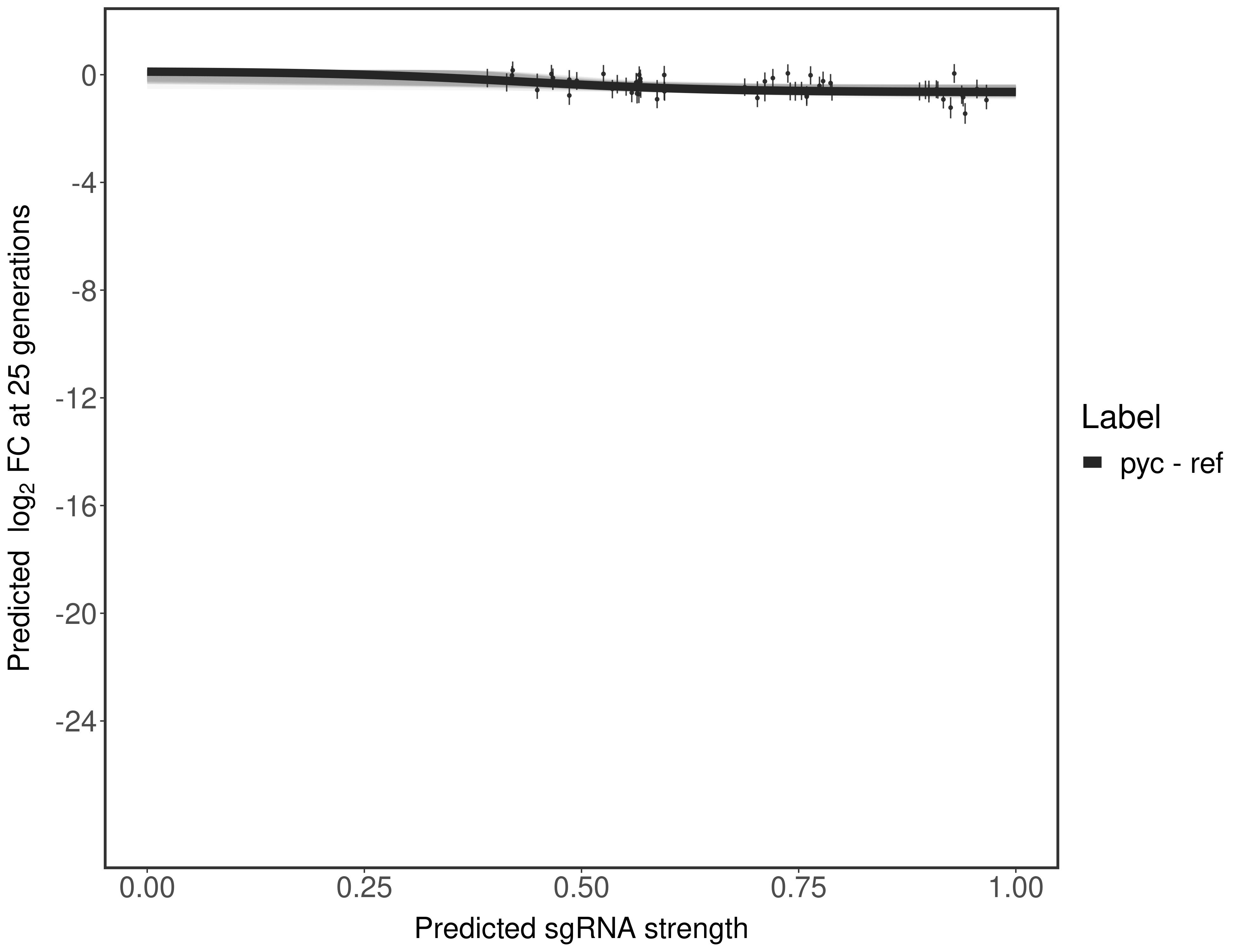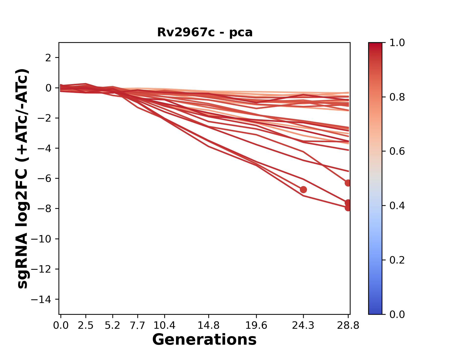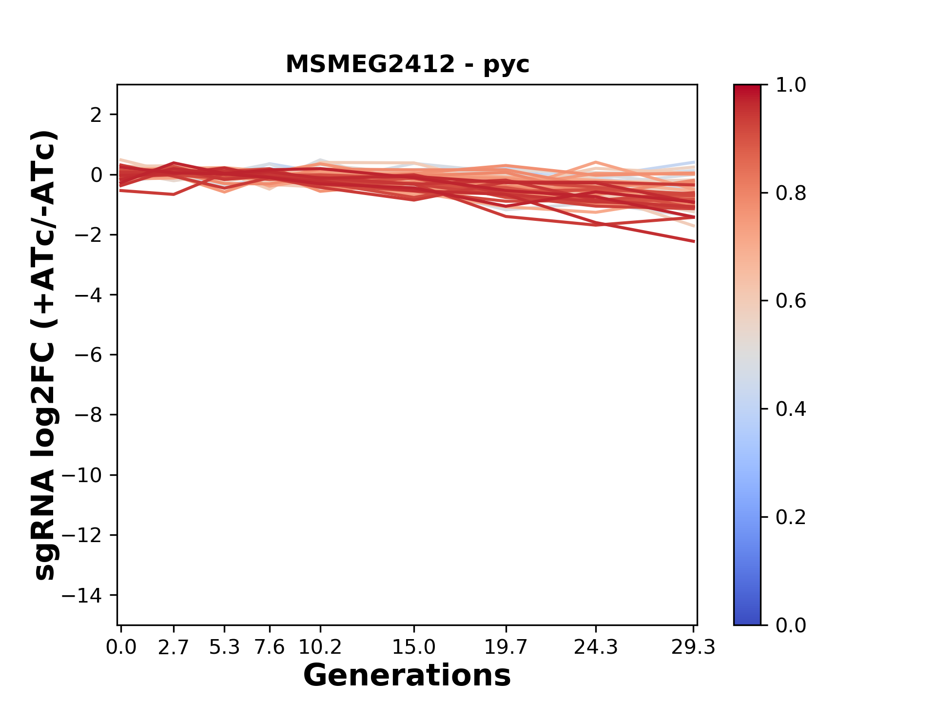 Here, we show sgRNA log2 fold-change values (L2FC) (plus versus minus ATc) over consecutive generations for sgRNAs targeting the gene you selected.