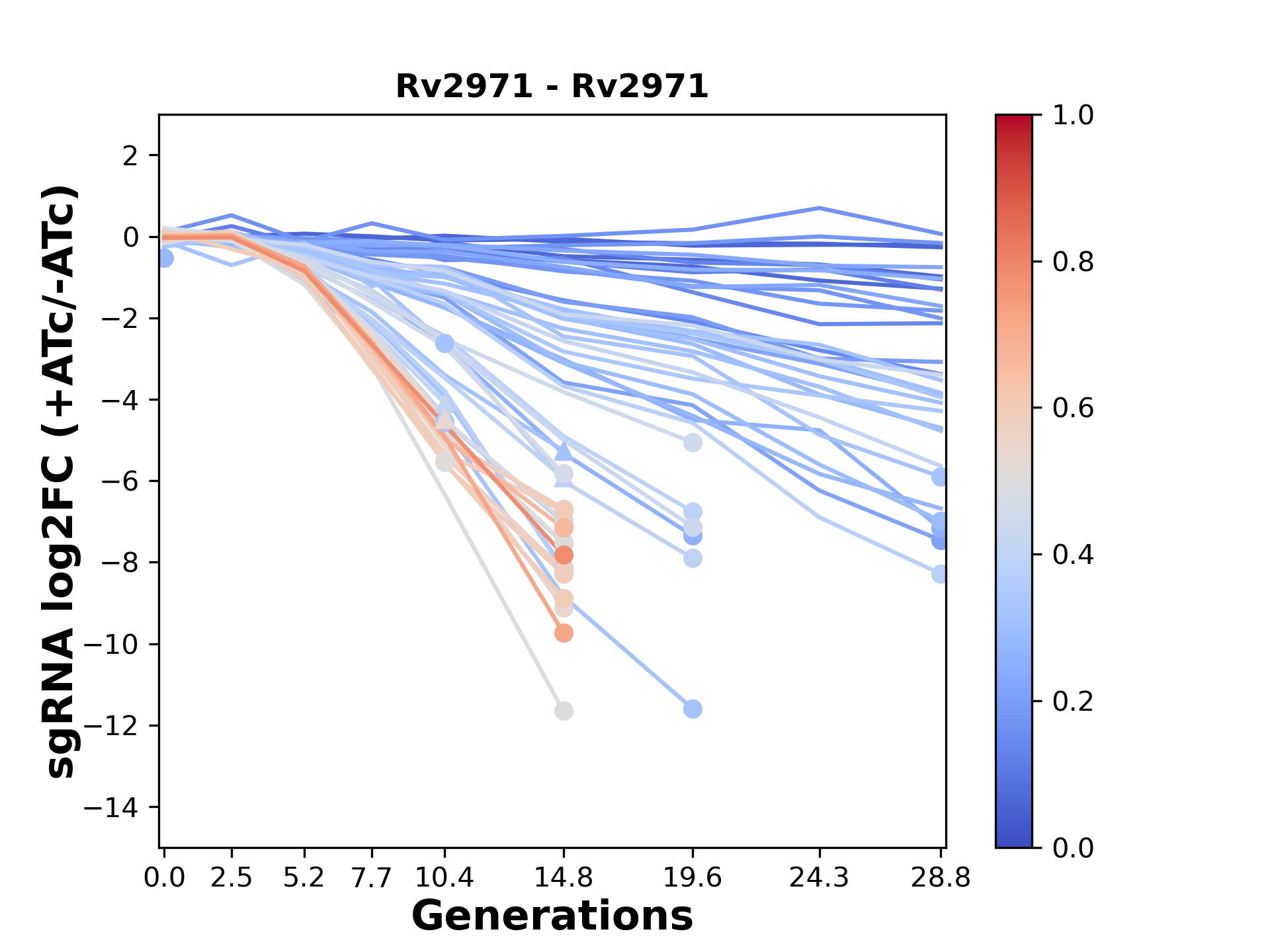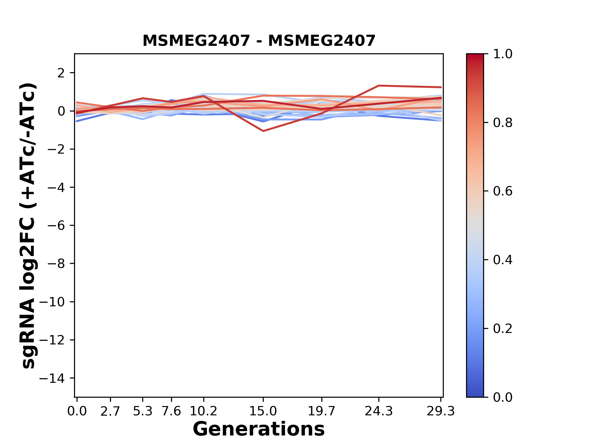 Here, we show sgRNA log2 fold-change values (L2FC) (plus versus minus ATc) over consecutive generations for sgRNAs targeting the gene you selected.