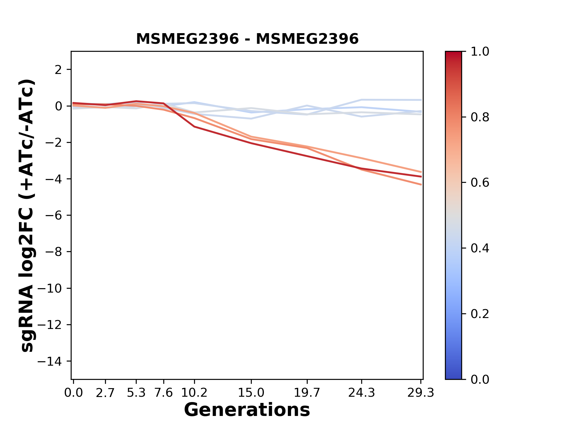 Here, we show sgRNA log2 fold-change values (L2FC) (plus versus minus ATc) over consecutive generations for sgRNAs targeting the gene you selected.