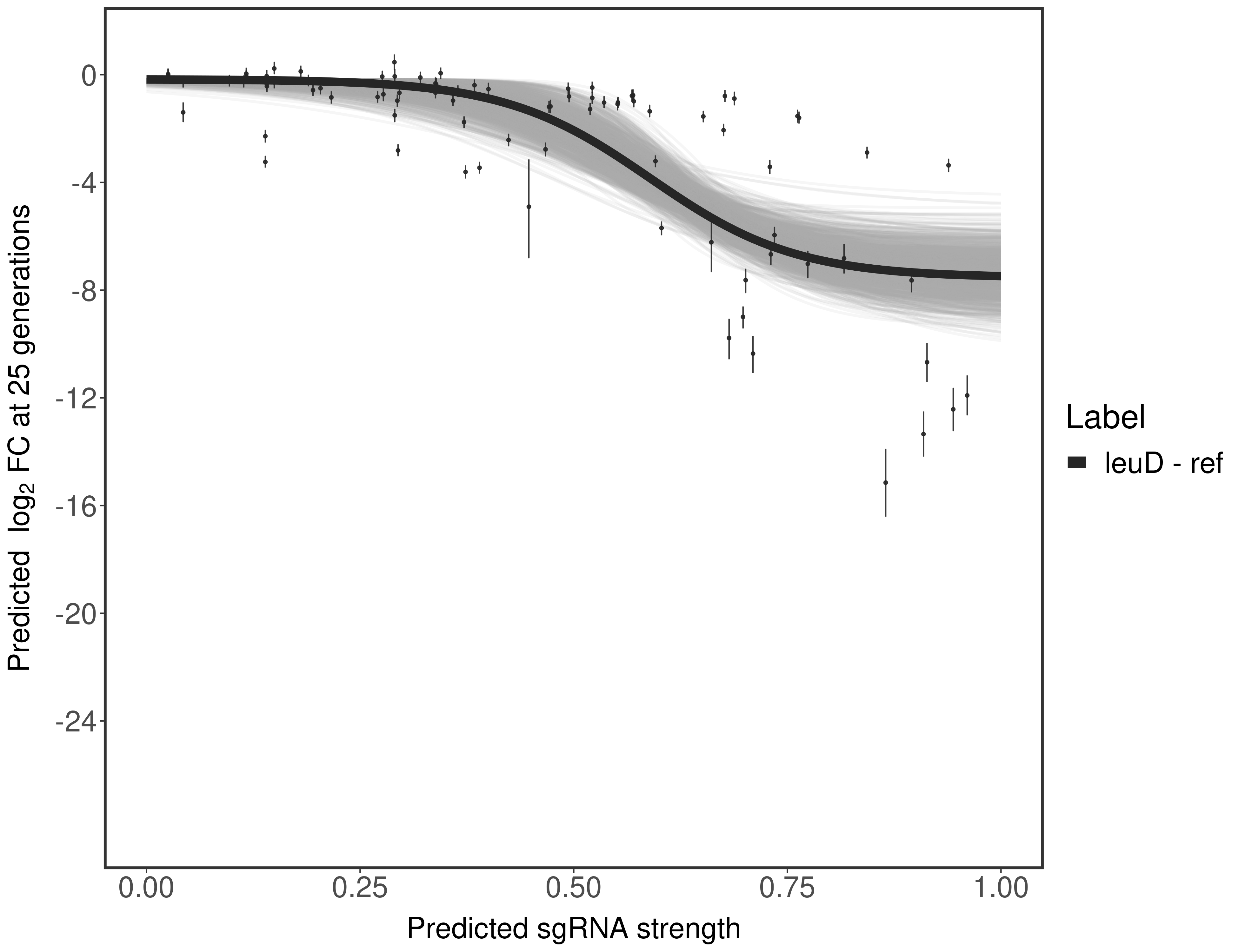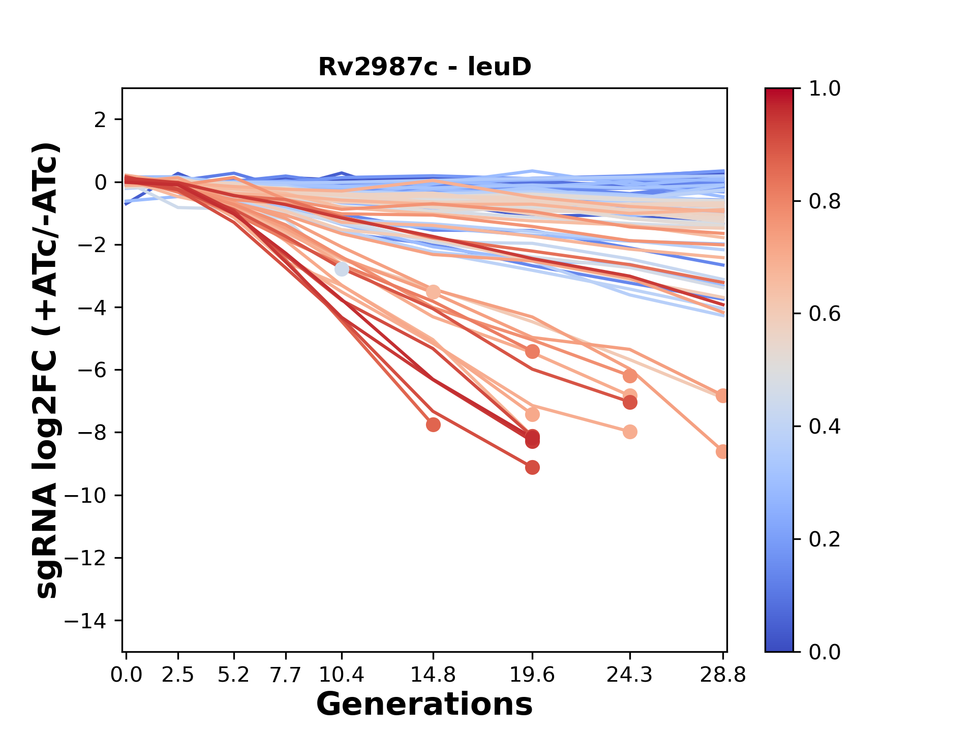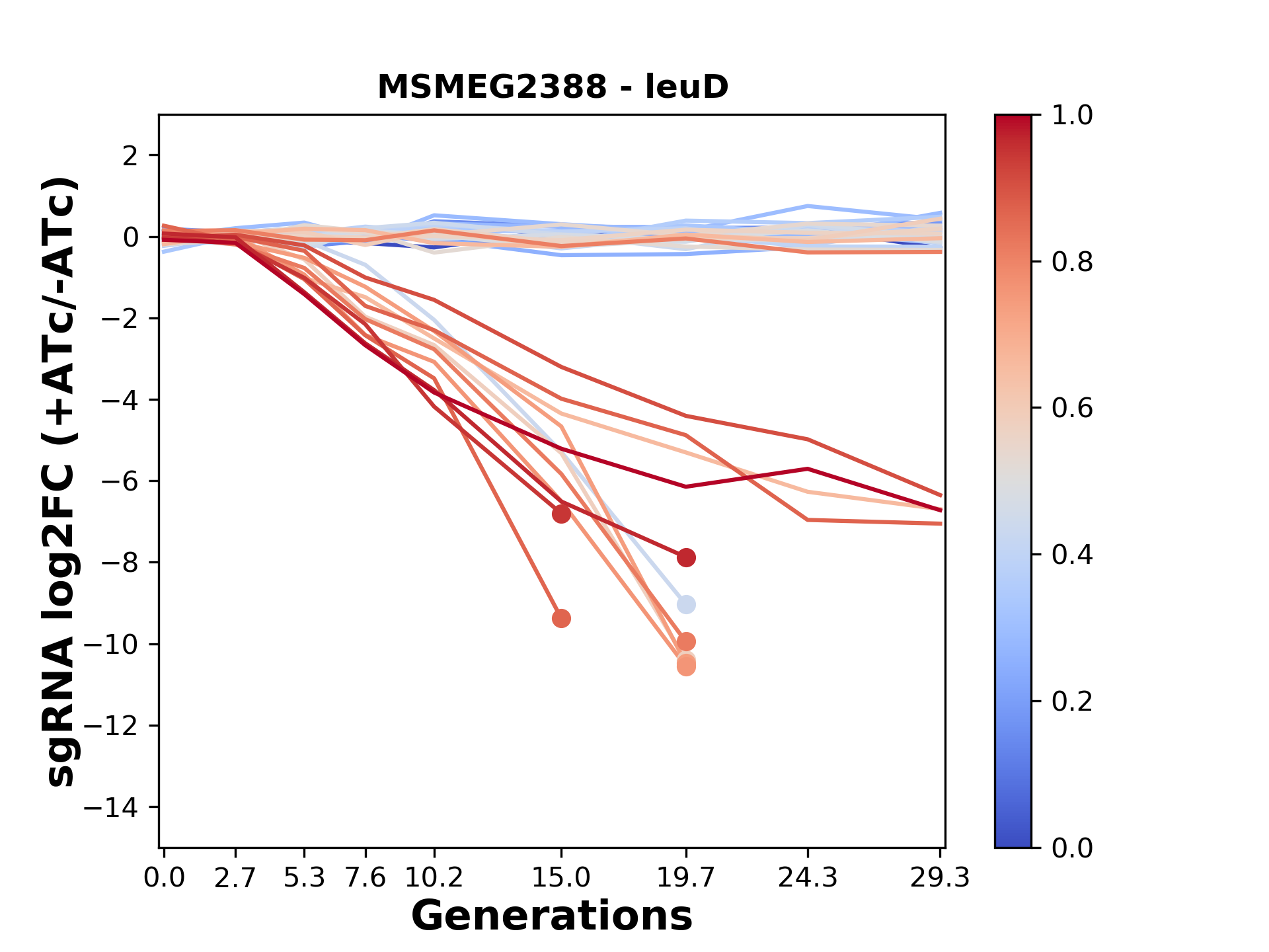 Experiment: We designed an M. tuberculosis CRISPRi library (RLC12) to target all annotated Mtb genes with single guide RNAs (sgRNAs) of varying predicted knockdown efficiencies. In parallel, we constructed a M. smegmatis CRISPRi library (RLC11) to target all annotated Msmeg genes, similar to the Mtb sgRNA library. RLC12 was transformed into M. tuberculosis H37Rv; RLC11 into M. smegmatis mc2-155. We passaged both CRISPRi libraries for nearly 30 generations in the presence or absence of the CRISPRi-inducer anhydrotetracycline (ATc). At the indicated timepoints, genomic DNA was harvested and the representation of individual sgRNAs was counted using Illumina sequencing. Here, we show sgRNA log2 fold-change values (L2FC) (plus versus minus ATc) over consecutive generations for sgRNAs targeting the gene you selected. sgRNAs are color-coded based on their predicted strength from blue (strength=0; weak) to red (strength=1; strong).
