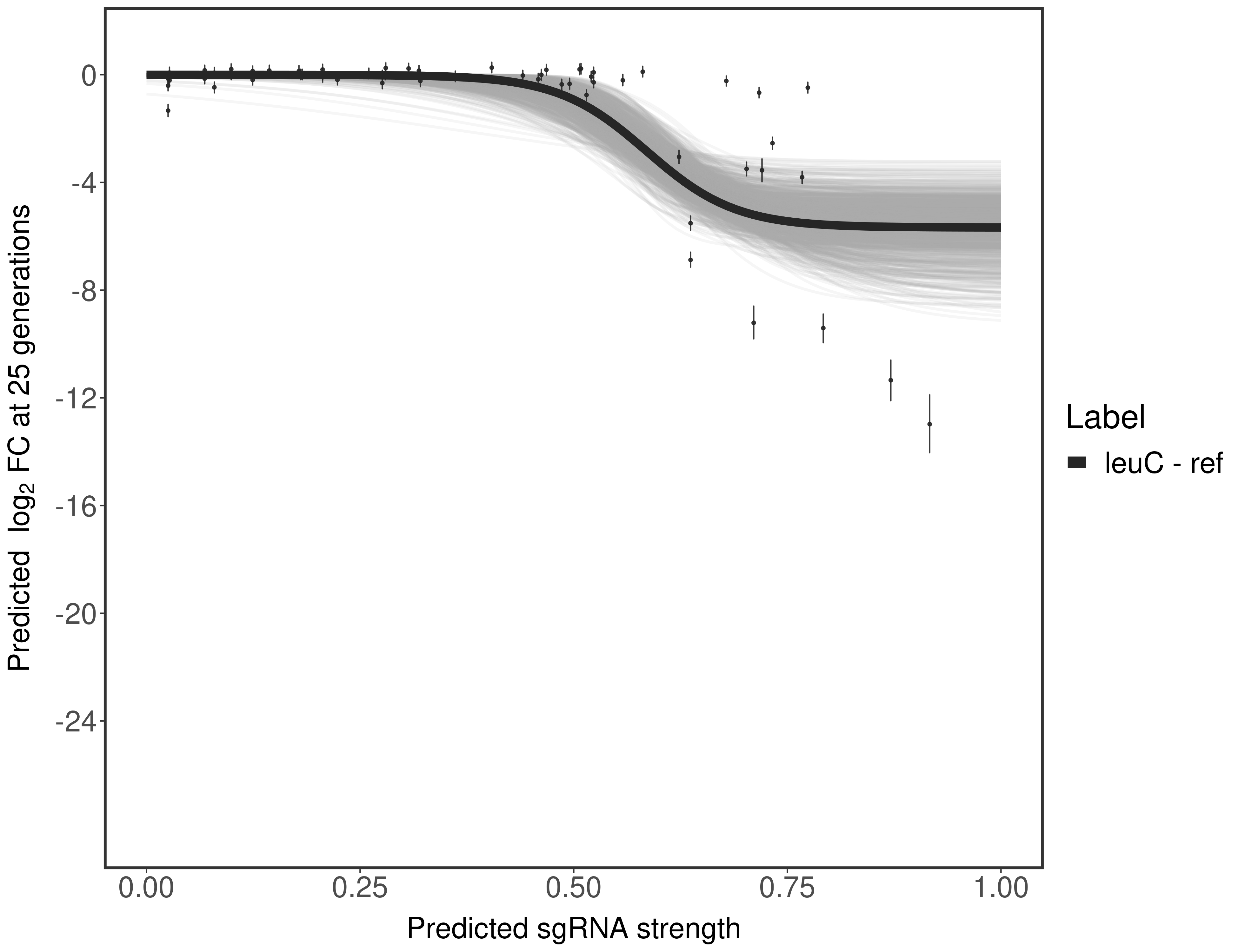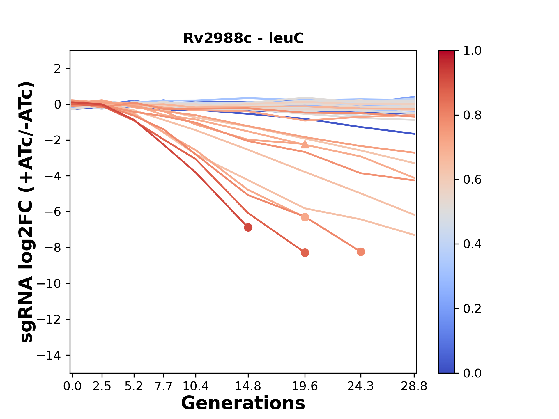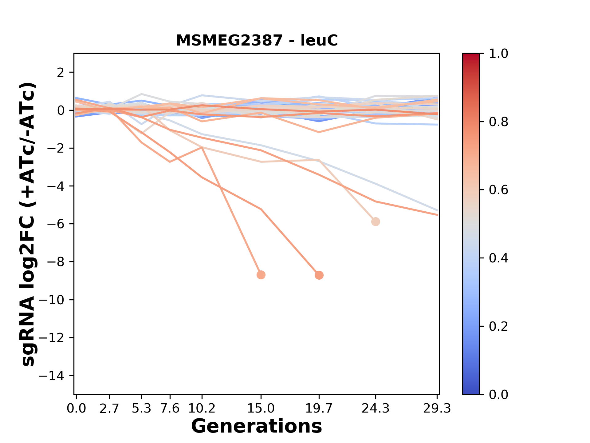 Experiment: We designed an M. tuberculosis CRISPRi library (RLC12) to target all annotated Mtb genes with single guide RNAs (sgRNAs) of varying predicted knockdown efficiencies. In parallel, we constructed a M. smegmatis CRISPRi library (RLC11) to target all annotated Msmeg genes, similar to the Mtb sgRNA library. RLC12 was transformed into M. tuberculosis H37Rv; RLC11 into M. smegmatis mc2-155. We passaged both CRISPRi libraries for nearly 30 generations in the presence or absence of the CRISPRi-inducer anhydrotetracycline (ATc). At the indicated timepoints, genomic DNA was harvested and the representation of individual sgRNAs was counted using Illumina sequencing. Here, we show sgRNA log2 fold-change values (L2FC) (plus versus minus ATc) over consecutive generations for sgRNAs targeting the gene you selected. sgRNAs are color-coded based on their predicted strength from blue (strength=0; weak) to red (strength=1; strong).