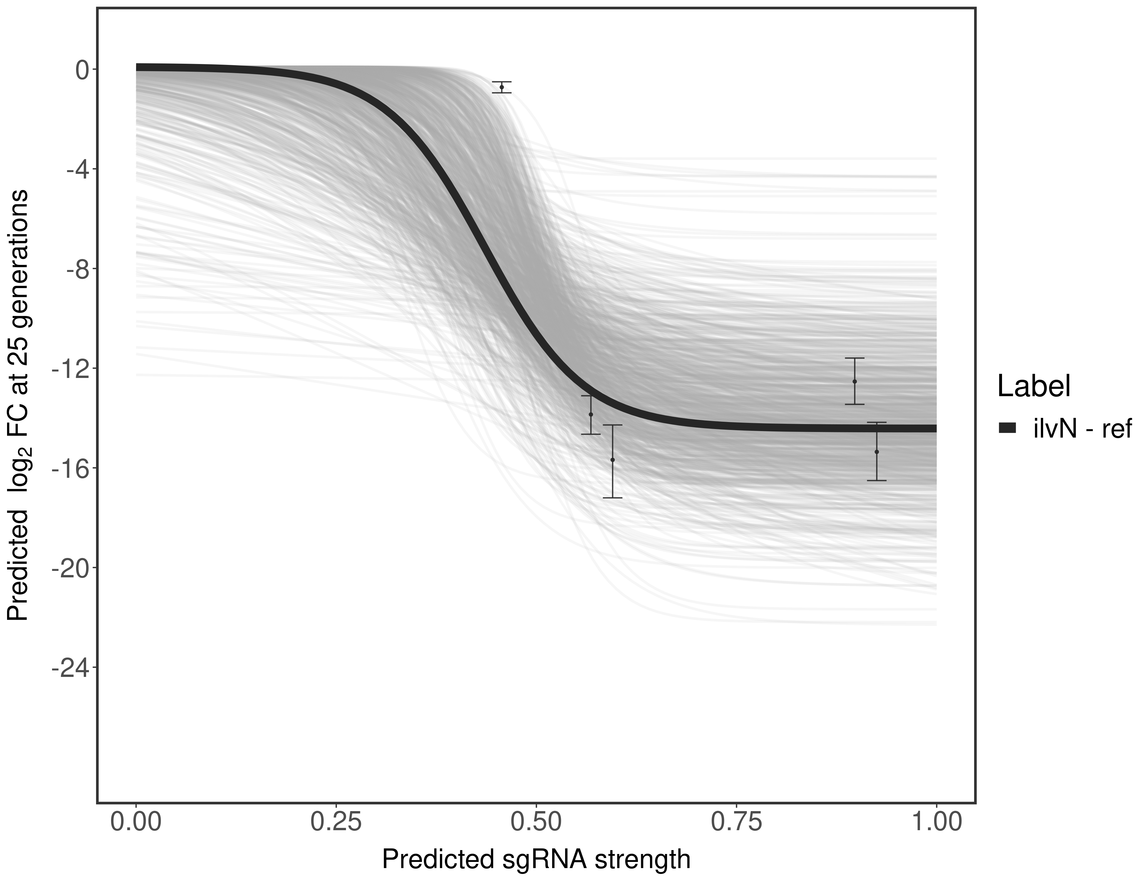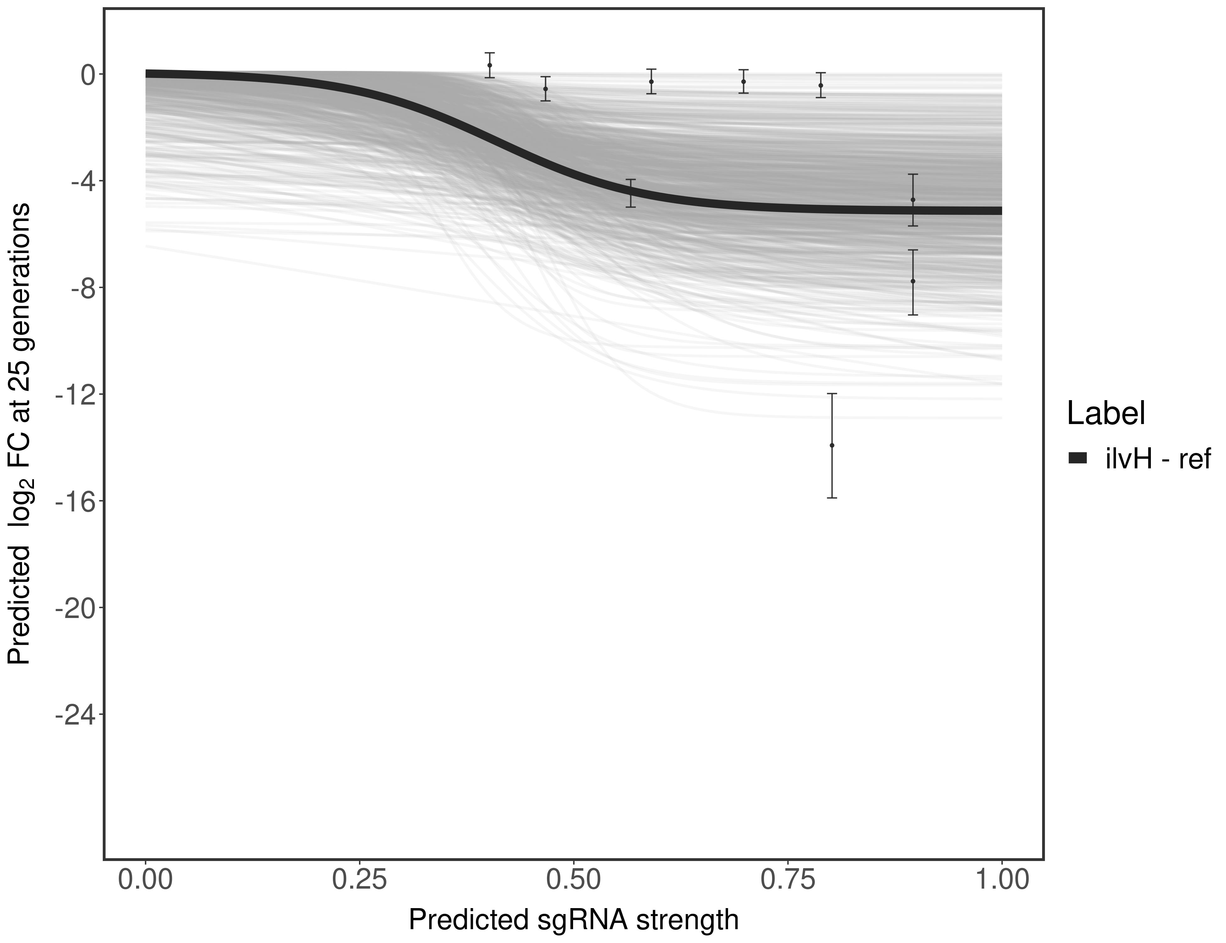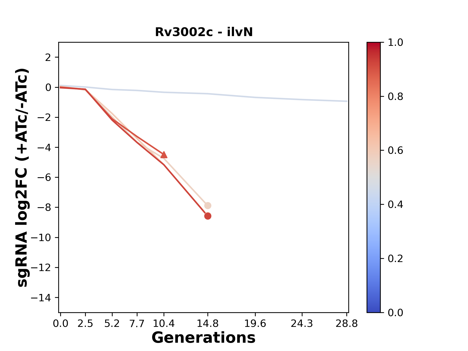 Here, we show sgRNA log2 fold-change values (L2FC) (plus versus minus ATc) over consecutive generations for sgRNAs targeting the gene you selected.