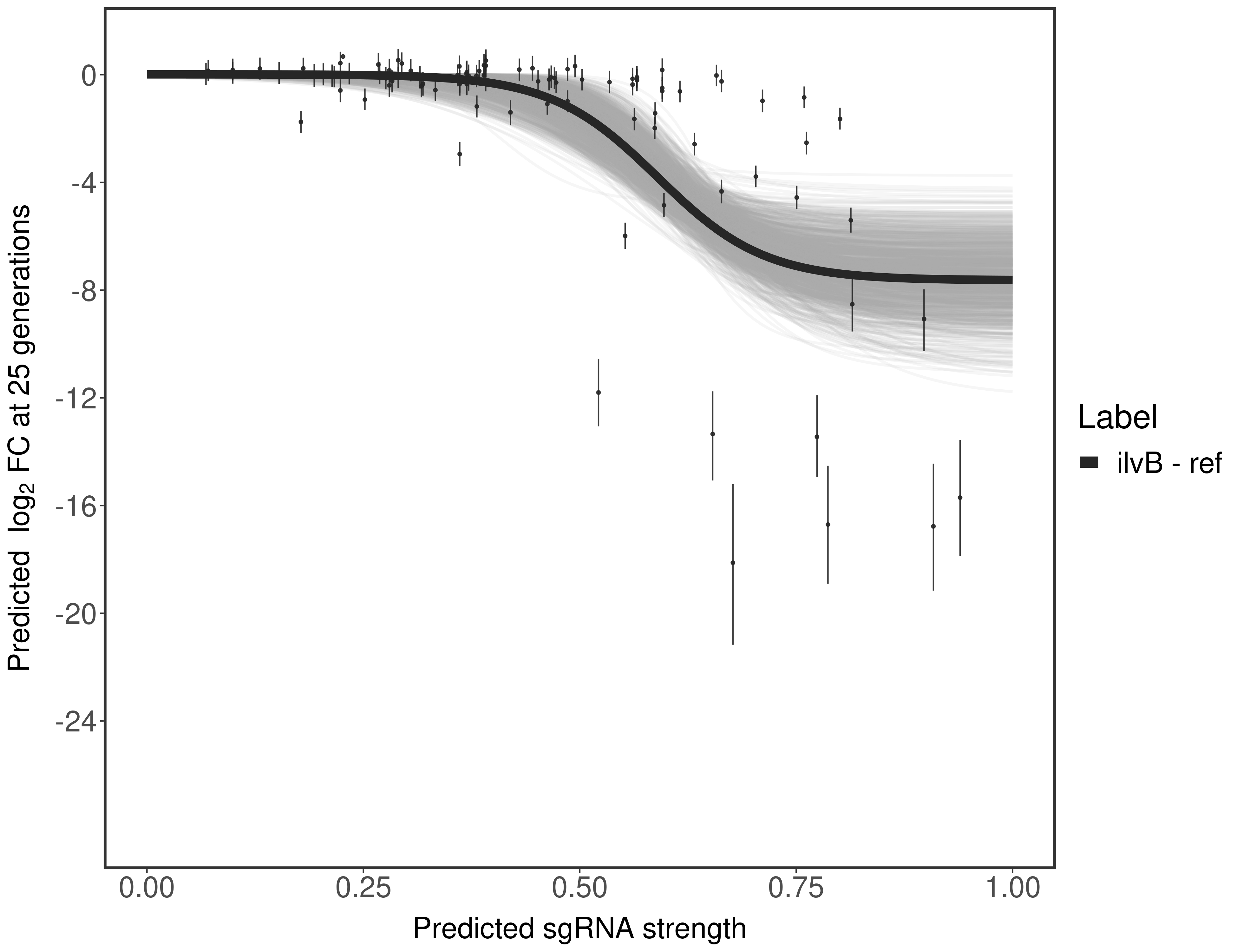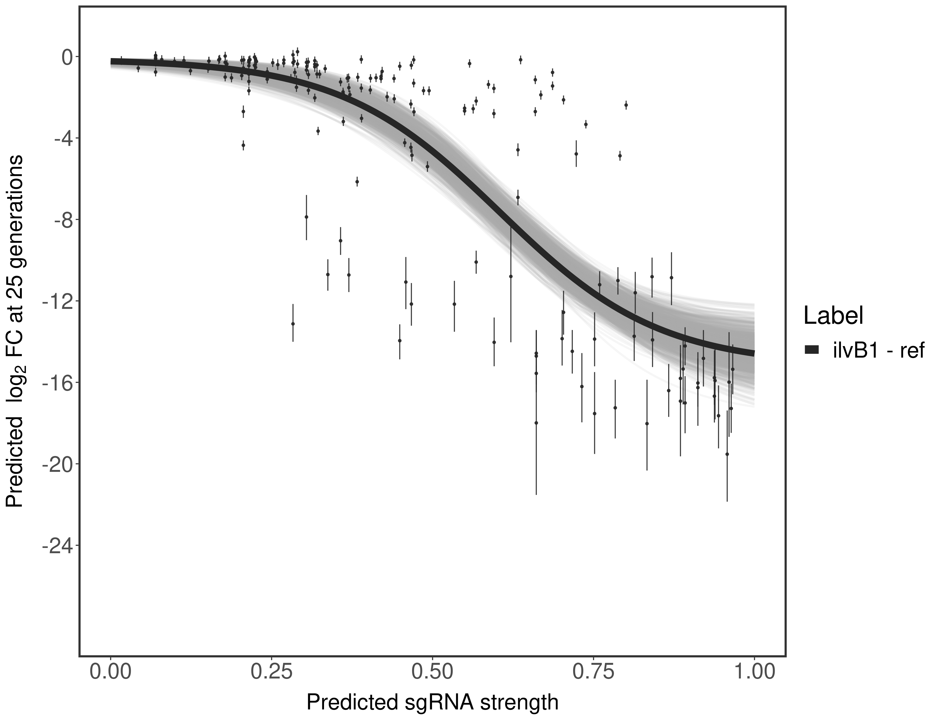 Experiment: We designed an M. tuberculosis CRISPRi library (RLC12) to target all annotated Mtb genes with single guide RNAs (sgRNAs) of varying predicted knockdown efficiencies. In parallel, we constructed a M. smegmatis CRISPRi library (RLC11) to target all annotated Msmeg genes, similar to the Mtb sgRNA library. RLC12 was transformed into M. tuberculosis H37Rv; RLC11 into M. smegmatis mc2-155. We passaged both CRISPRi libraries for nearly 30 generations in the presence or absence of the CRISPRi-inducer anhydrotetracycline (ATc). At the indicated timepoints, genomic DNA was harvested and the representation of individual sgRNAs was counted using Illumina sequencing. Here, we show sgRNA log2 fold-change values (L2FC) (plus versus minus ATc) over consecutive generations for sgRNAs targeting the gene you selected. sgRNAs are color-coded based on their predicted strength from blue (strength=0; weak) to red (strength=1; strong).
