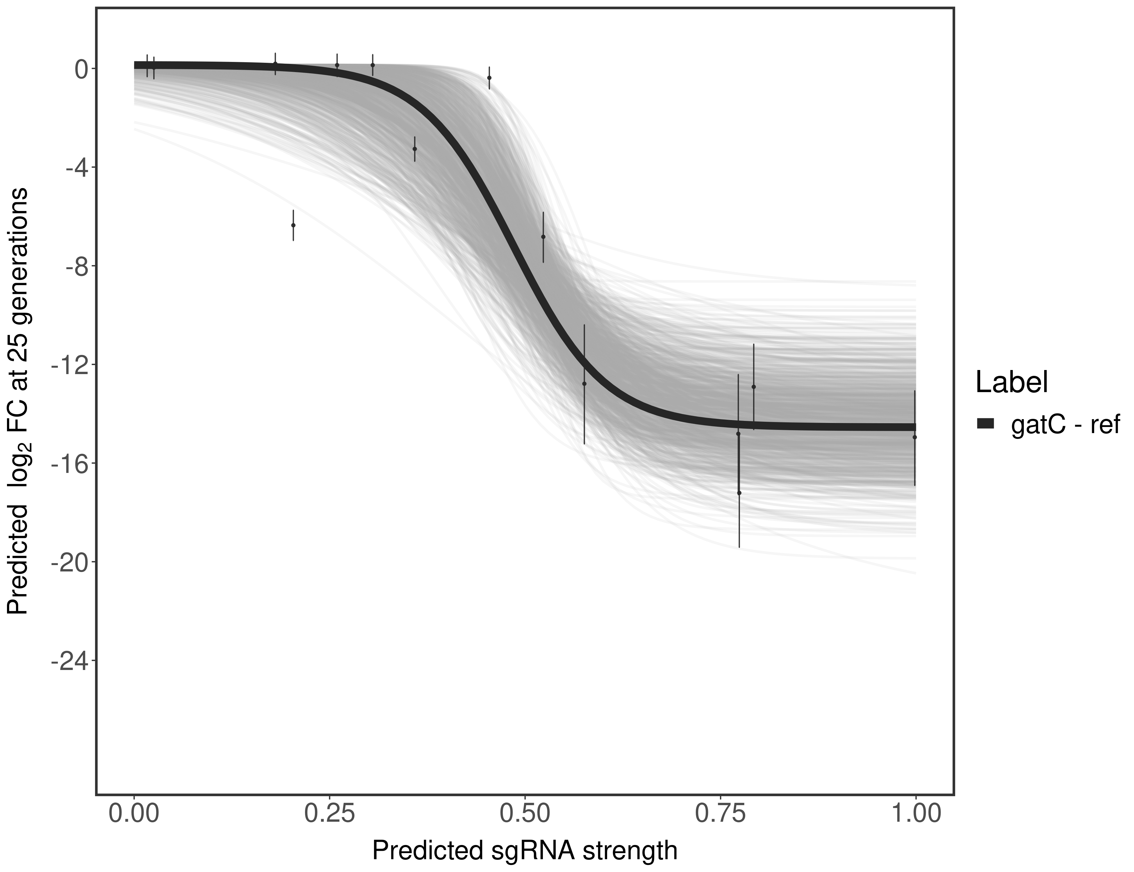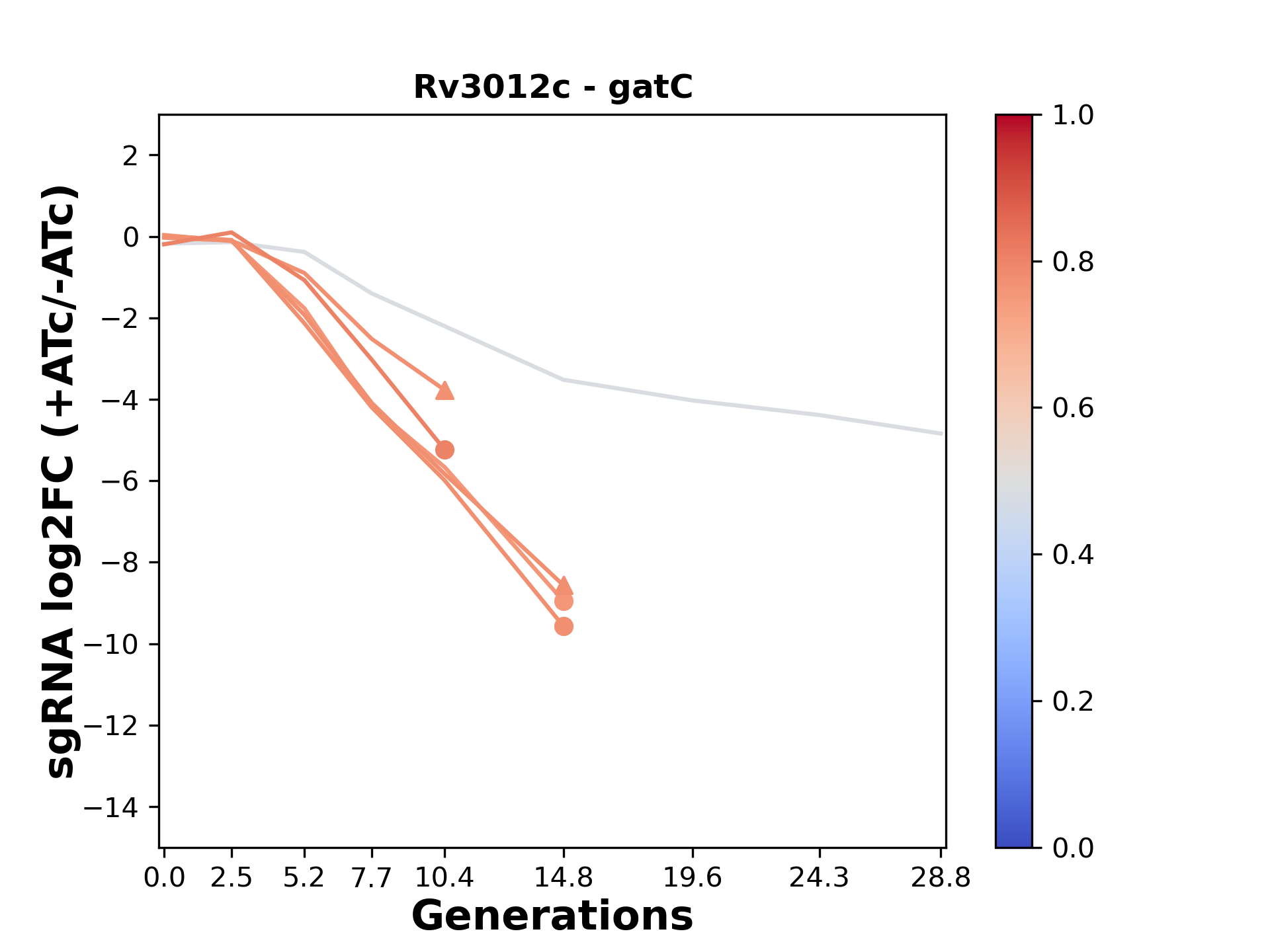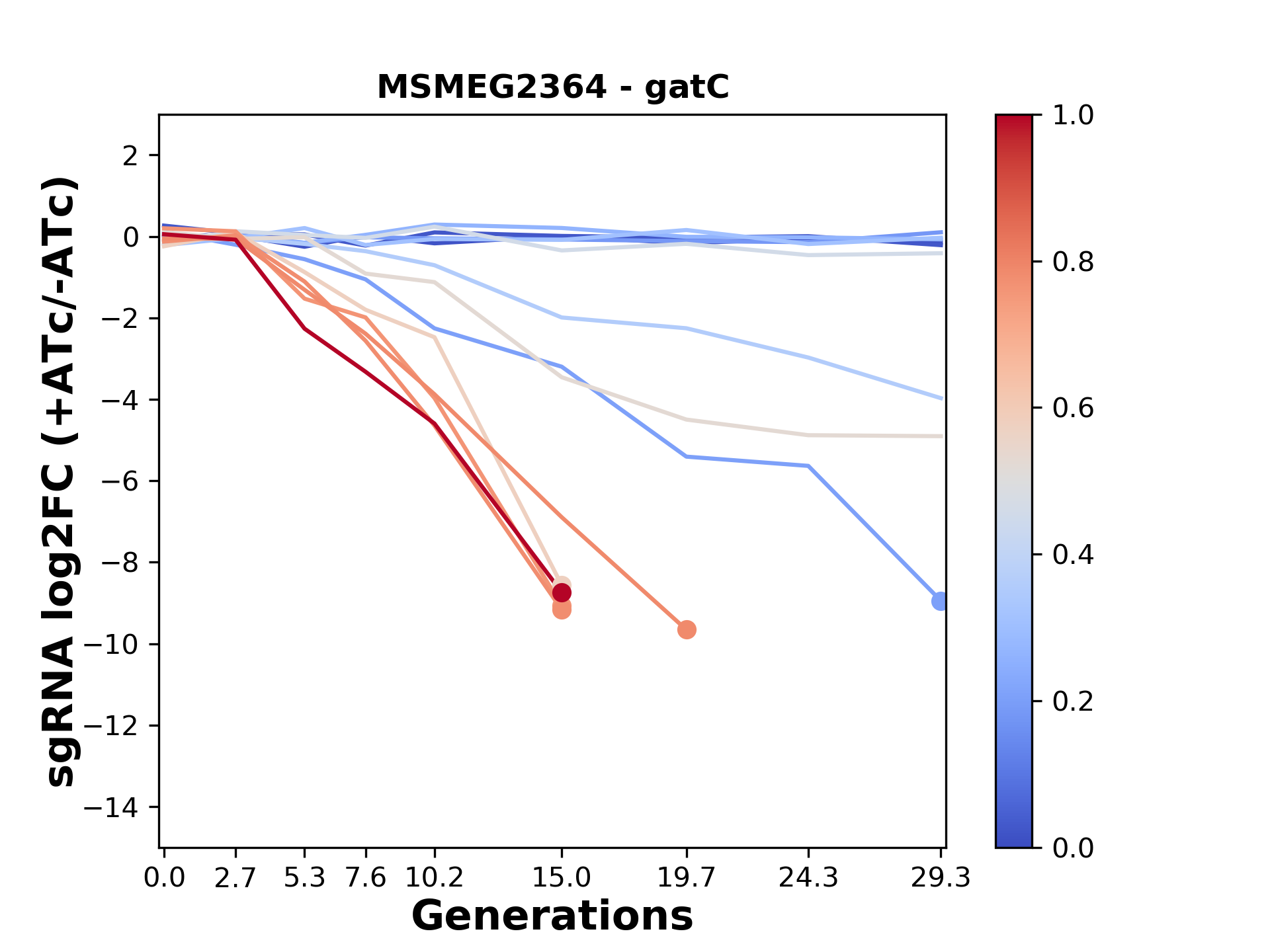 Here, we show sgRNA log2 fold-change values (L2FC) (plus versus minus ATc) over consecutive generations for sgRNAs targeting the gene you selected.
