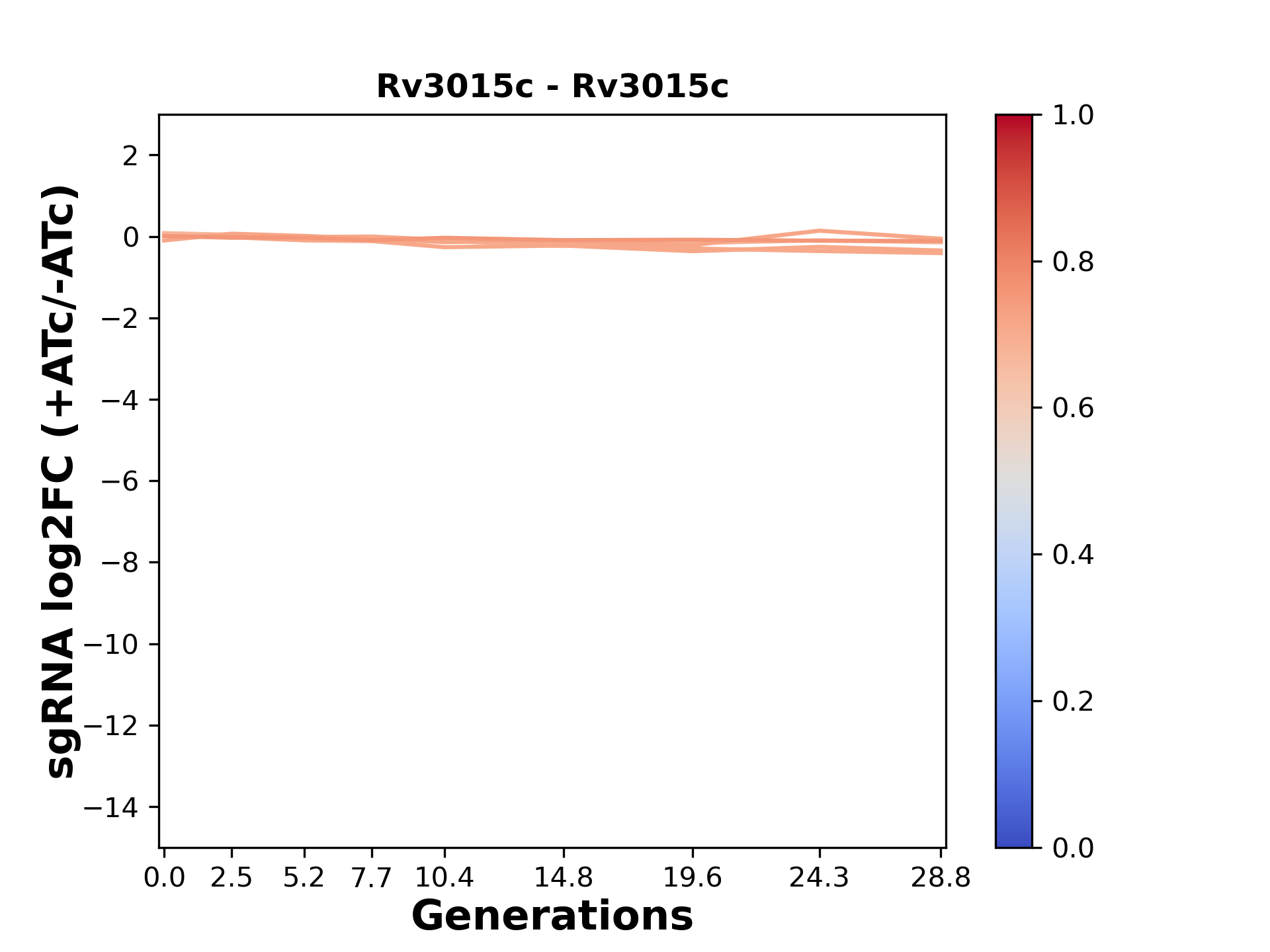 Here, we show sgRNA log2 fold-change values (L2FC) (plus versus minus ATc) over consecutive generations for sgRNAs targeting the gene you selected.