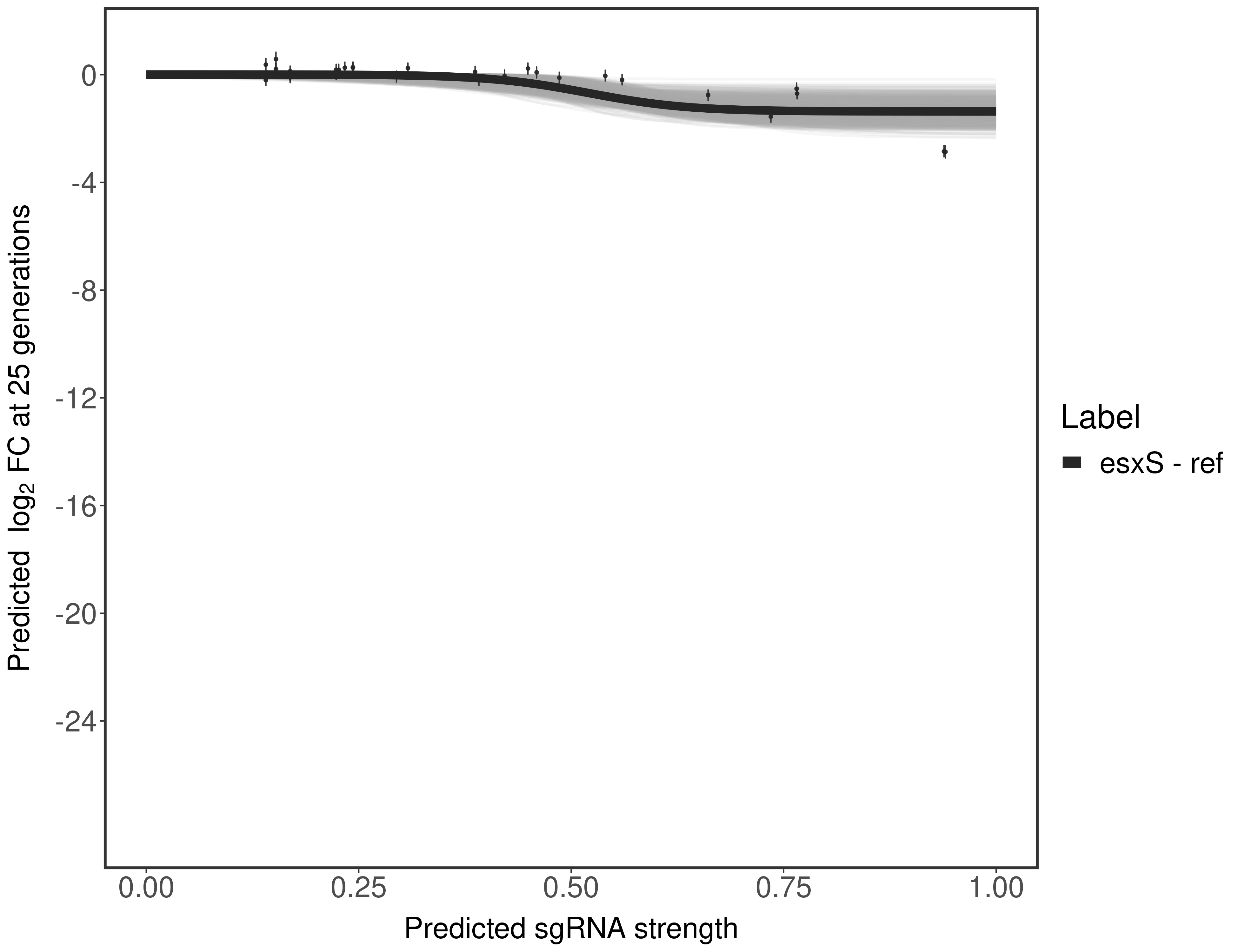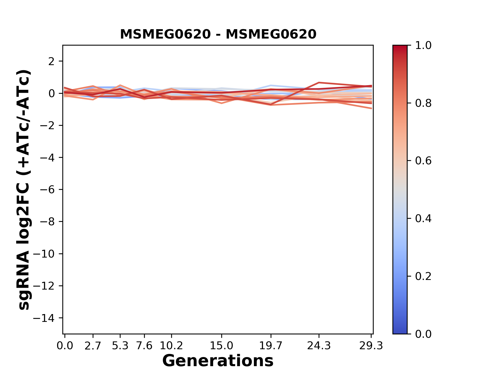 Experiment: We designed an M. tuberculosis CRISPRi library (RLC12) to target all annotated Mtb genes with single guide RNAs (sgRNAs) of varying predicted knockdown efficiencies. In parallel, we constructed a M. smegmatis CRISPRi library (RLC11) to target all annotated Msmeg genes, similar to the Mtb sgRNA library. RLC12 was transformed into M. tuberculosis H37Rv; RLC11 into M. smegmatis mc2-155. We passaged both CRISPRi libraries for nearly 30 generations in the presence or absence of the CRISPRi-inducer anhydrotetracycline (ATc). At the indicated timepoints, genomic DNA was harvested and the representation of individual sgRNAs was counted using Illumina sequencing. Here, we show sgRNA log2 fold-change values (L2FC) (plus versus minus ATc) over consecutive generations for sgRNAs targeting the gene you selected. sgRNAs are color-coded based on their predicted strength from blue (strength=0; weak) to red (strength=1; strong).