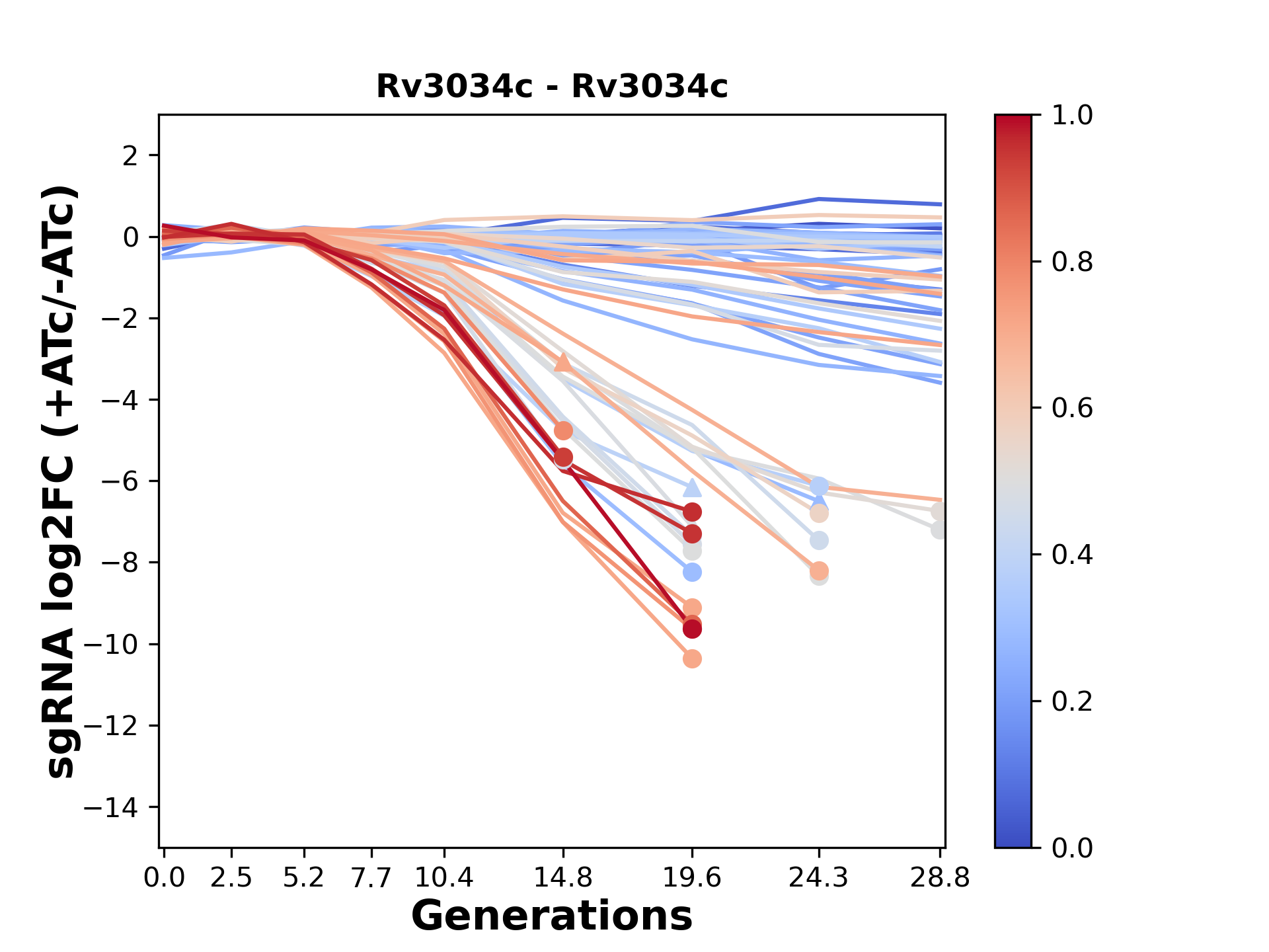 Here, we show sgRNA log2 fold-change values (L2FC) (plus versus minus ATc) over consecutive generations for sgRNAs targeting the gene you selected.