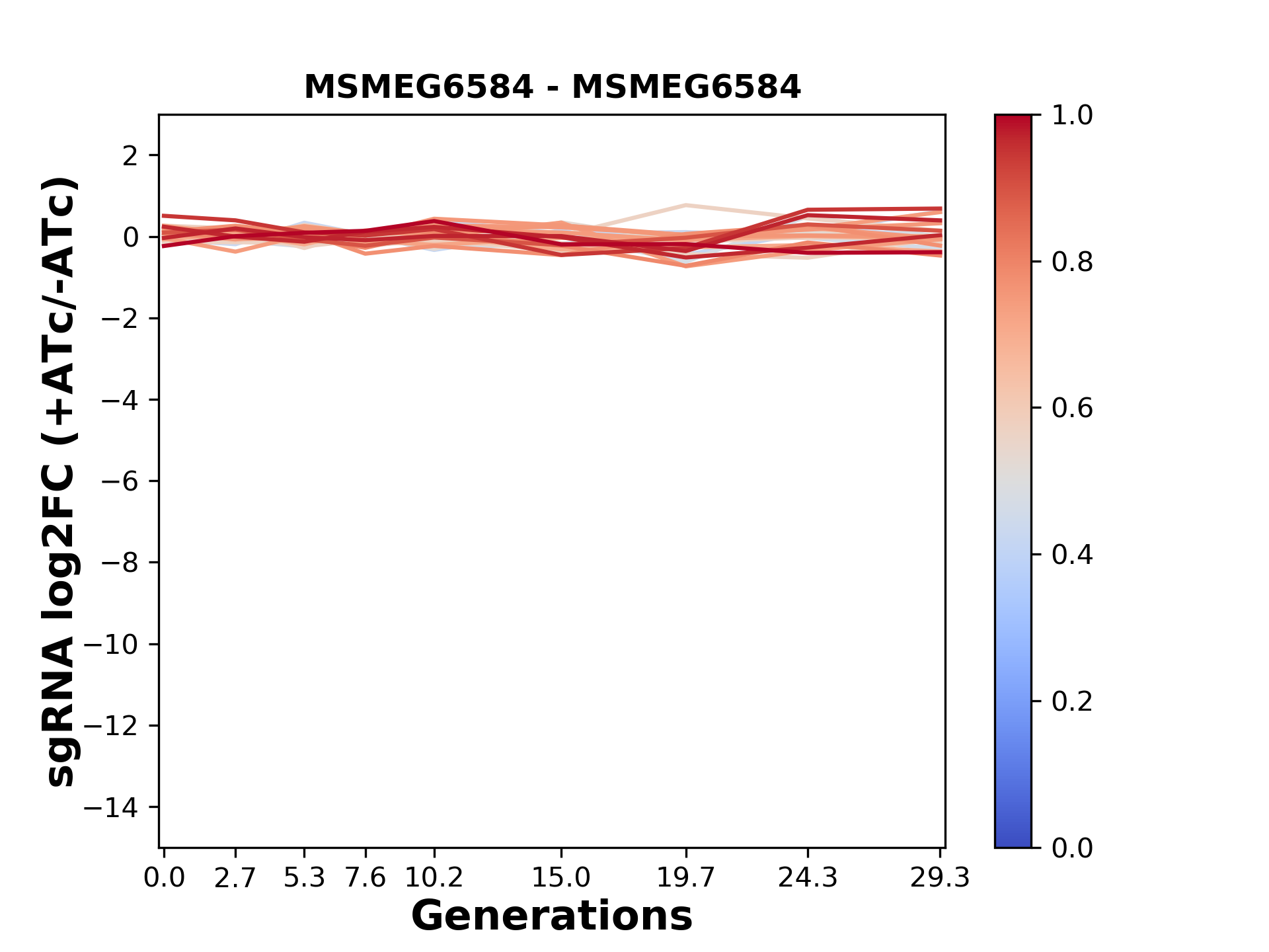 Here, we show sgRNA log2 fold-change values (L2FC) (plus versus minus ATc) over consecutive generations for sgRNAs targeting the gene you selected.