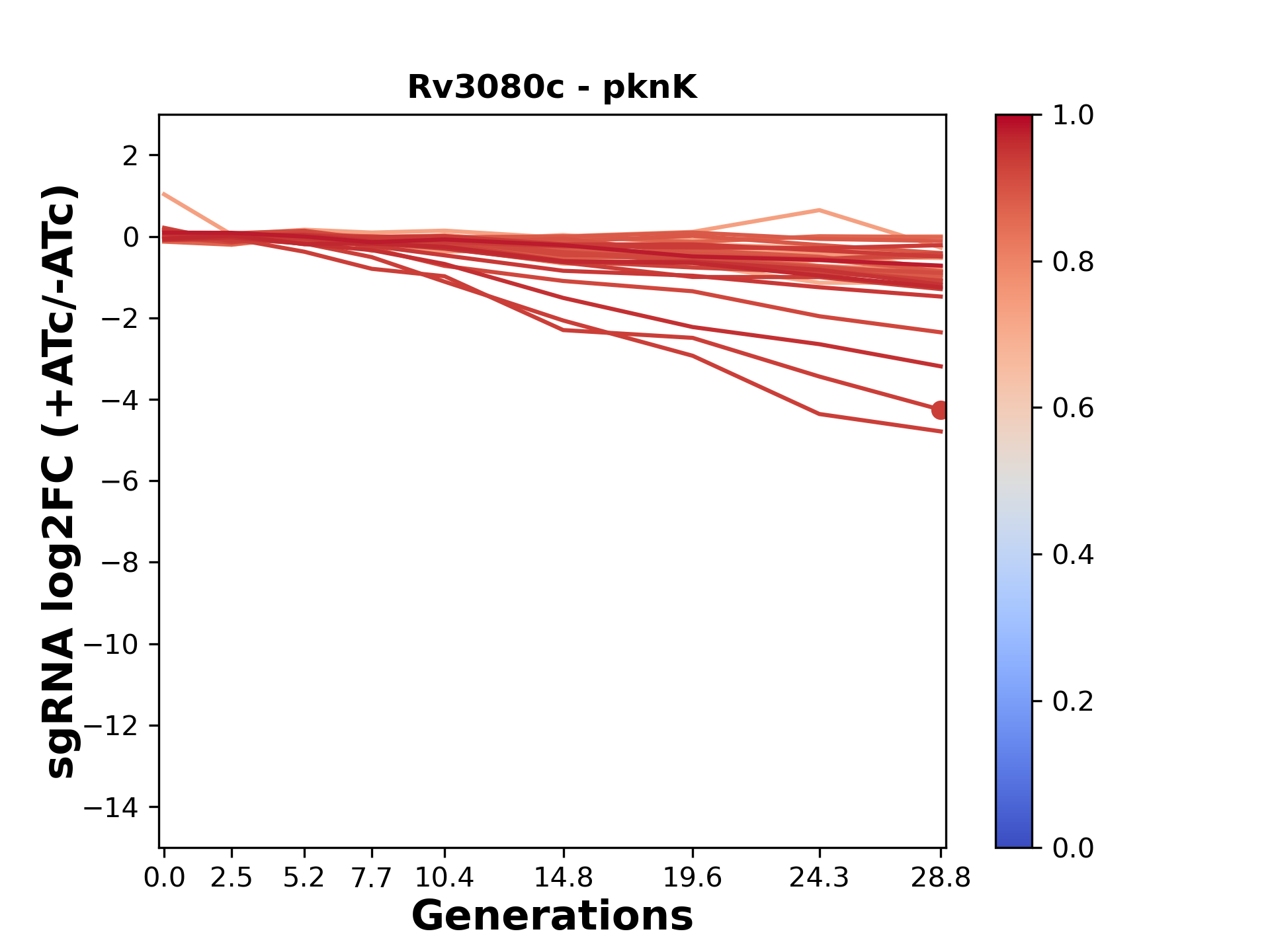 Here, we show sgRNA log2 fold-change values (L2FC) (plus versus minus ATc) over consecutive generations for sgRNAs targeting the gene you selected.