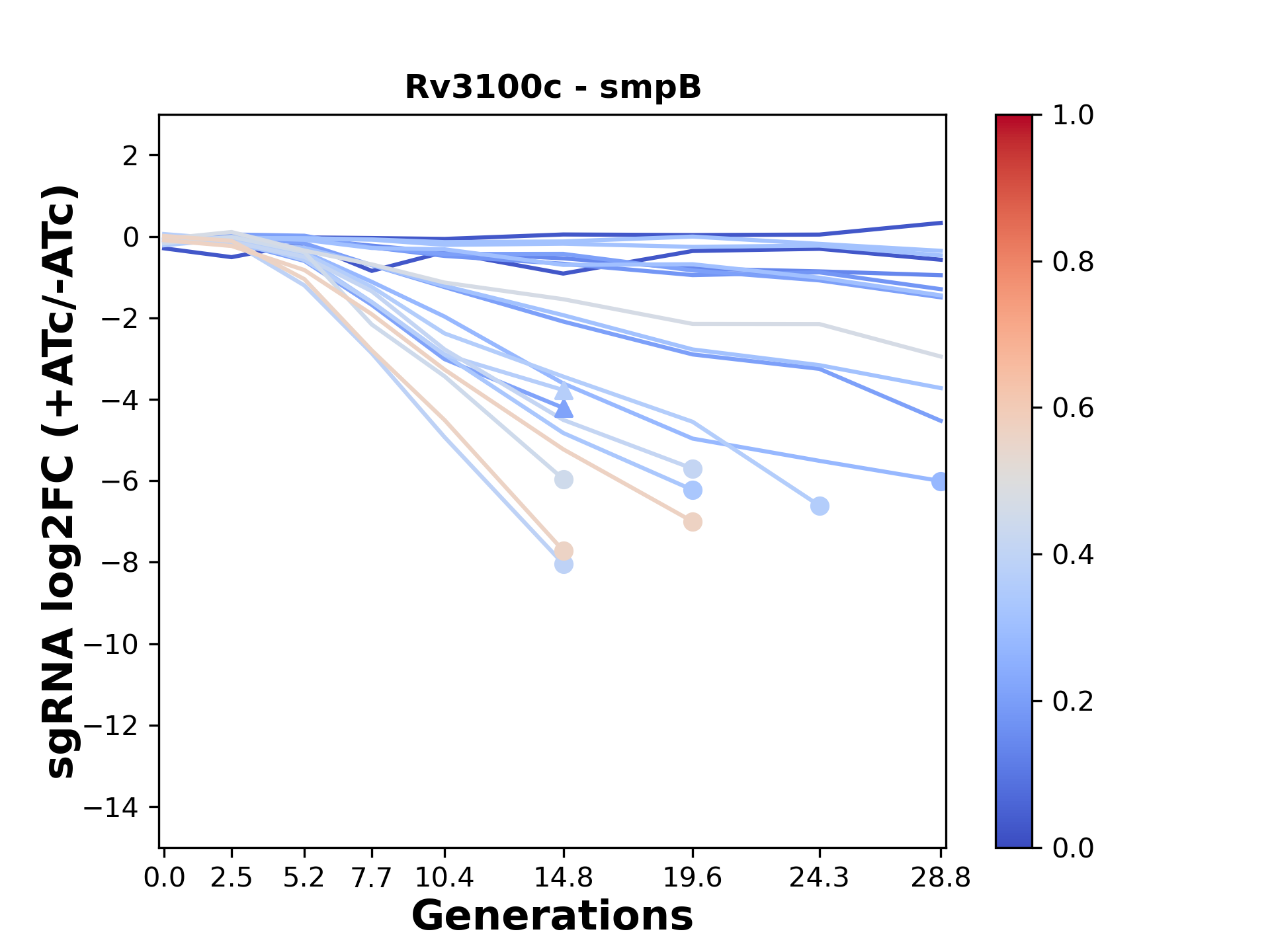 Here, we show sgRNA log2 fold-change values (L2FC) (plus versus minus ATc) over consecutive generations for sgRNAs targeting the gene you selected.