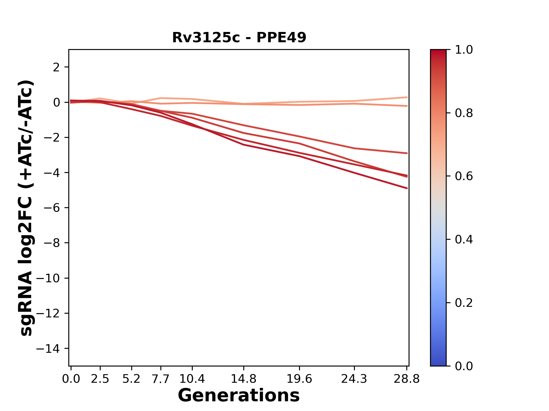Here, we show sgRNA log2 fold-change values (L2FC) (plus versus minus ATc) over consecutive generations for sgRNAs targeting the gene you selected.