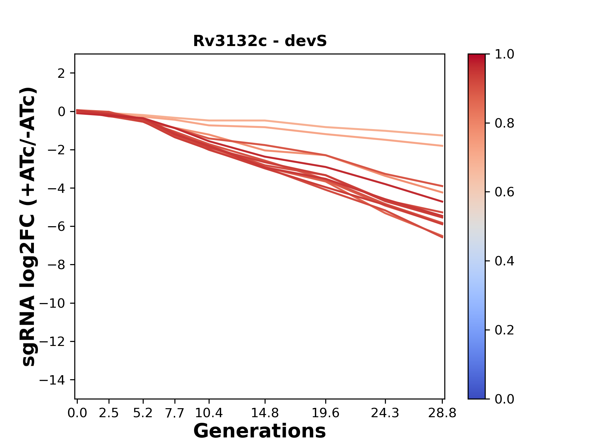 Here, we show sgRNA log2 fold-change values (L2FC) (plus versus minus ATc) over consecutive generations for sgRNAs targeting the gene you selected.