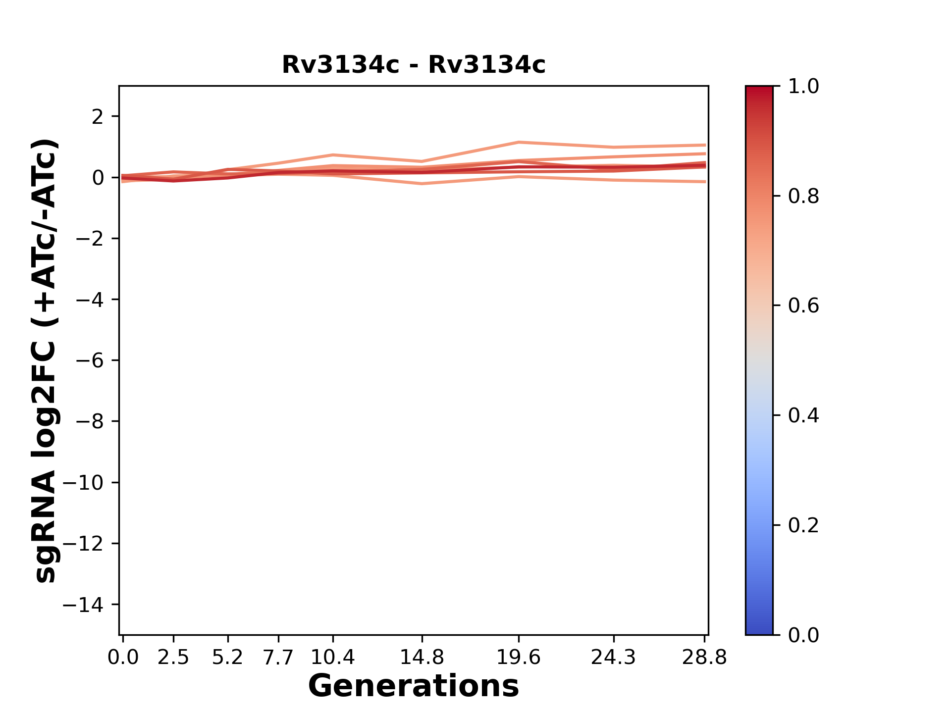Here, we show sgRNA log2 fold-change values (L2FC) (plus versus minus ATc) over consecutive generations for sgRNAs targeting the gene you selected.
