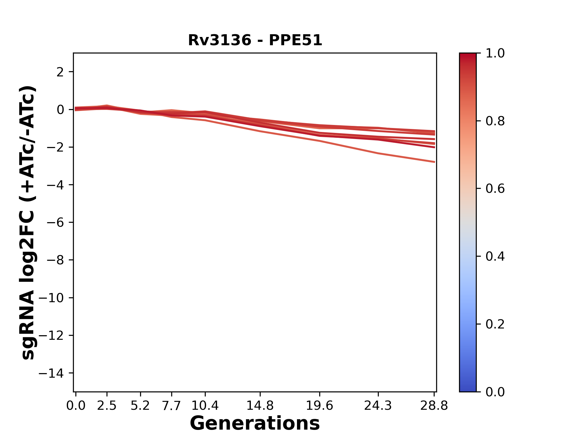 Here, we show sgRNA log2 fold-change values (L2FC) (plus versus minus ATc) over consecutive generations for sgRNAs targeting the gene you selected.