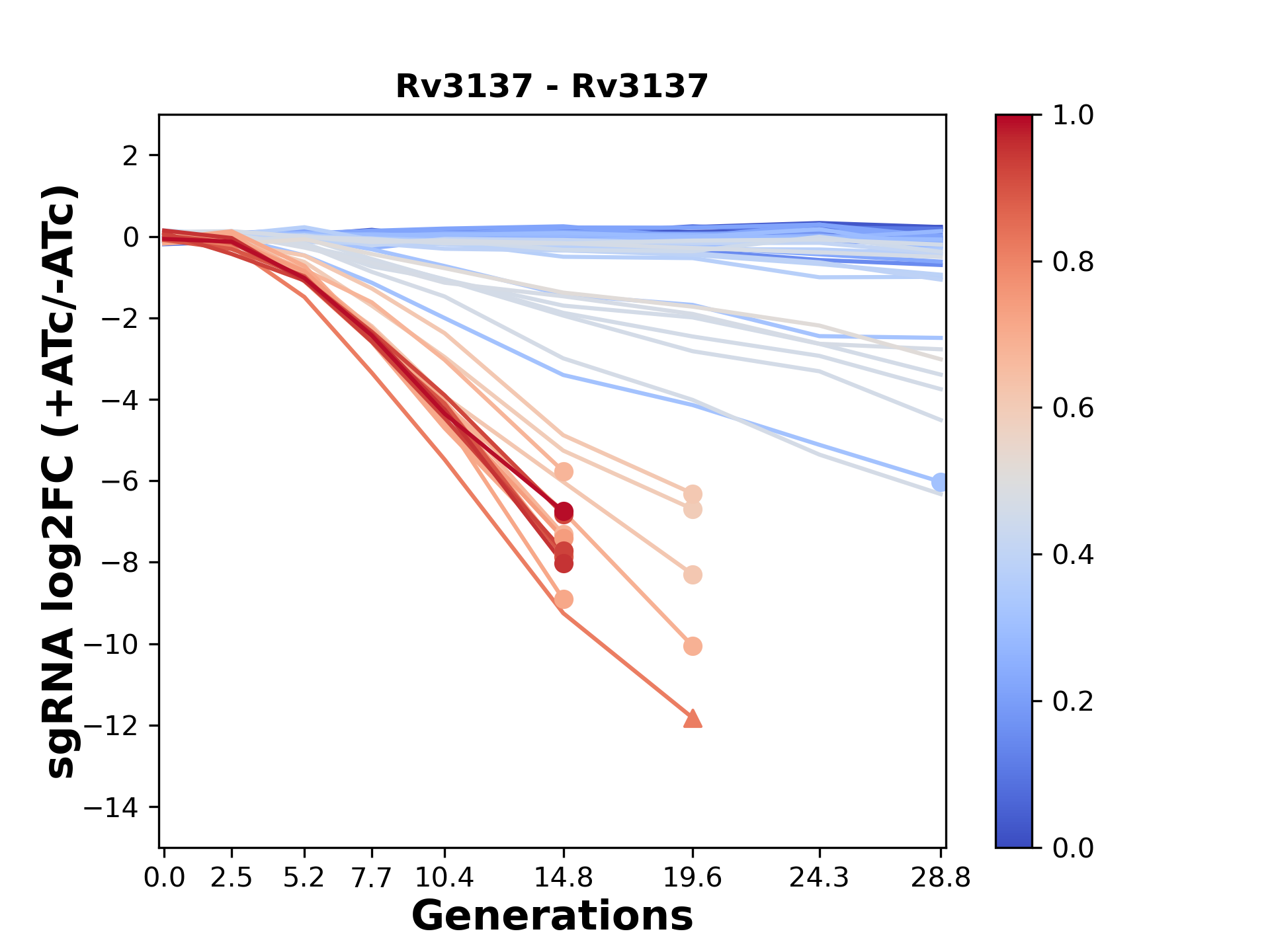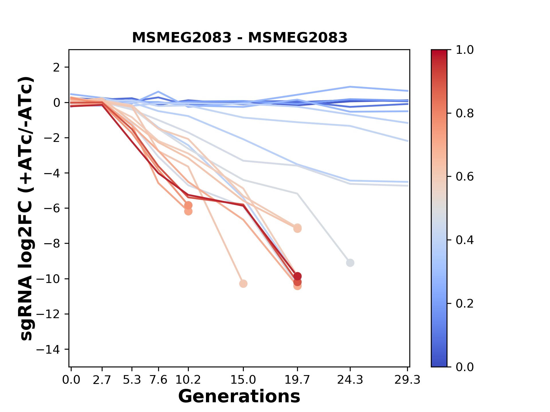 Here, we show sgRNA log2 fold-change values (L2FC) (plus versus minus ATc) over consecutive generations for sgRNAs targeting the gene you selected.
