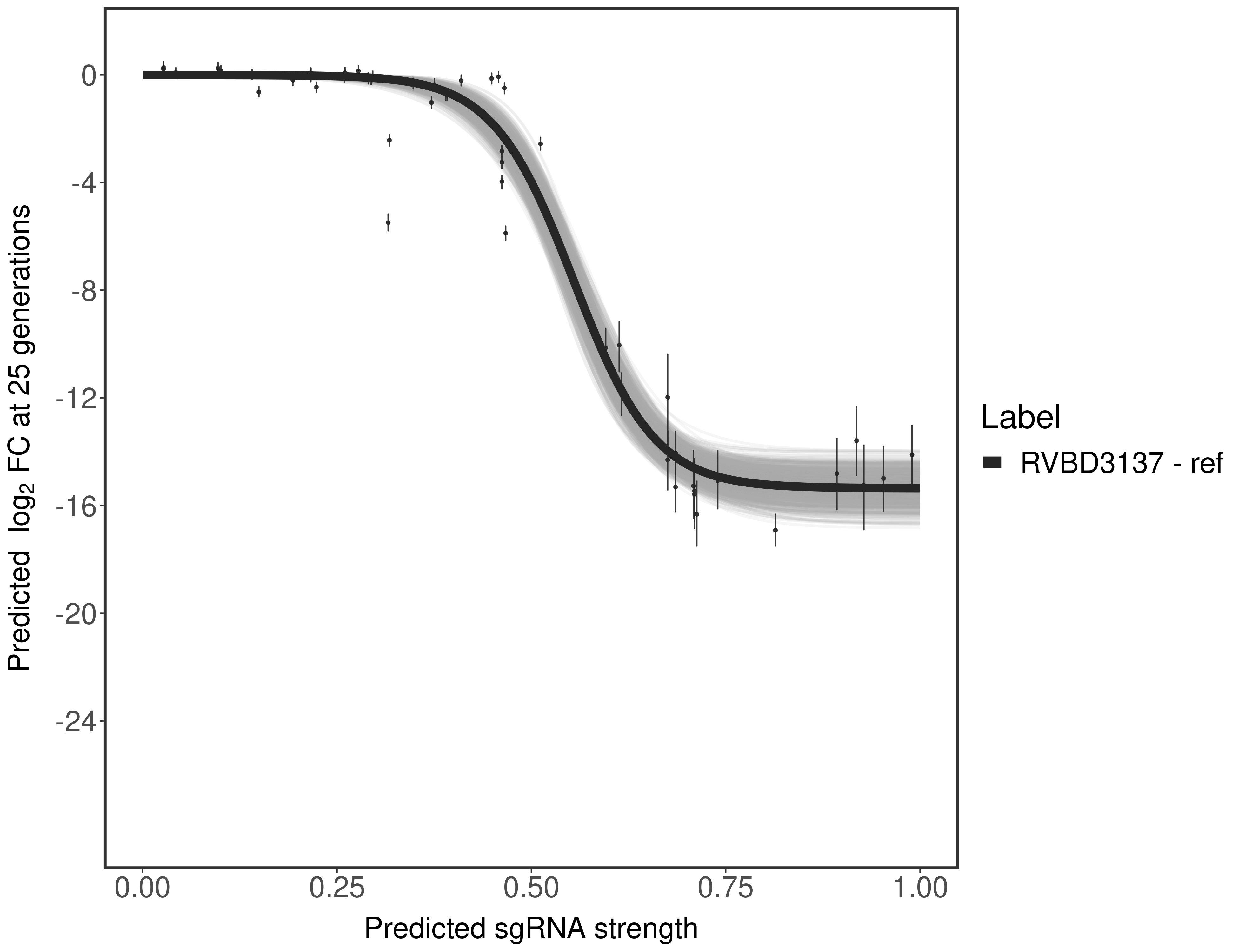 In order to quantify gene vulnerability, data were subsequently analyzed with a hierarchical model at the sgRNA level (two-line model) and gene level (Hill curve). The vulnerability quantification is shown below. [More information]