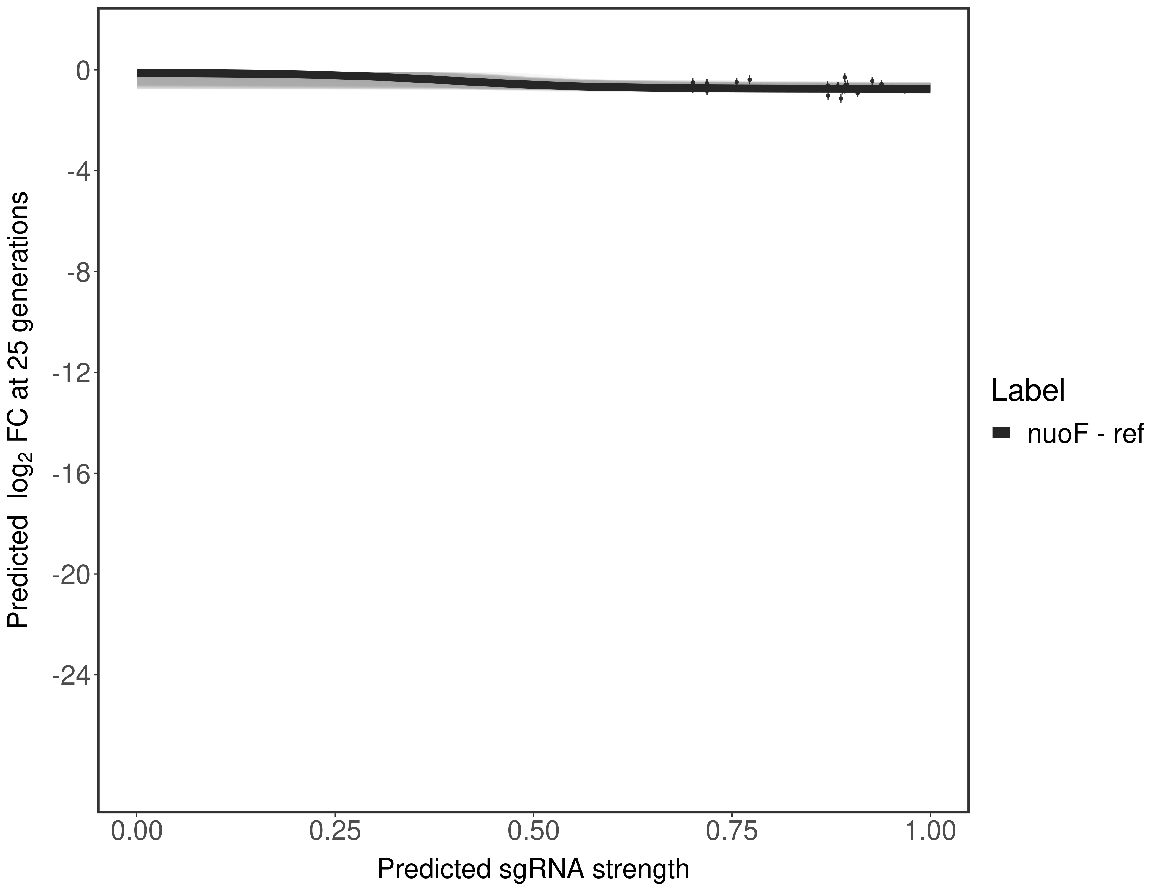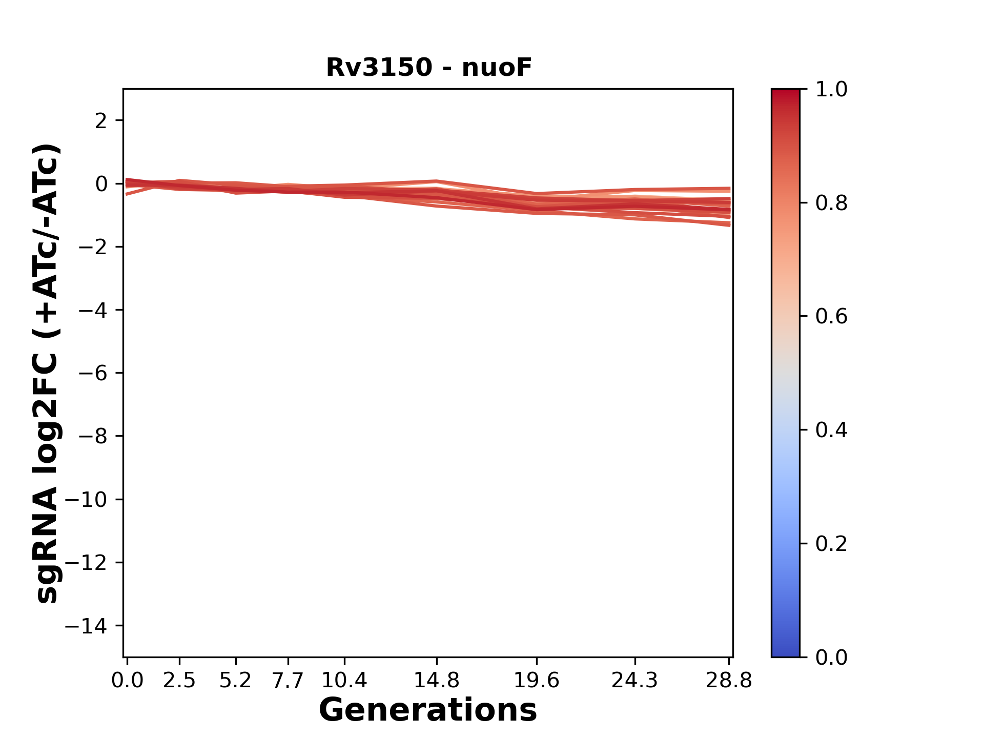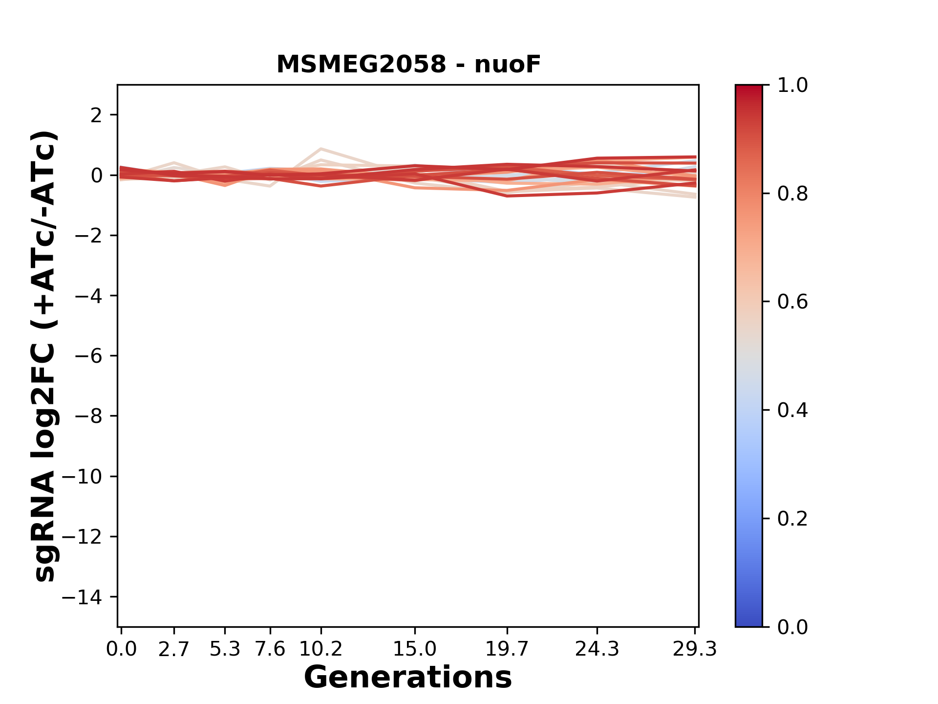 Here, we show sgRNA log2 fold-change values (L2FC) (plus versus minus ATc) over consecutive generations for sgRNAs targeting the gene you selected.