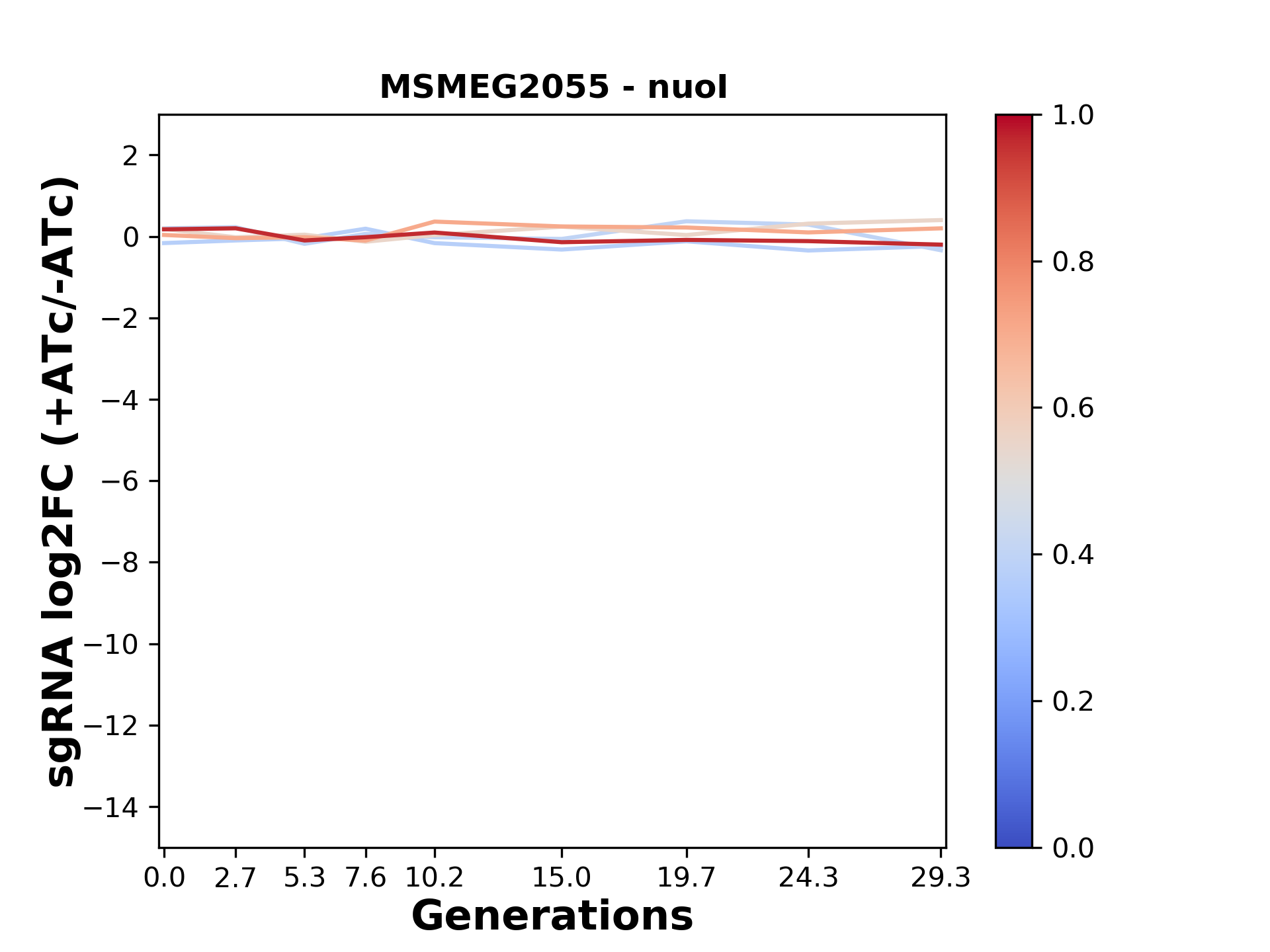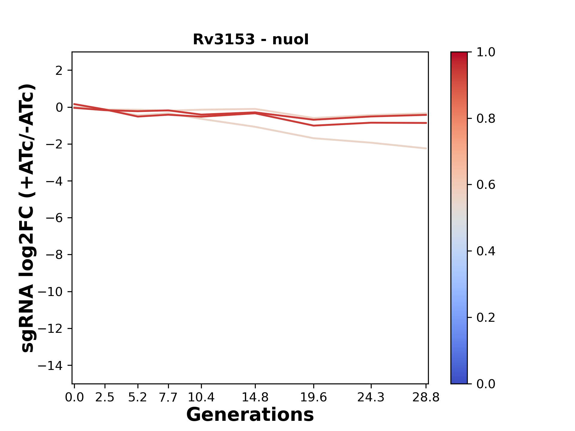 Experiment: We designed an M. tuberculosis CRISPRi library (RLC12) to target all annotated Mtb genes with single guide RNAs (sgRNAs) of varying predicted knockdown efficiencies. In parallel, we constructed a M. smegmatis CRISPRi library (RLC11) to target all annotated Msmeg genes, similar to the Mtb sgRNA library. RLC12 was transformed into M. tuberculosis H37Rv; RLC11 into M. smegmatis mc2-155. We passaged both CRISPRi libraries for nearly 30 generations in the presence or absence of the CRISPRi-inducer anhydrotetracycline (ATc). At the indicated timepoints, genomic DNA was harvested and the representation of individual sgRNAs was counted using Illumina sequencing. Here, we show sgRNA log2 fold-change values (L2FC) (plus versus minus ATc) over consecutive generations for sgRNAs targeting the gene you selected. sgRNAs are color-coded based on their predicted strength from blue (strength=0; weak) to red (strength=1; strong).