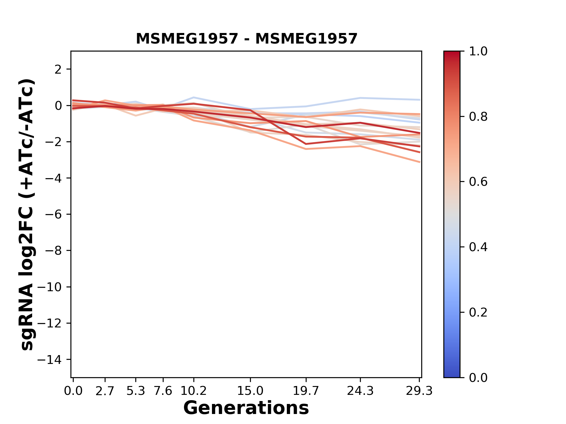 Here, we show sgRNA log2 fold-change values (L2FC) (plus versus minus ATc) over consecutive generations for sgRNAs targeting the gene you selected.