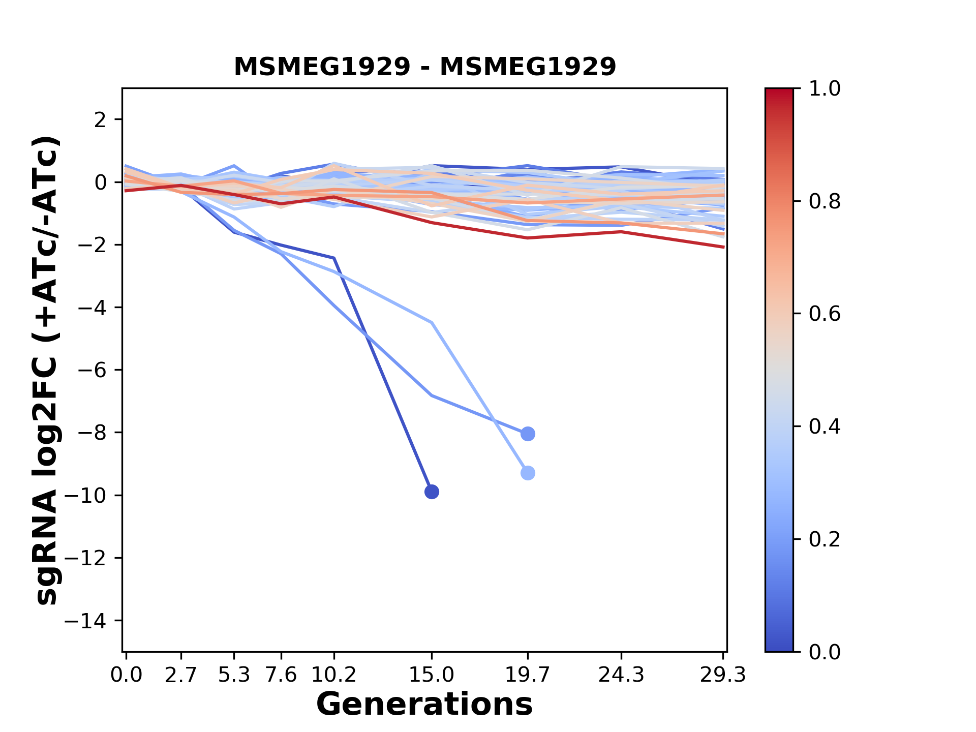 Here, we show sgRNA log2 fold-change values (L2FC) (plus versus minus ATc) over consecutive generations for sgRNAs targeting the gene you selected.