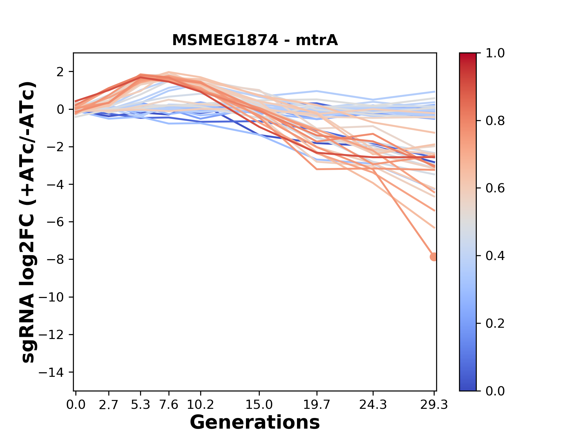 Here, we show sgRNA log2 fold-change values (L2FC) (plus versus minus ATc) over consecutive generations for sgRNAs targeting the gene you selected.