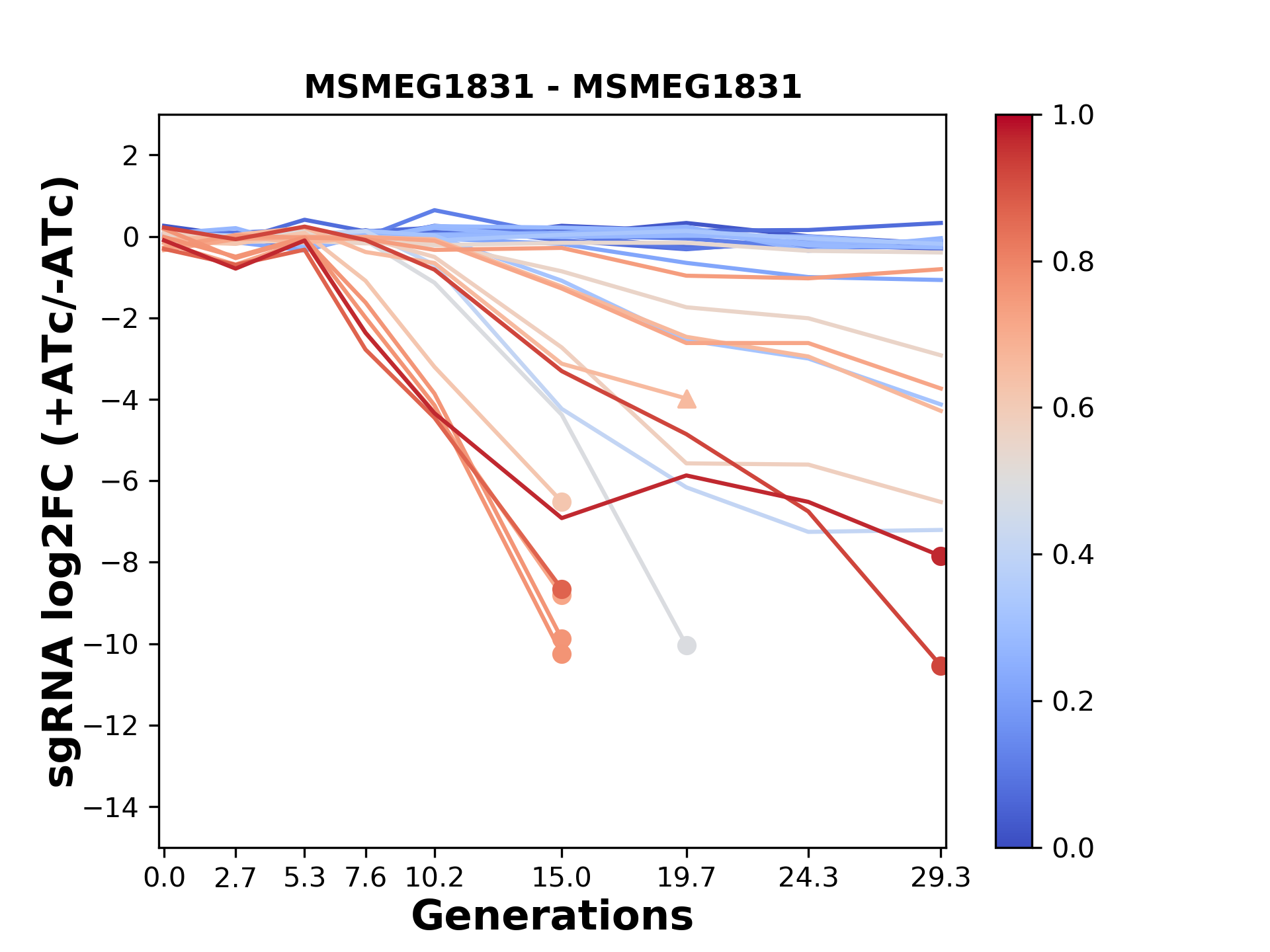 Here, we show sgRNA log2 fold-change values (L2FC) (plus versus minus ATc) over consecutive generations for sgRNAs targeting the gene you selected.