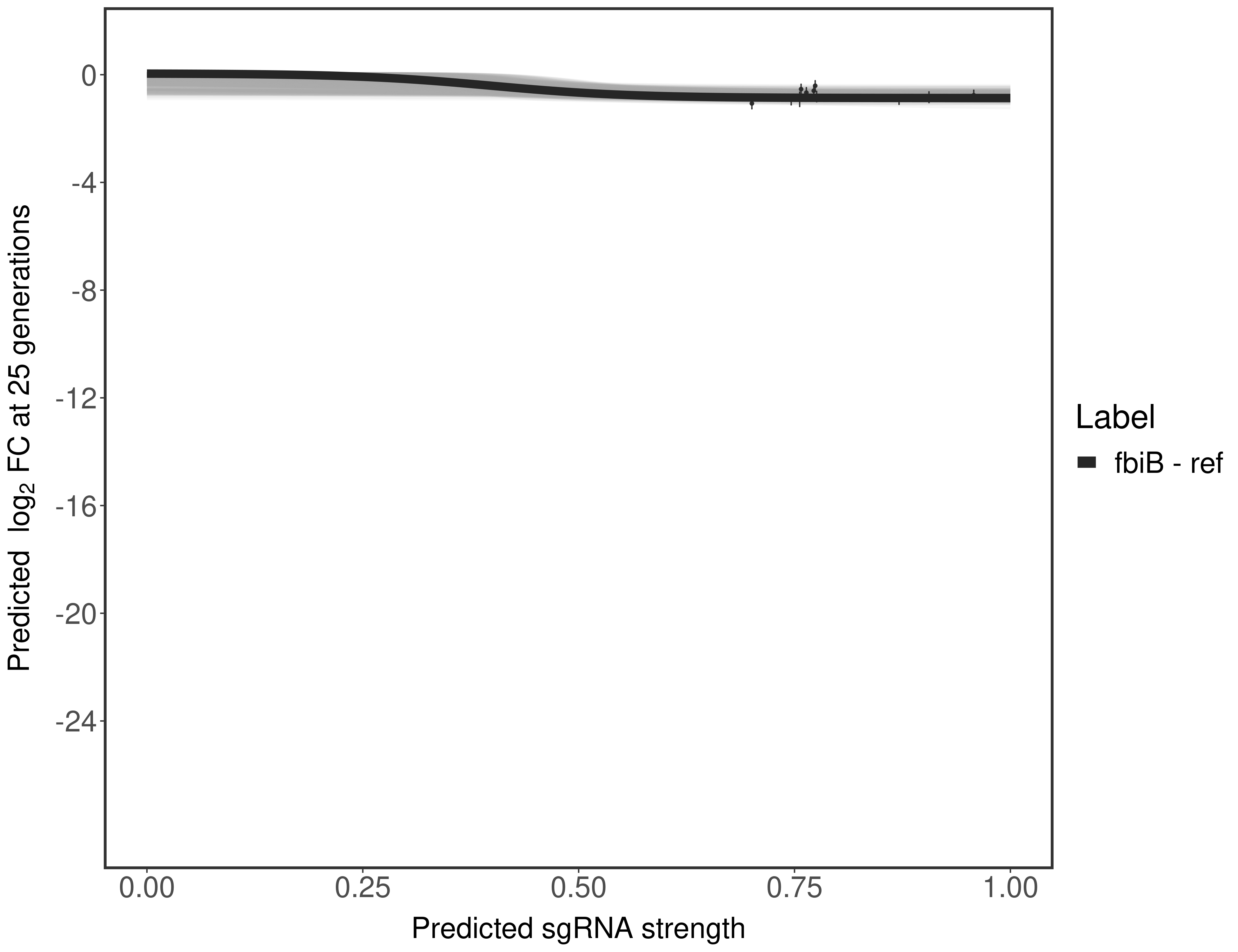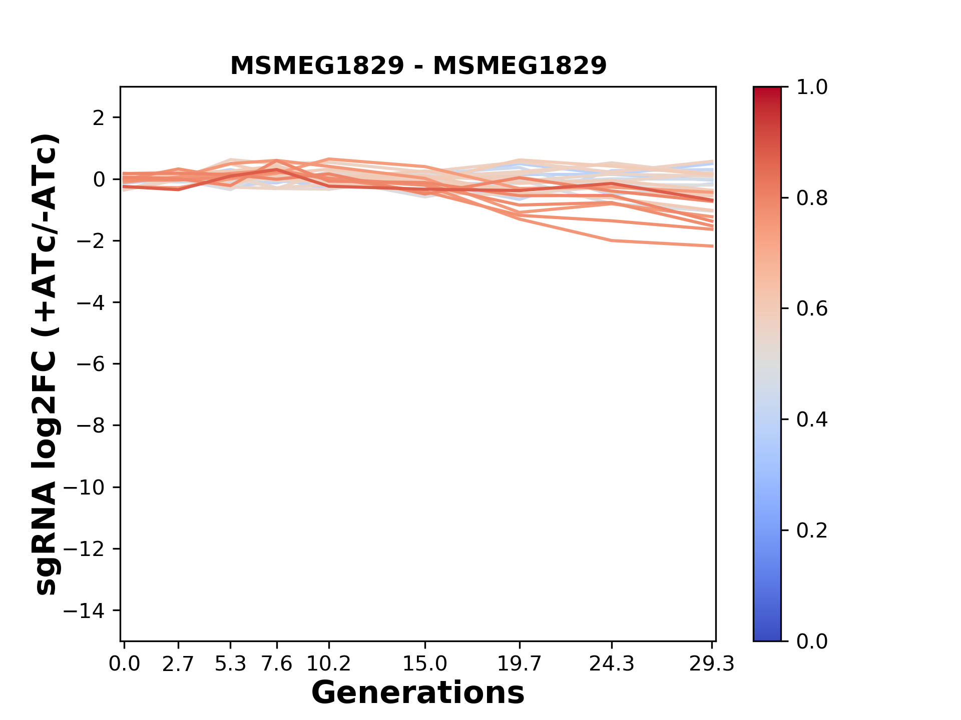 Experiment: We designed an M. tuberculosis CRISPRi library (RLC12) to target all annotated Mtb genes with single guide RNAs (sgRNAs) of varying predicted knockdown efficiencies. In parallel, we constructed a M. smegmatis CRISPRi library (RLC11) to target all annotated Msmeg genes, similar to the Mtb sgRNA library. RLC12 was transformed into M. tuberculosis H37Rv; RLC11 into M. smegmatis mc2-155. We passaged both CRISPRi libraries for nearly 30 generations in the presence or absence of the CRISPRi-inducer anhydrotetracycline (ATc). At the indicated timepoints, genomic DNA was harvested and the representation of individual sgRNAs was counted using Illumina sequencing. Here, we show sgRNA log2 fold-change values (L2FC) (plus versus minus ATc) over consecutive generations for sgRNAs targeting the gene you selected. sgRNAs are color-coded based on their predicted strength from blue (strength=0; weak) to red (strength=1; strong).