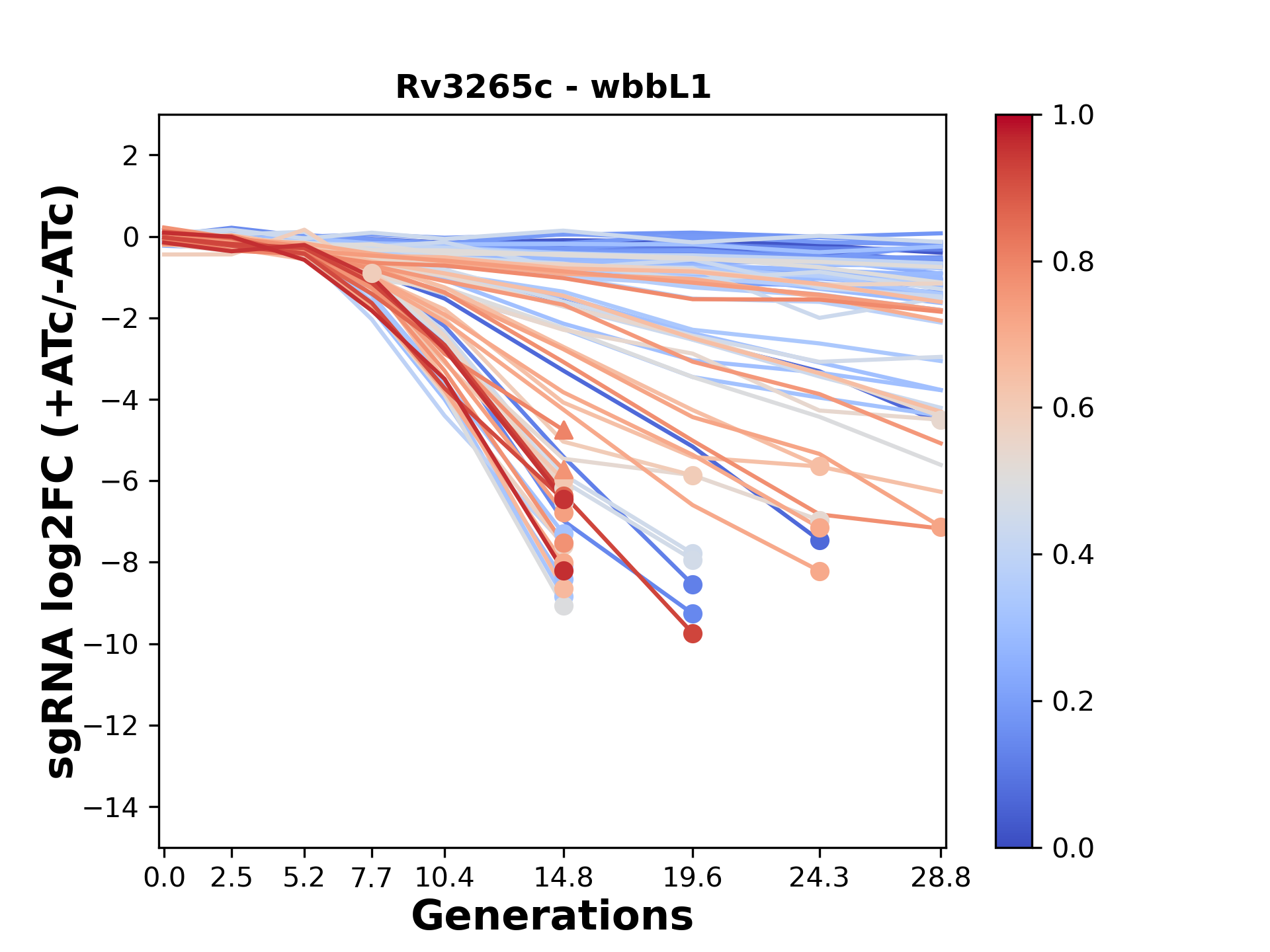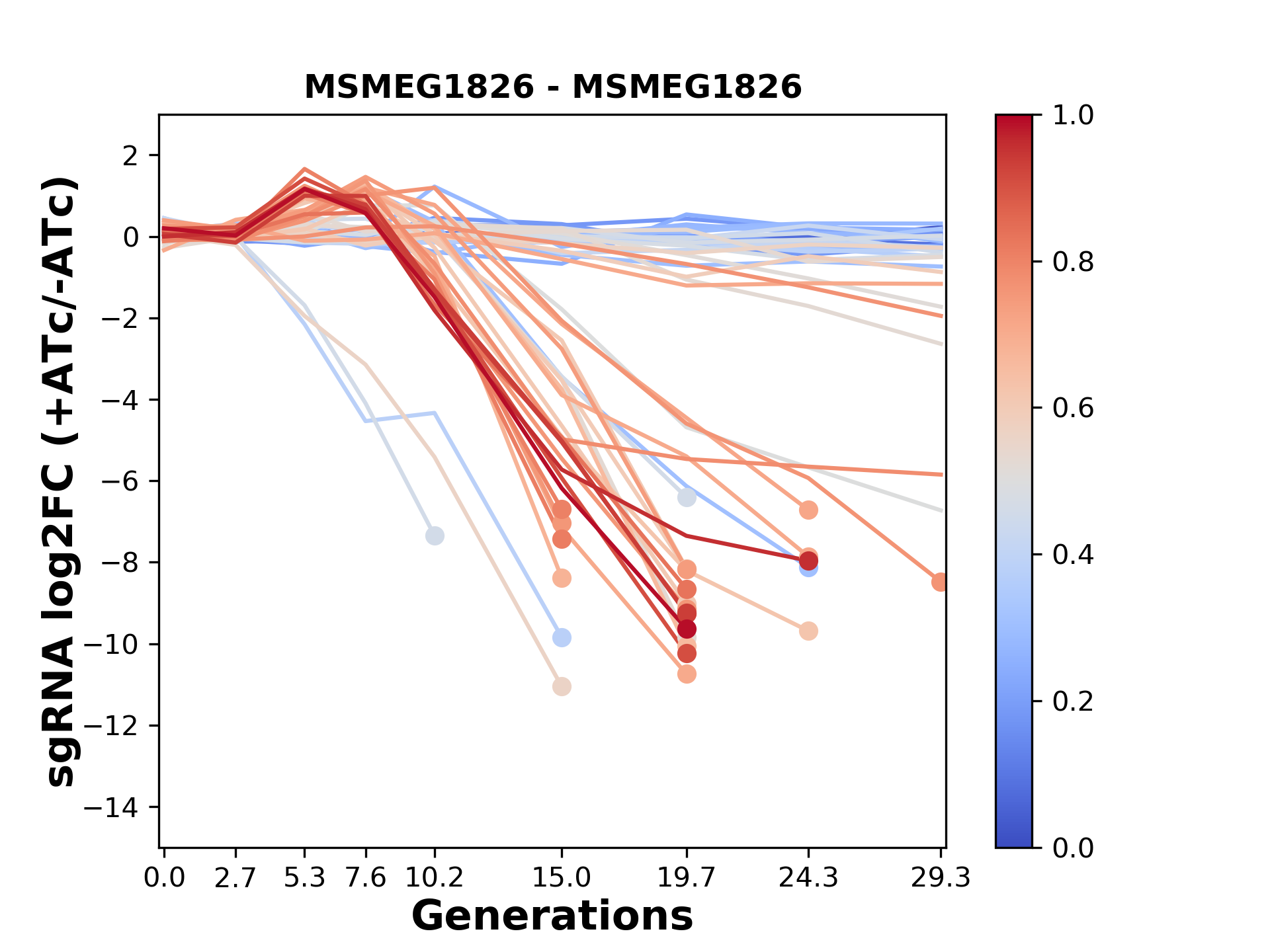 Here, we show sgRNA log2 fold-change values (L2FC) (plus versus minus ATc) over consecutive generations for sgRNAs targeting the gene you selected.