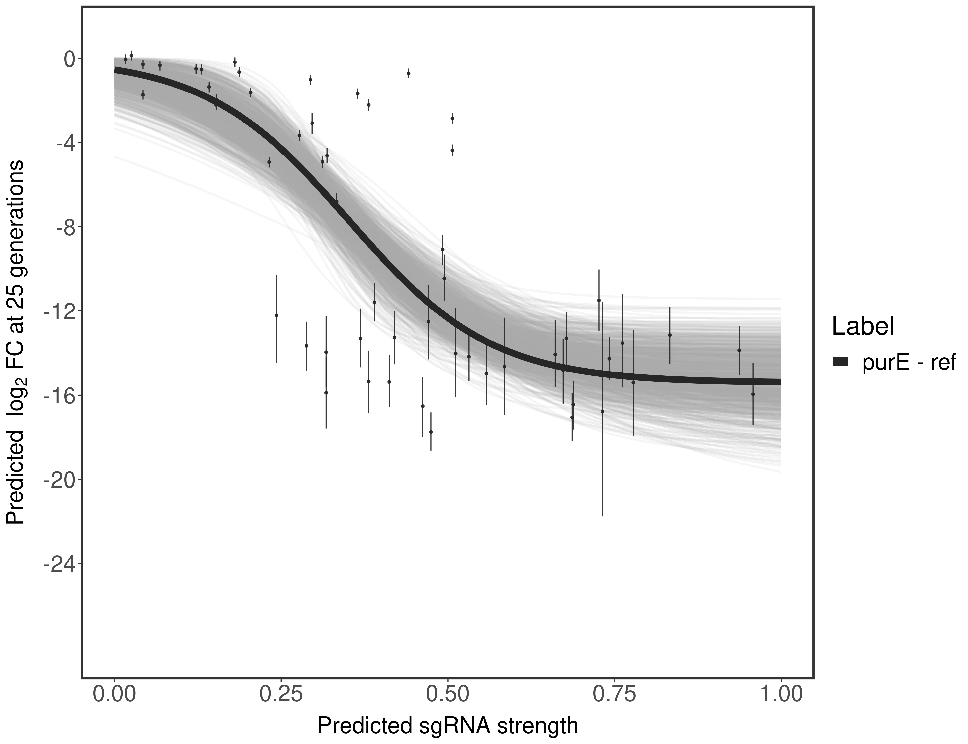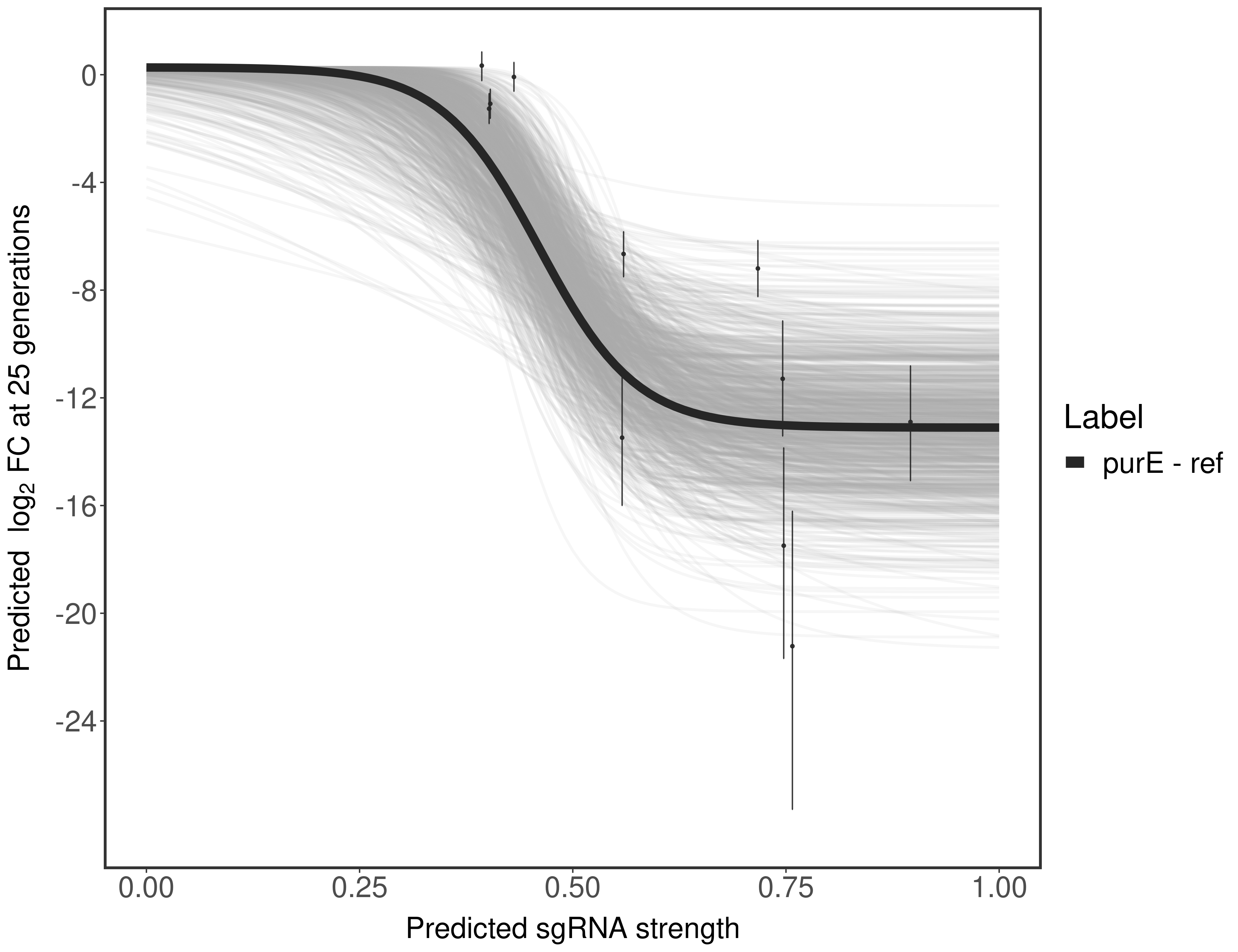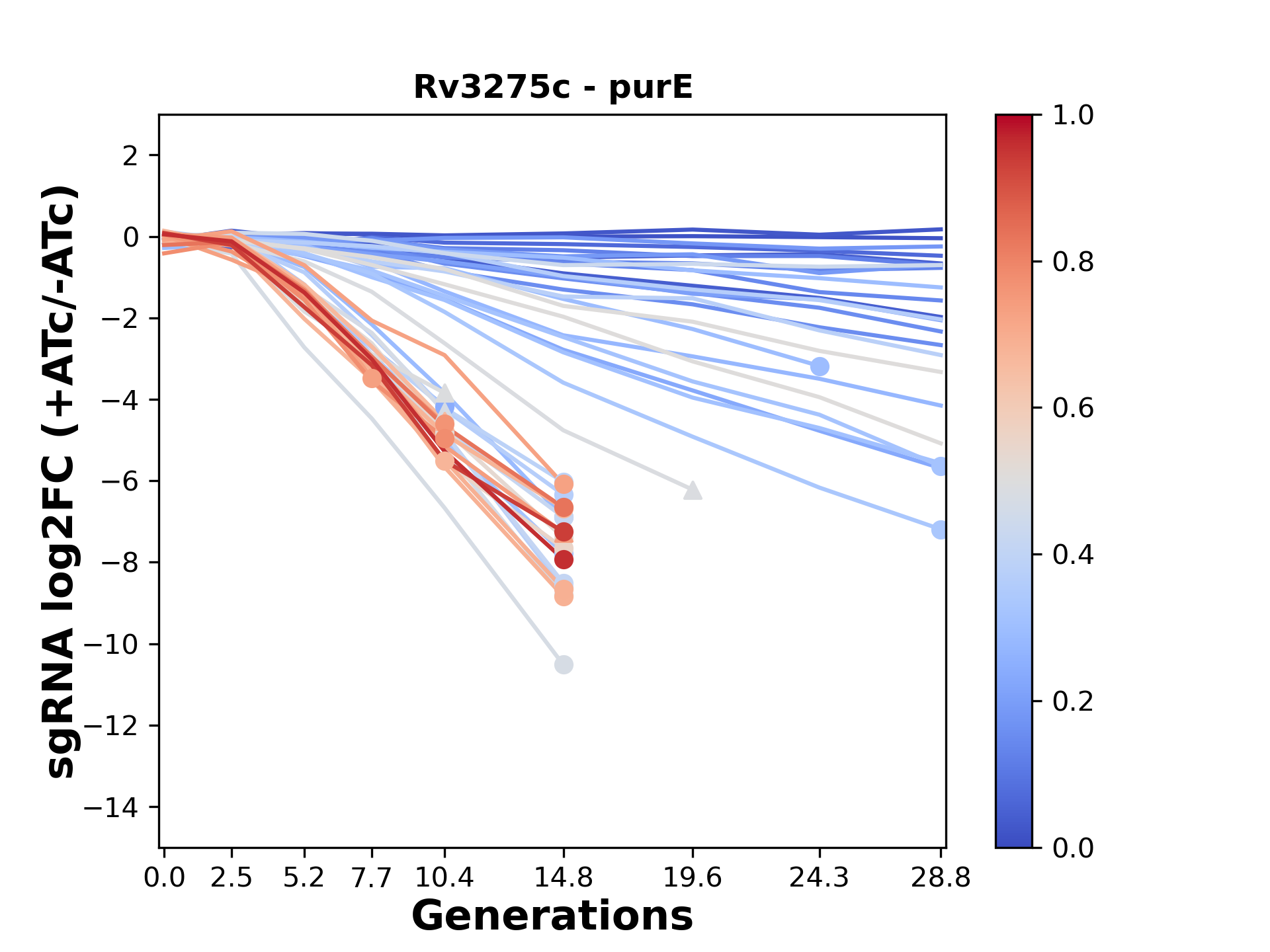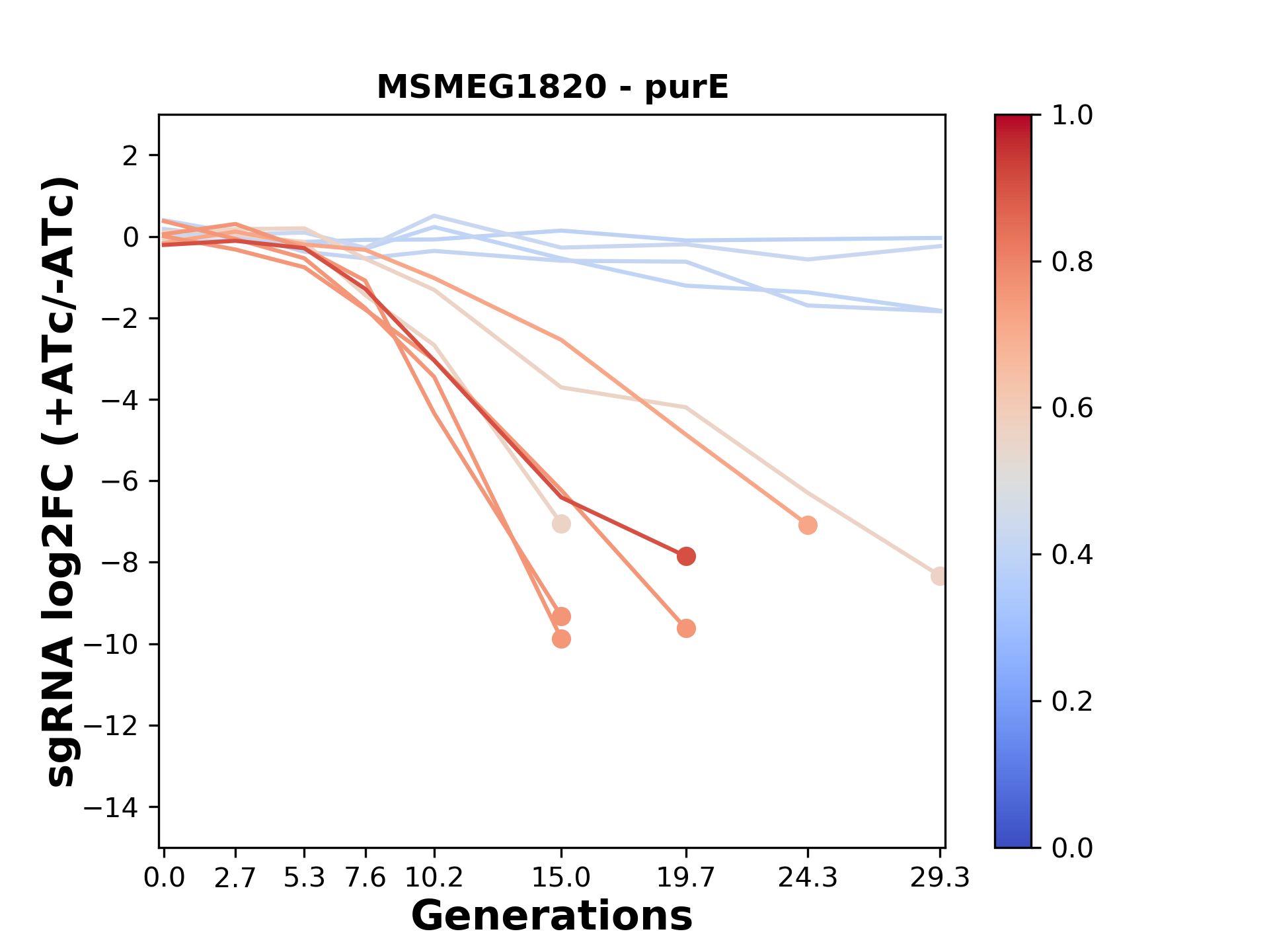 Here, we show sgRNA log2 fold-change values (L2FC) (plus versus minus ATc) over consecutive generations for sgRNAs targeting the gene you selected.