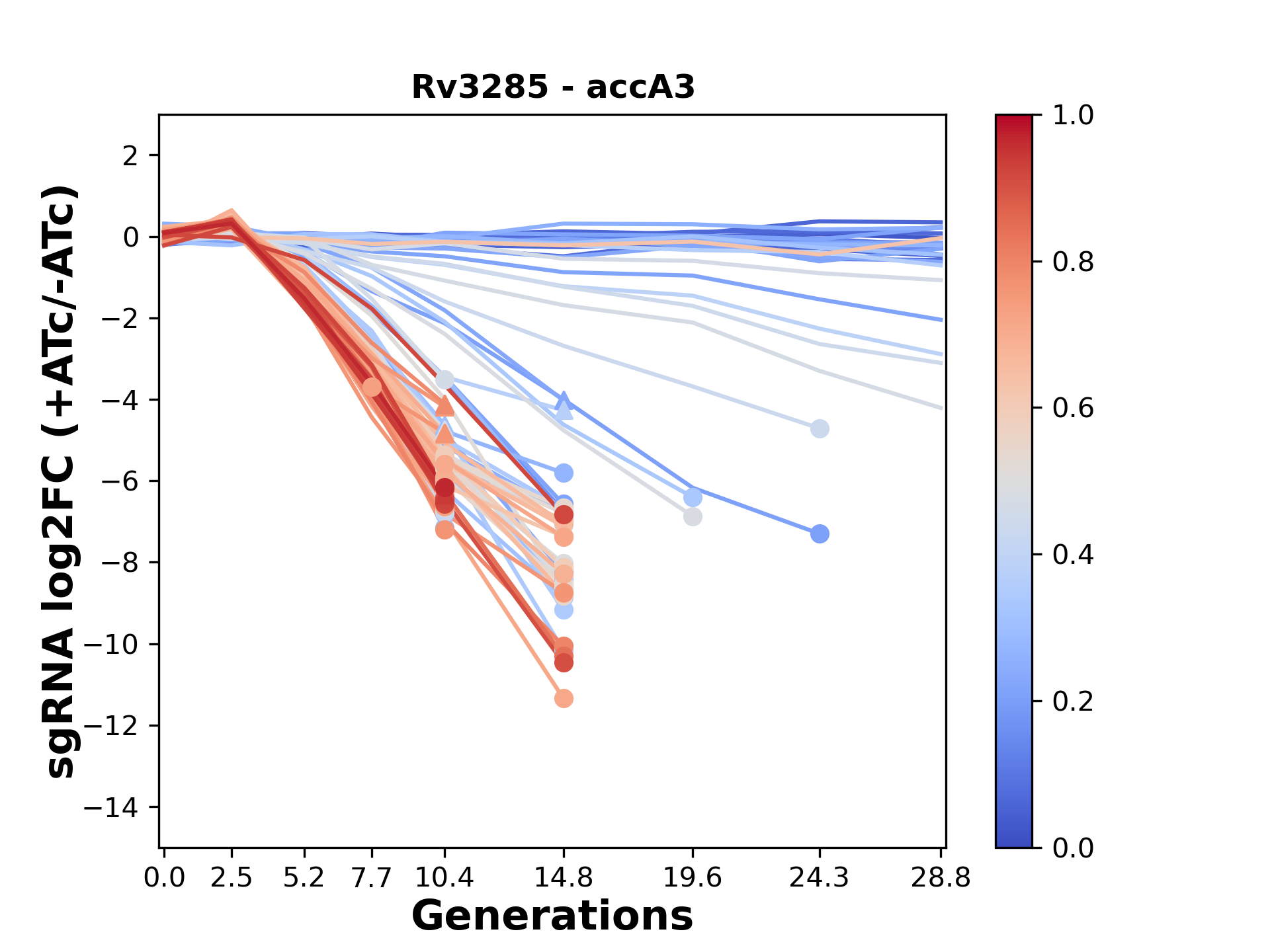 Here, we show sgRNA log2 fold-change values (L2FC) (plus versus minus ATc) over consecutive generations for sgRNAs targeting the gene you selected.