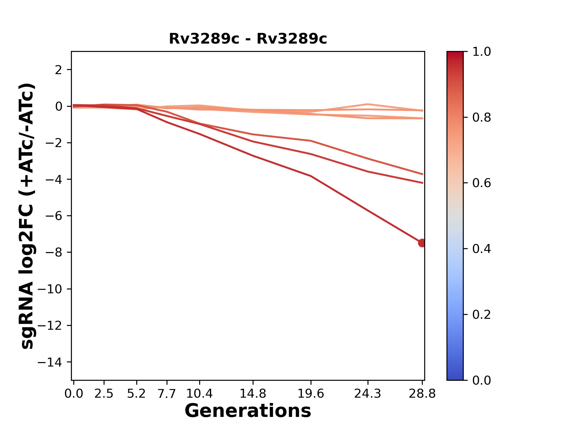 Here, we show sgRNA log2 fold-change values (L2FC) (plus versus minus ATc) over consecutive generations for sgRNAs targeting the gene you selected.