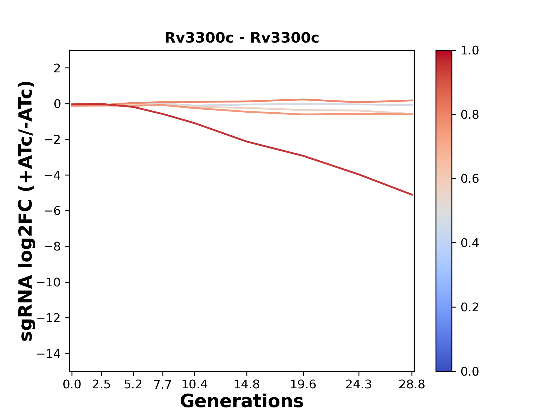 Here, we show sgRNA log2 fold-change values (L2FC) (plus versus minus ATc) over consecutive generations for sgRNAs targeting the gene you selected.