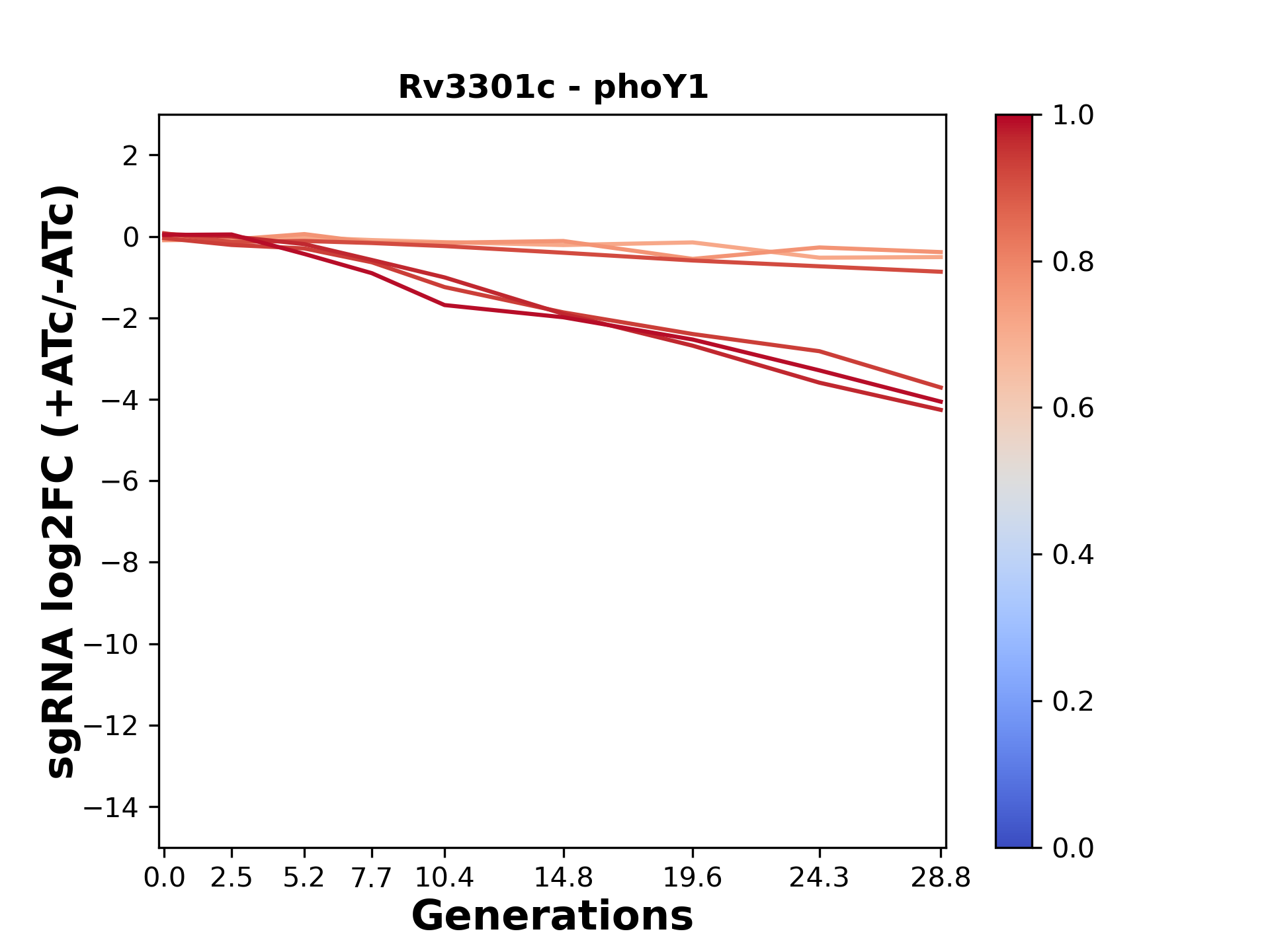 Here, we show sgRNA log2 fold-change values (L2FC) (plus versus minus ATc) over consecutive generations for sgRNAs targeting the gene you selected.