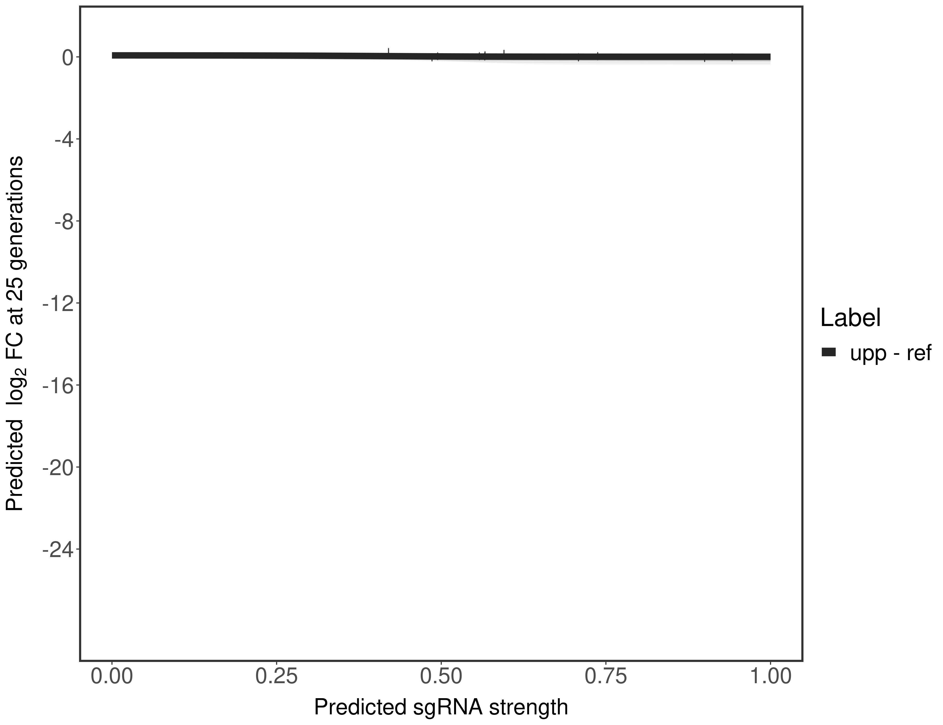 Experiment: We designed an M. tuberculosis CRISPRi library (RLC12) to target all annotated Mtb genes with single guide RNAs (sgRNAs) of varying predicted knockdown efficiencies. In parallel, we constructed a M. smegmatis CRISPRi library (RLC11) to target all annotated Msmeg genes, similar to the Mtb sgRNA library. RLC12 was transformed into M. tuberculosis H37Rv; RLC11 into M. smegmatis mc2-155. We passaged both CRISPRi libraries for nearly 30 generations in the presence or absence of the CRISPRi-inducer anhydrotetracycline (ATc). At the indicated timepoints, genomic DNA was harvested and the representation of individual sgRNAs was counted using Illumina sequencing. Here, we show sgRNA log2 fold-change values (L2FC) (plus versus minus ATc) over consecutive generations for sgRNAs targeting the gene you selected. sgRNAs are color-coded based on their predicted strength from blue (strength=0; weak) to red (strength=1; strong).