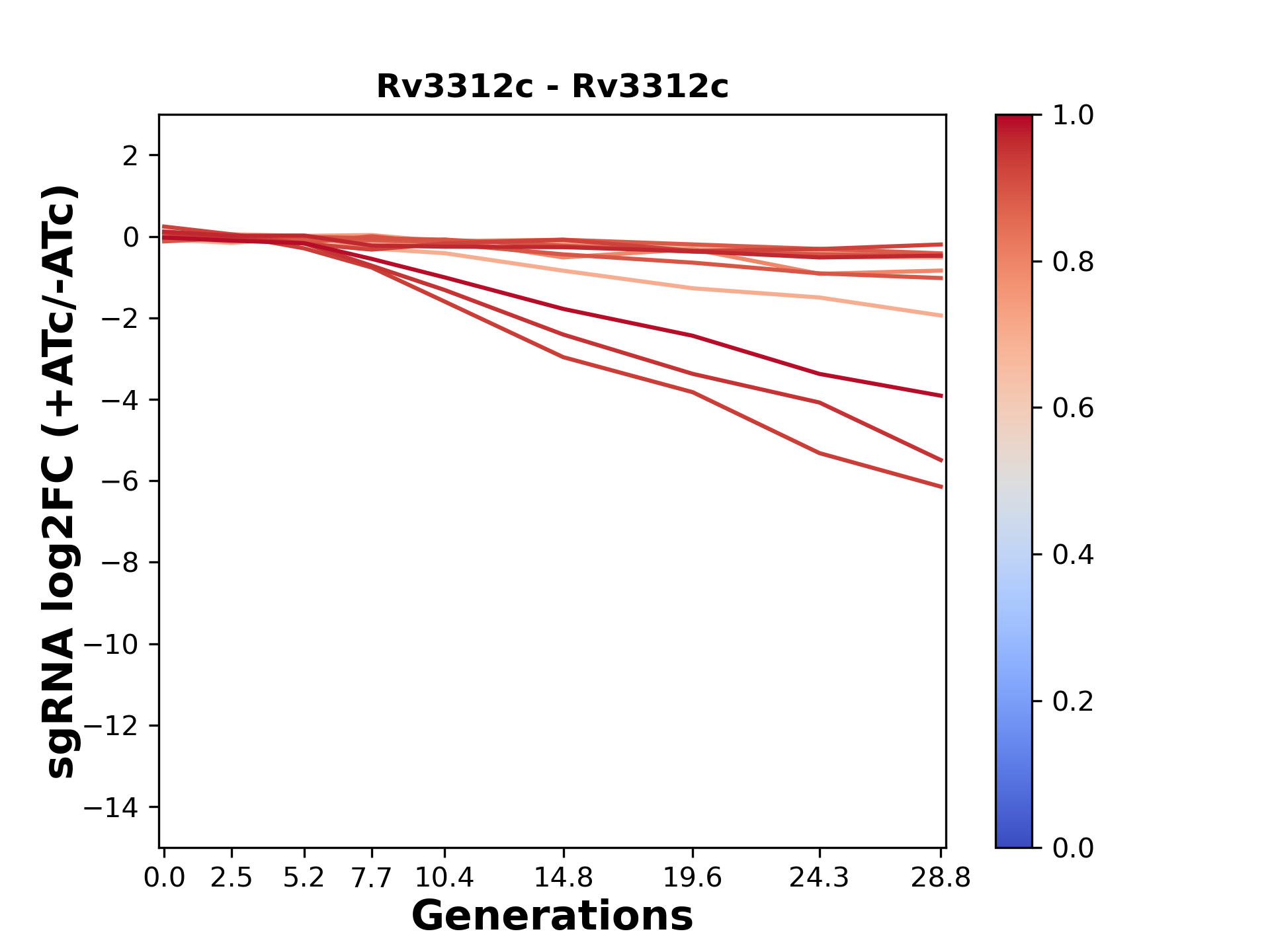 Experiment: We designed an M. tuberculosis CRISPRi library (RLC12) to target all annotated Mtb genes with single guide RNAs (sgRNAs) of varying predicted knockdown efficiencies. In parallel, we constructed a M. smegmatis CRISPRi library (RLC11) to target all annotated Msmeg genes, similar to the Mtb sgRNA library. RLC12 was transformed into M. tuberculosis H37Rv; RLC11 into M. smegmatis mc2-155. We passaged both CRISPRi libraries for nearly 30 generations in the presence or absence of the CRISPRi-inducer anhydrotetracycline (ATc). At the indicated timepoints, genomic DNA was harvested and the representation of individual sgRNAs was counted using Illumina sequencing. Here, we show sgRNA log2 fold-change values (L2FC) (plus versus minus ATc) over consecutive generations for sgRNAs targeting the gene you selected. sgRNAs are color-coded based on their predicted strength from blue (strength=0; weak) to red (strength=1; strong).
