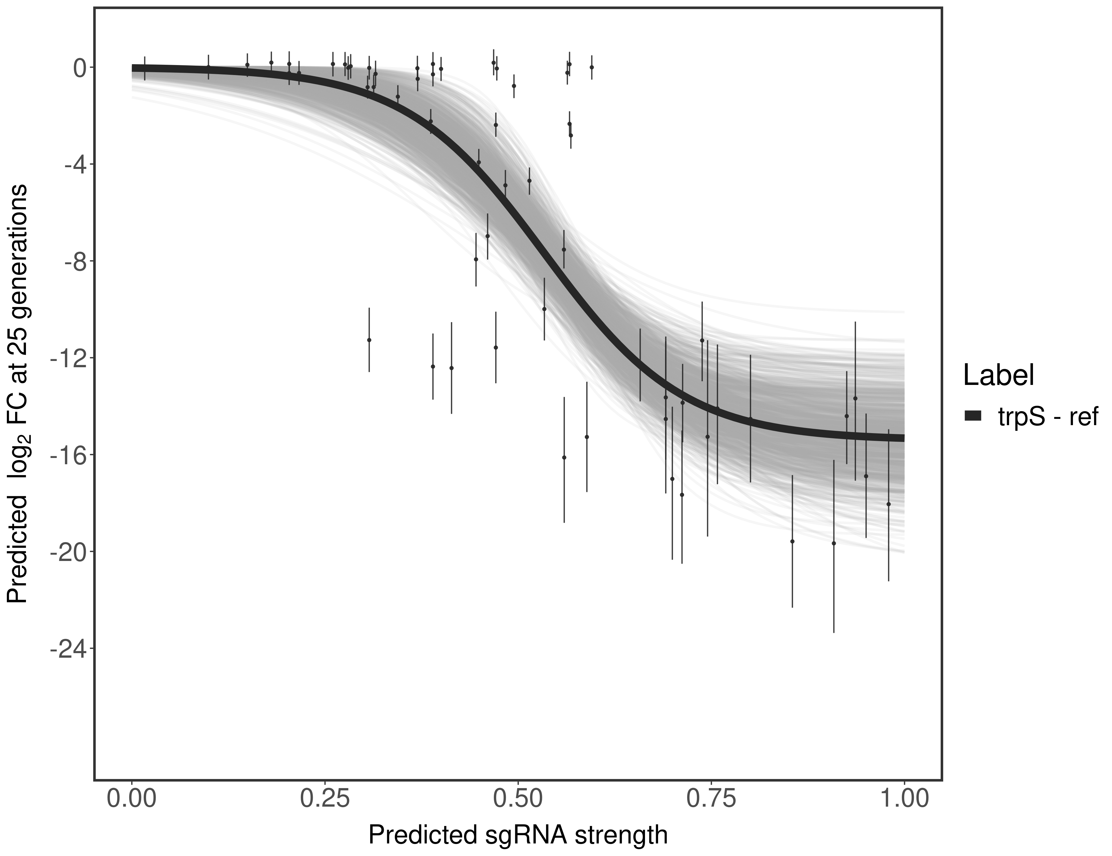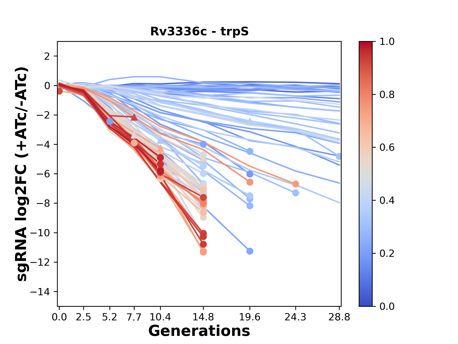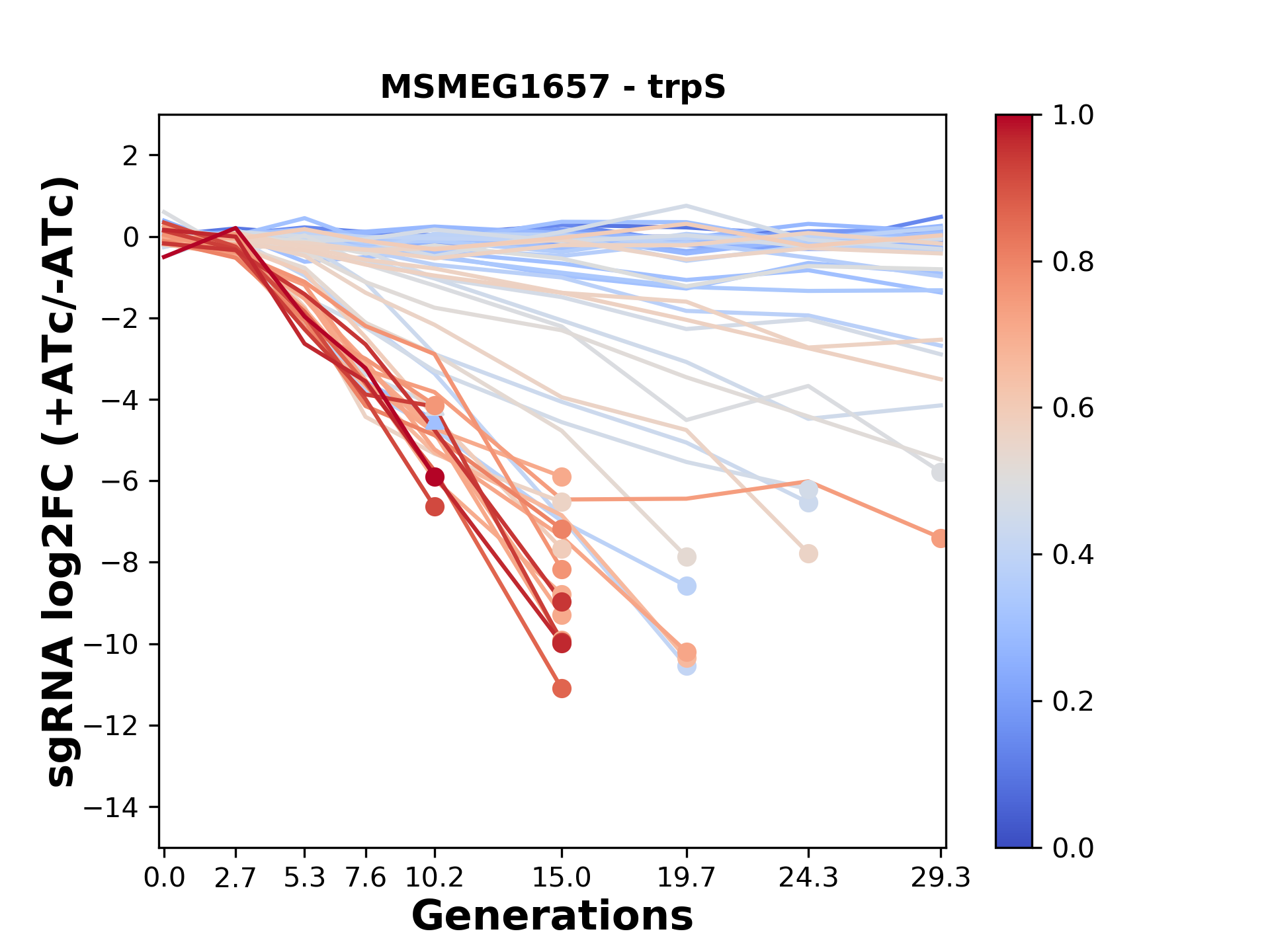 Experiment: We designed an M. tuberculosis CRISPRi library (RLC12) to target all annotated Mtb genes with single guide RNAs (sgRNAs) of varying predicted knockdown efficiencies. In parallel, we constructed a M. smegmatis CRISPRi library (RLC11) to target all annotated Msmeg genes, similar to the Mtb sgRNA library. RLC12 was transformed into M. tuberculosis H37Rv; RLC11 into M. smegmatis mc2-155. We passaged both CRISPRi libraries for nearly 30 generations in the presence or absence of the CRISPRi-inducer anhydrotetracycline (ATc). At the indicated timepoints, genomic DNA was harvested and the representation of individual sgRNAs was counted using Illumina sequencing. Here, we show sgRNA log2 fold-change values (L2FC) (plus versus minus ATc) over consecutive generations for sgRNAs targeting the gene you selected. sgRNAs are color-coded based on their predicted strength from blue (strength=0; weak) to red (strength=1; strong).