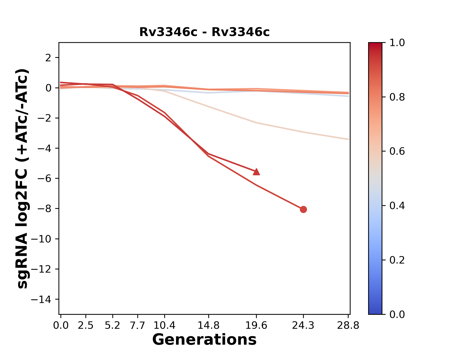 Here, we show sgRNA log2 fold-change values (L2FC) (plus versus minus ATc) over consecutive generations for sgRNAs targeting the gene you selected.