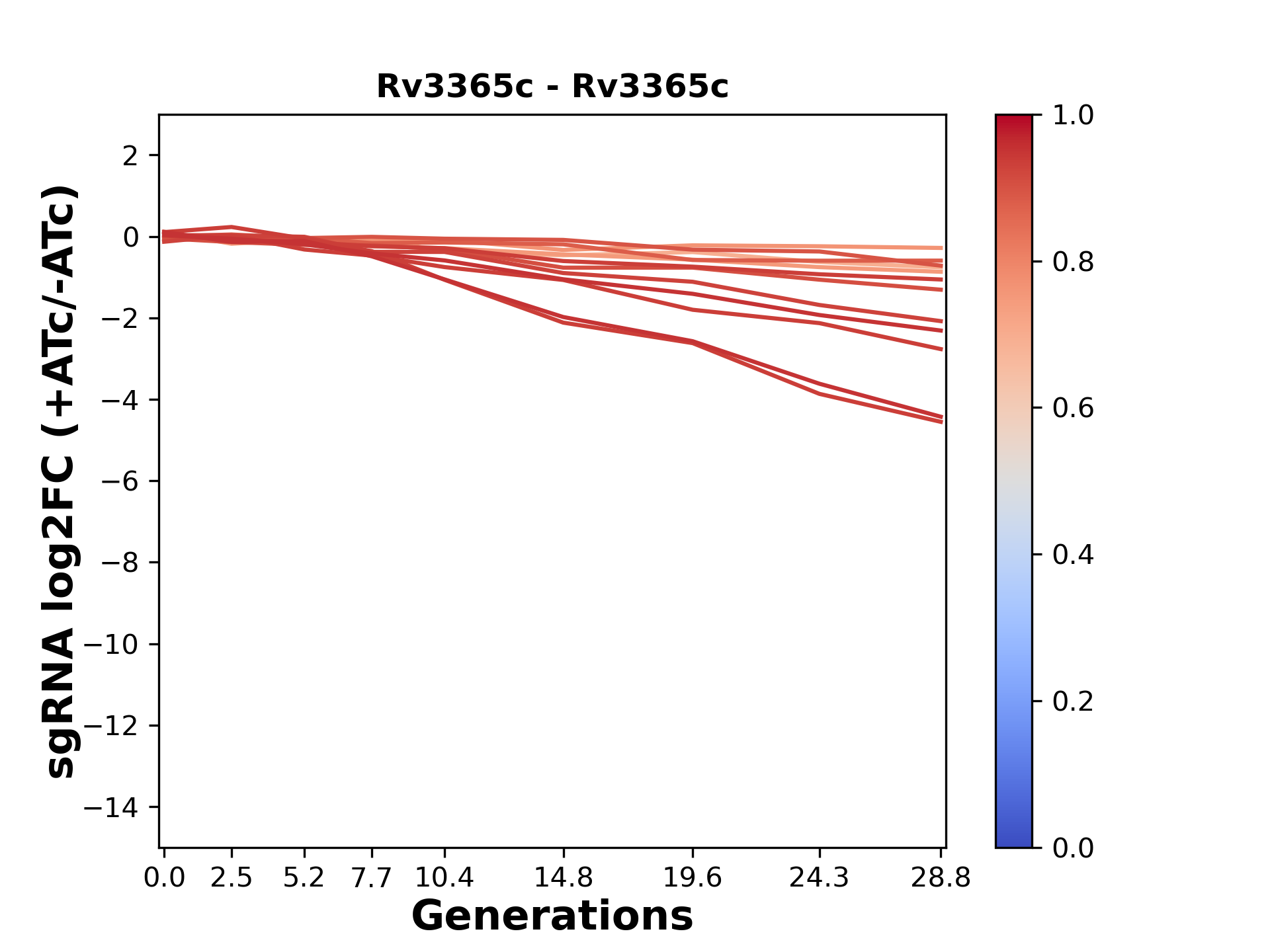 Here, we show sgRNA log2 fold-change values (L2FC) (plus versus minus ATc) over consecutive generations for sgRNAs targeting the gene you selected.