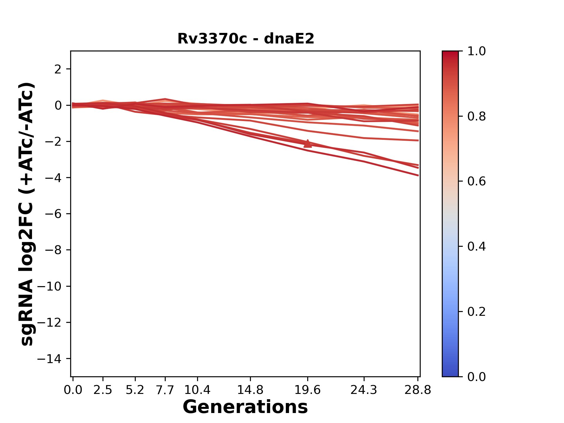 Here, we show sgRNA log2 fold-change values (L2FC) (plus versus minus ATc) over consecutive generations for sgRNAs targeting the gene you selected.