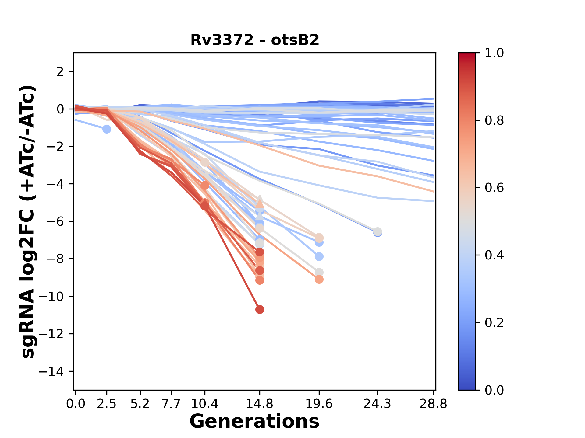 Here, we show sgRNA log2 fold-change values (L2FC) (plus versus minus ATc) over consecutive generations for sgRNAs targeting the gene you selected.