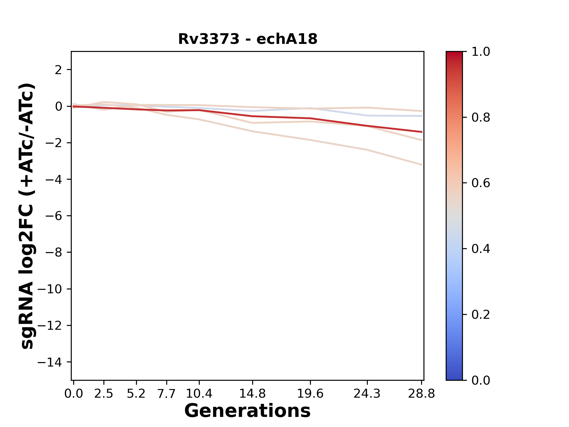 Here, we show sgRNA log2 fold-change values (L2FC) (plus versus minus ATc) over consecutive generations for sgRNAs targeting the gene you selected.