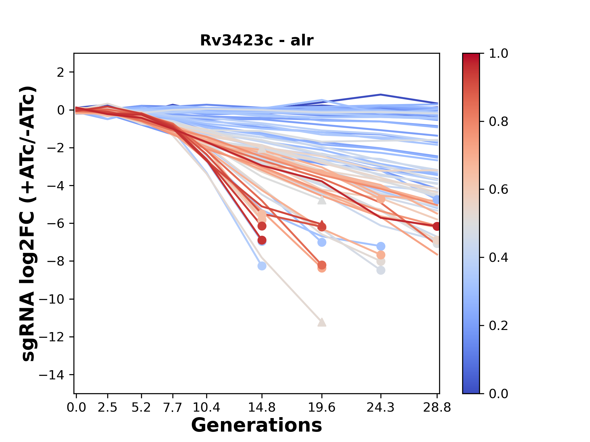 Here, we show sgRNA log2 fold-change values (L2FC) (plus versus minus ATc) over consecutive generations for sgRNAs targeting the gene you selected.