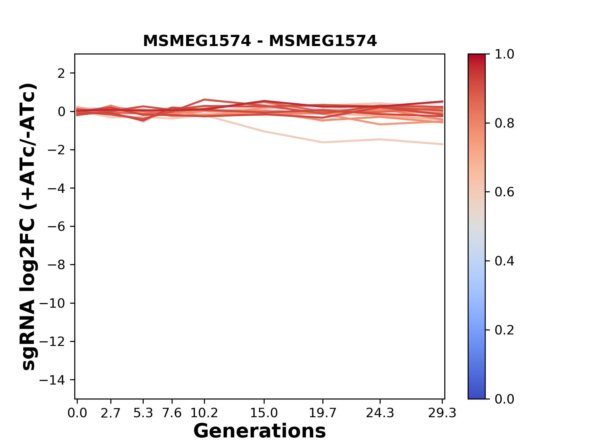 Experiment: We designed an M. tuberculosis CRISPRi library (RLC12) to target all annotated Mtb genes with single guide RNAs (sgRNAs) of varying predicted knockdown efficiencies. In parallel, we constructed a M. smegmatis CRISPRi library (RLC11) to target all annotated Msmeg genes, similar to the Mtb sgRNA library. RLC12 was transformed into M. tuberculosis H37Rv; RLC11 into M. smegmatis mc2-155. We passaged both CRISPRi libraries for nearly 30 generations in the presence or absence of the CRISPRi-inducer anhydrotetracycline (ATc). At the indicated timepoints, genomic DNA was harvested and the representation of individual sgRNAs was counted using Illumina sequencing. Here, we show sgRNA log2 fold-change values (L2FC) (plus versus minus ATc) over consecutive generations for sgRNAs targeting the gene you selected. sgRNAs are color-coded based on their predicted strength from blue (strength=0; weak) to red (strength=1; strong).