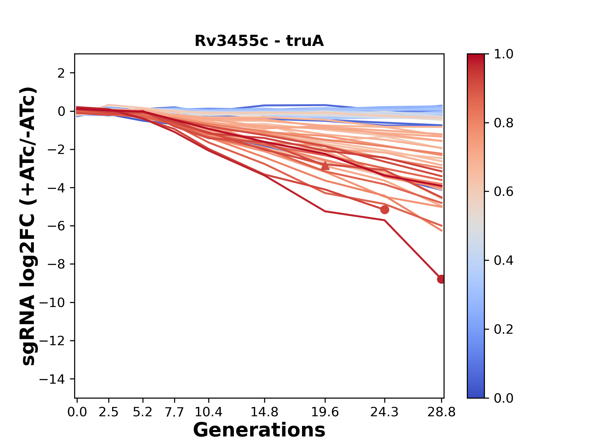 Here, we show sgRNA log2 fold-change values (L2FC) (plus versus minus ATc) over consecutive generations for sgRNAs targeting the gene you selected.