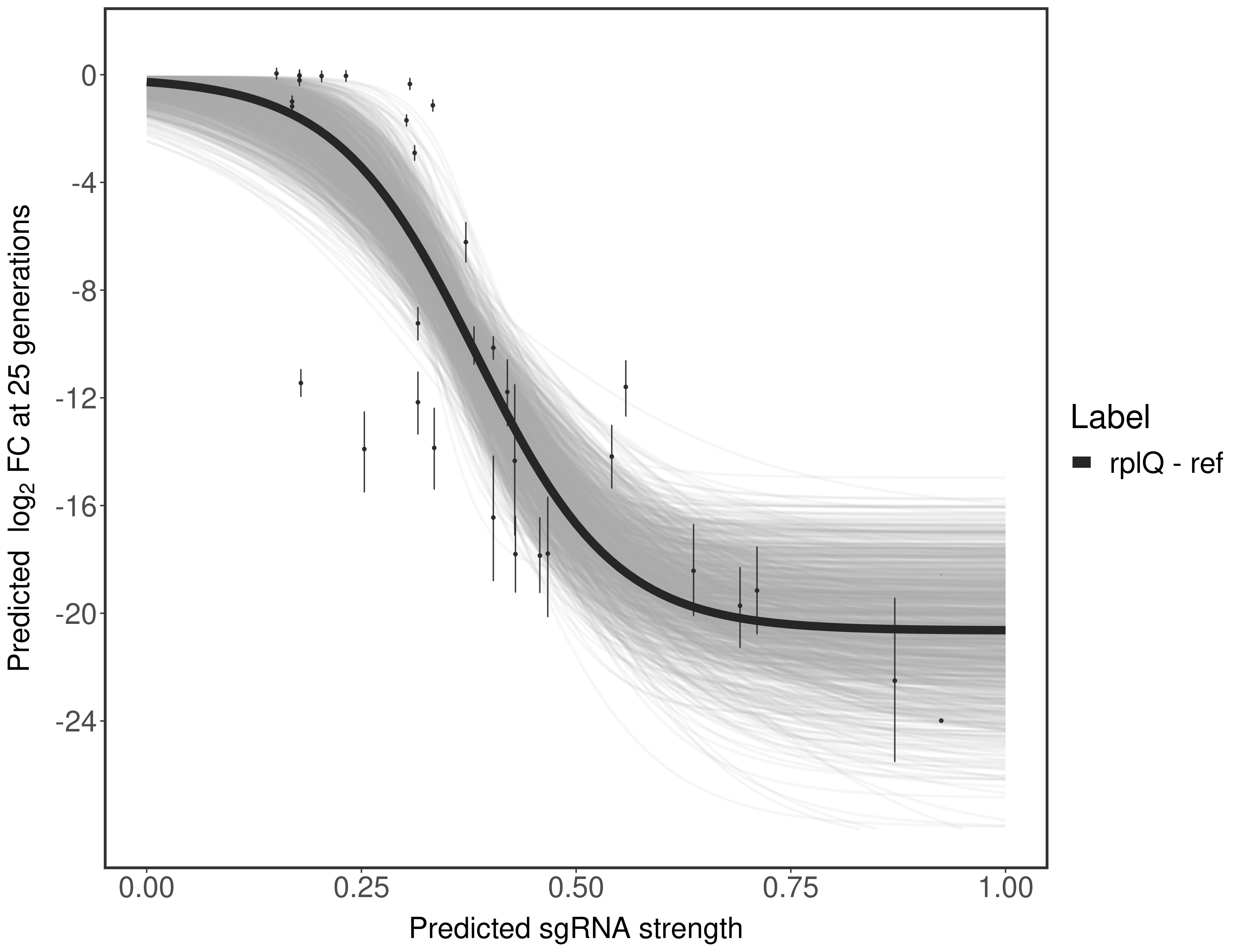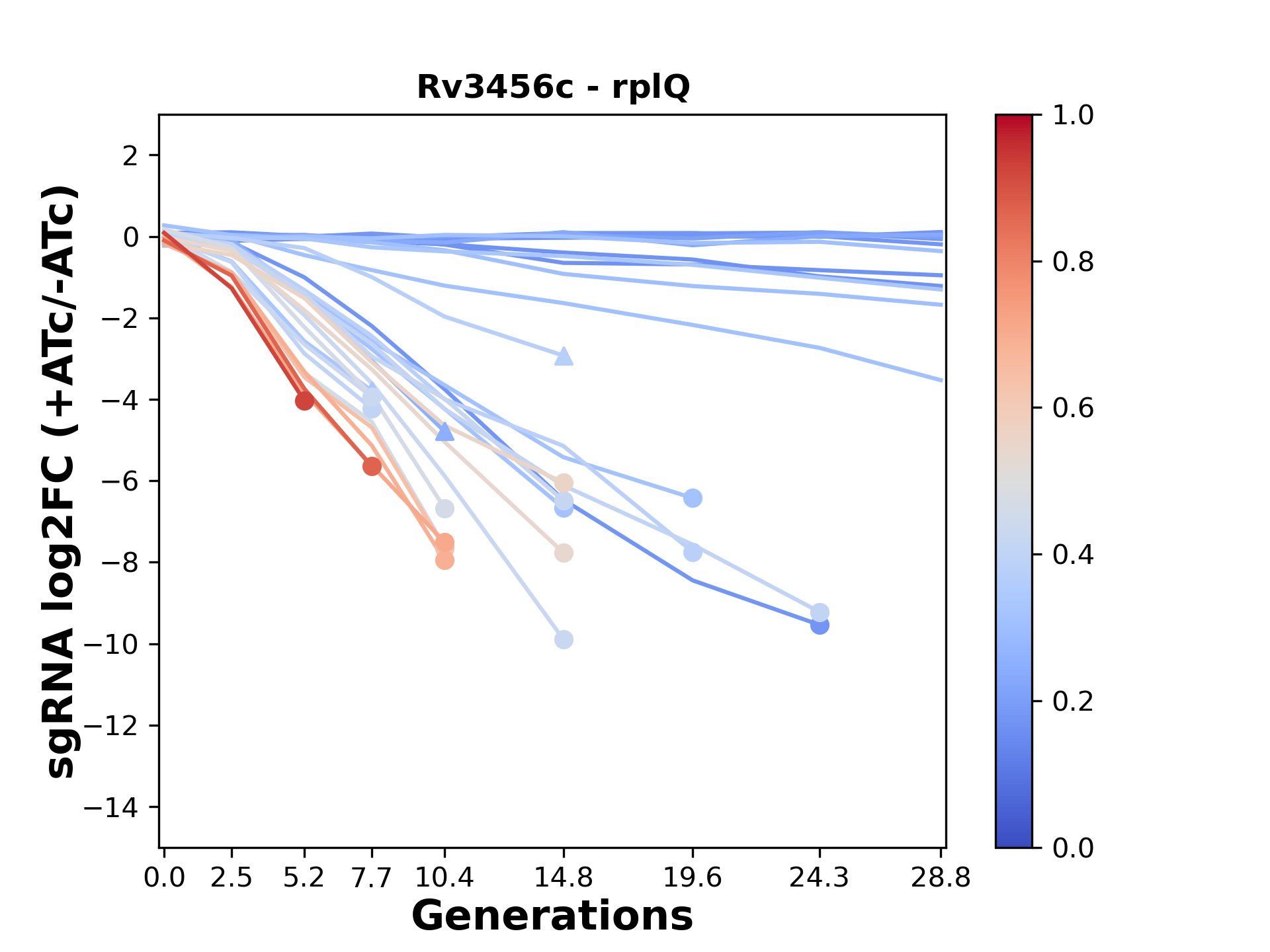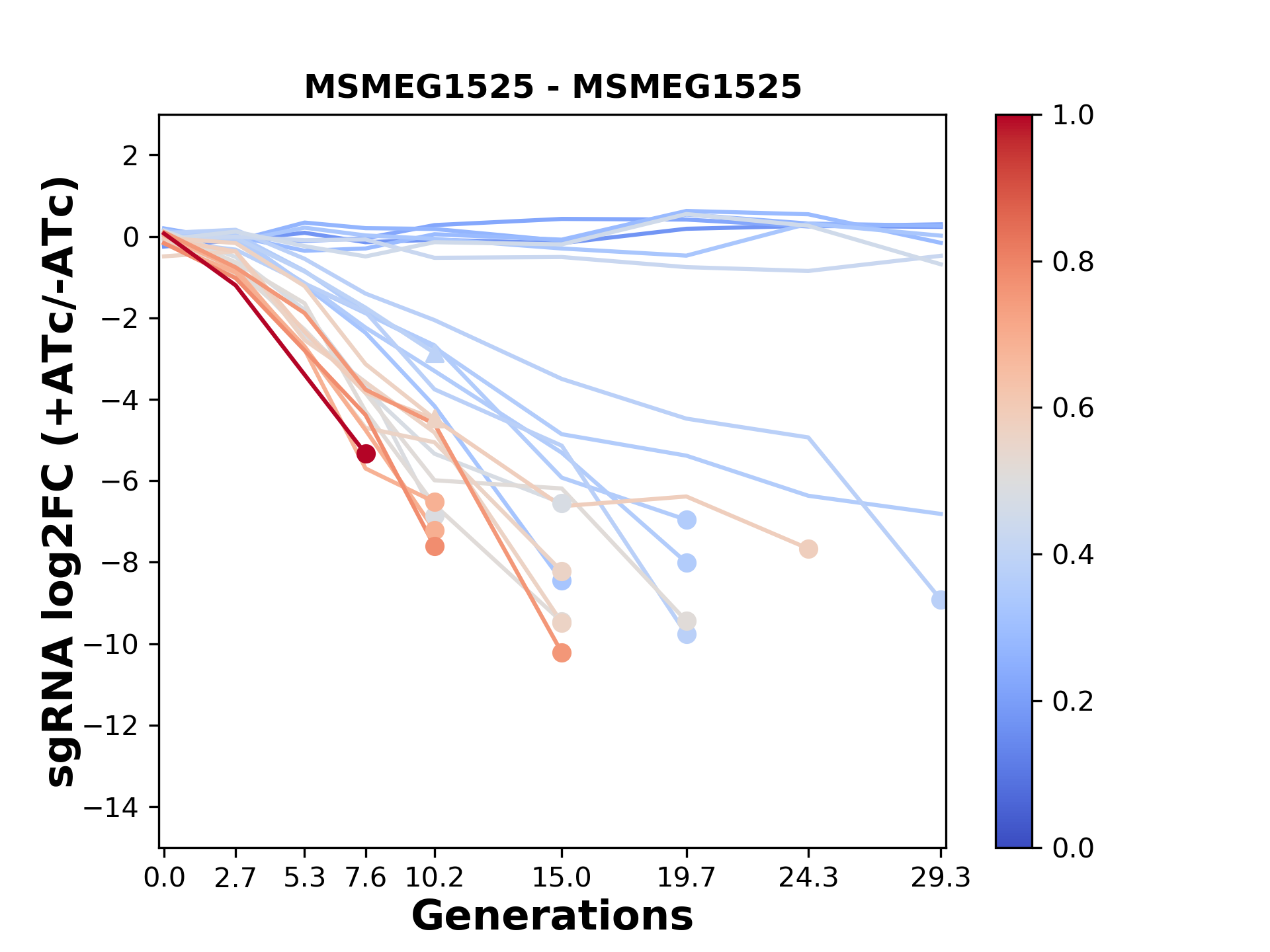 Here, we show sgRNA log2 fold-change values (L2FC) (plus versus minus ATc) over consecutive generations for sgRNAs targeting the gene you selected.